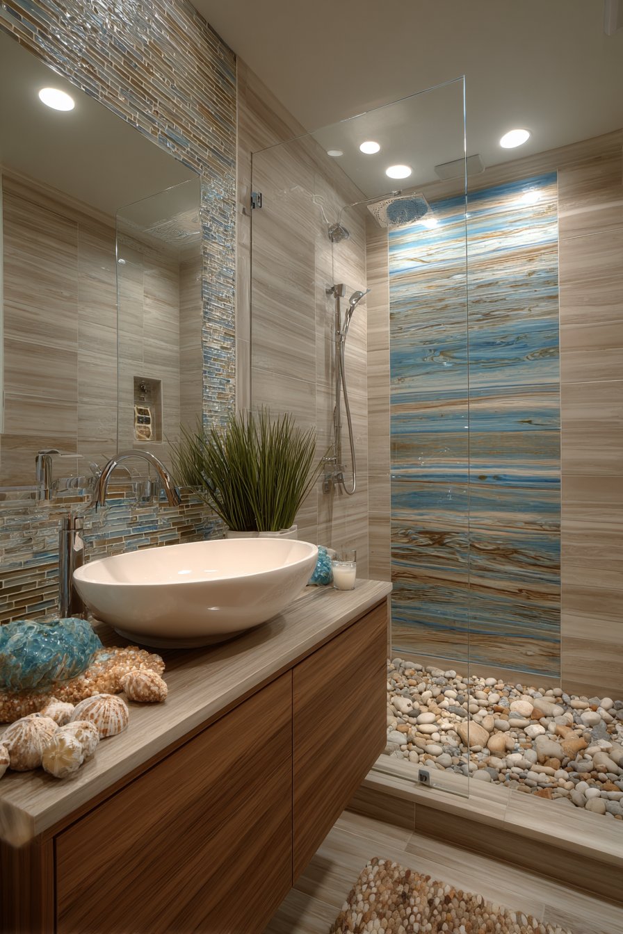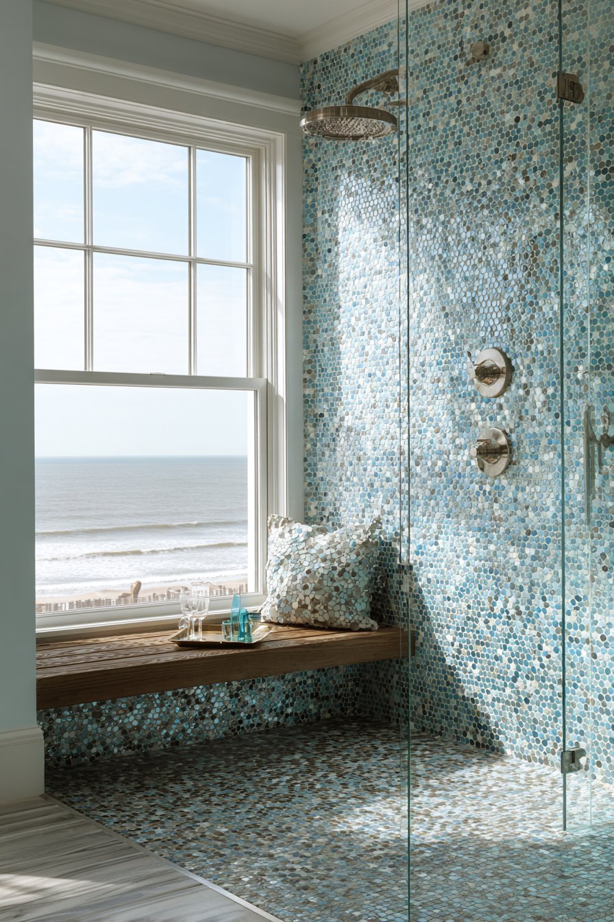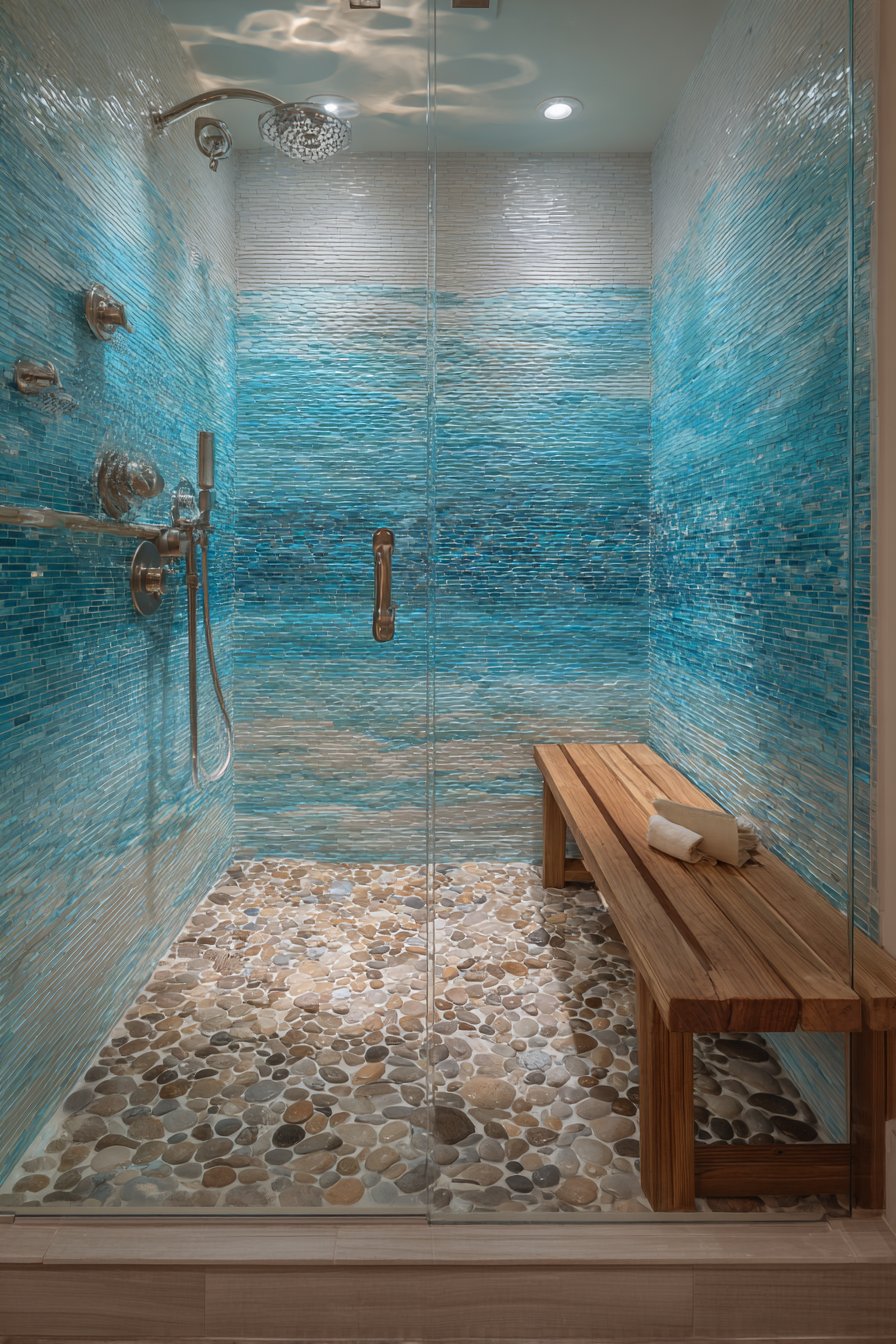 - Install a glass mosaic accent wall in graduated ocean blues to serve as a dramatic focal point