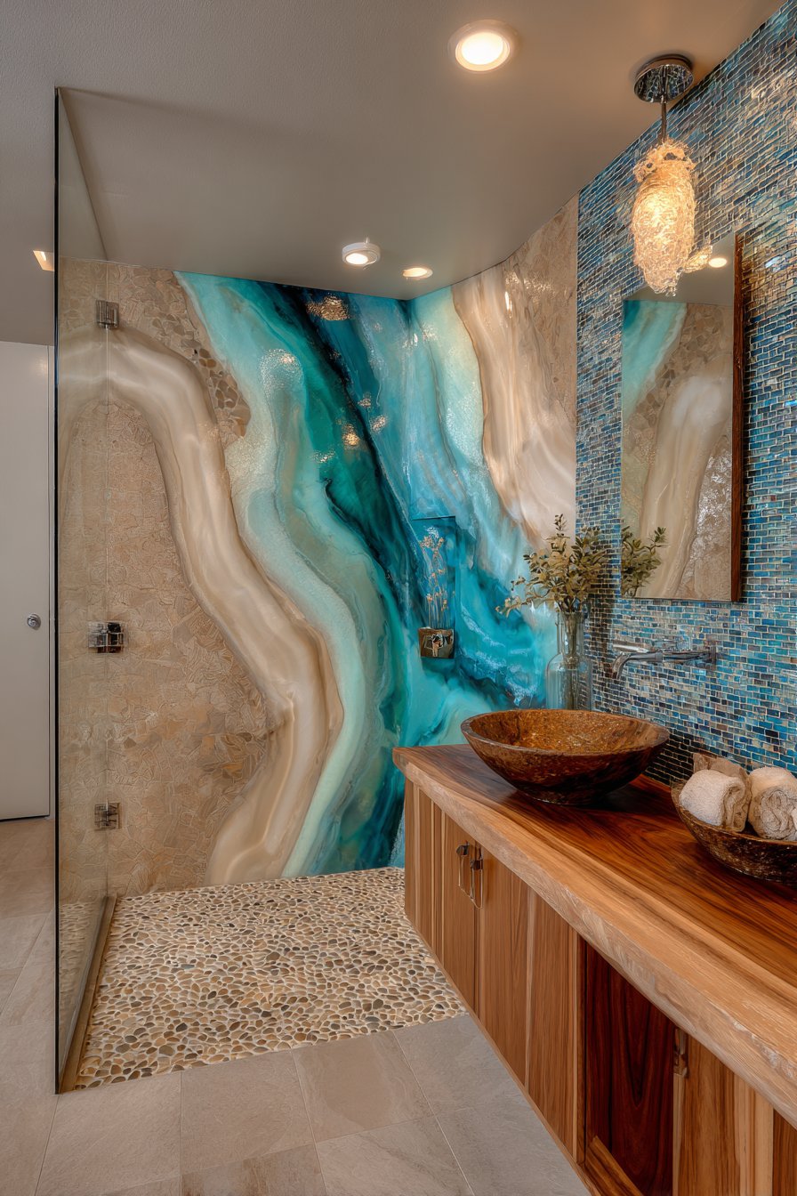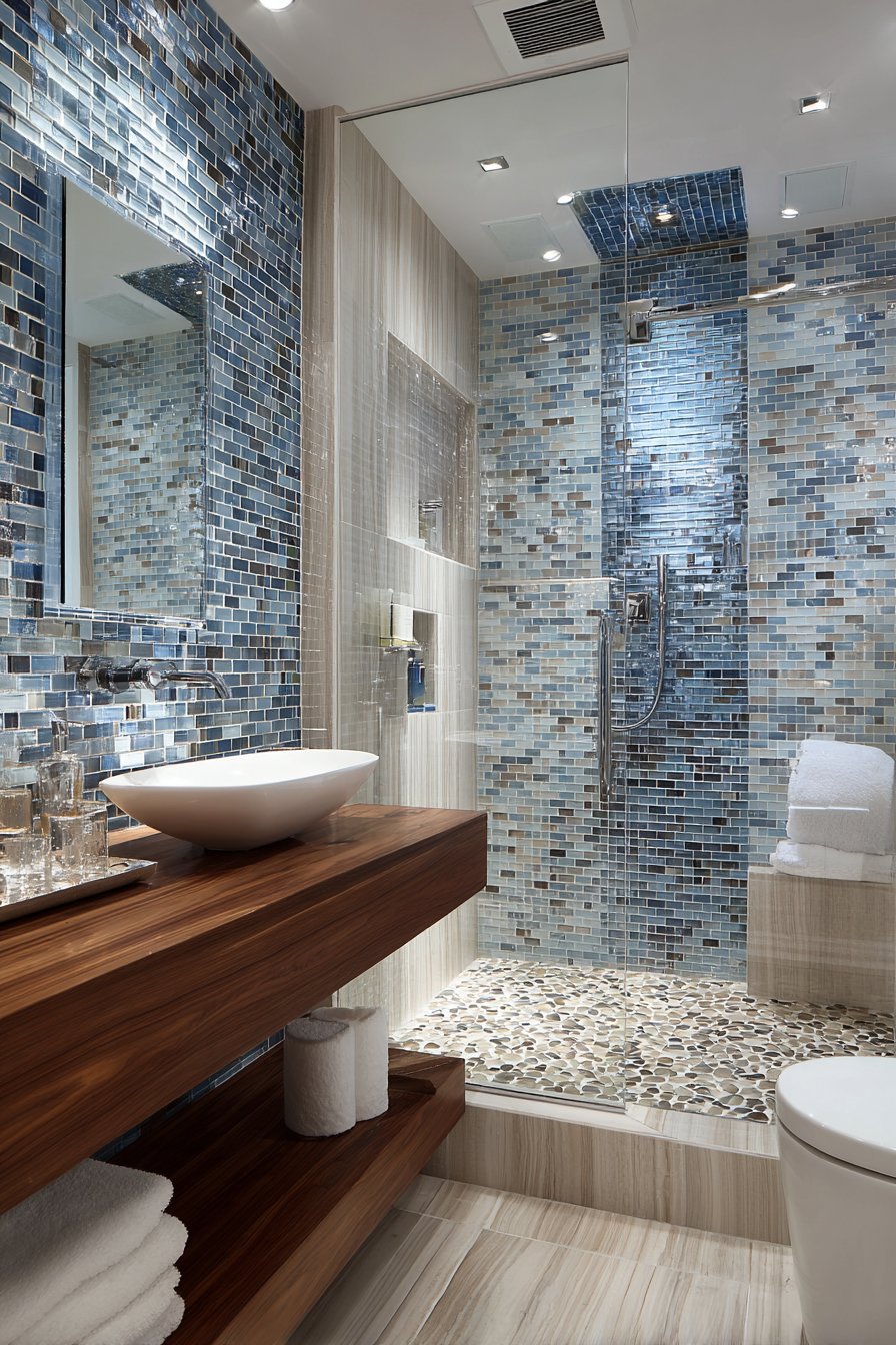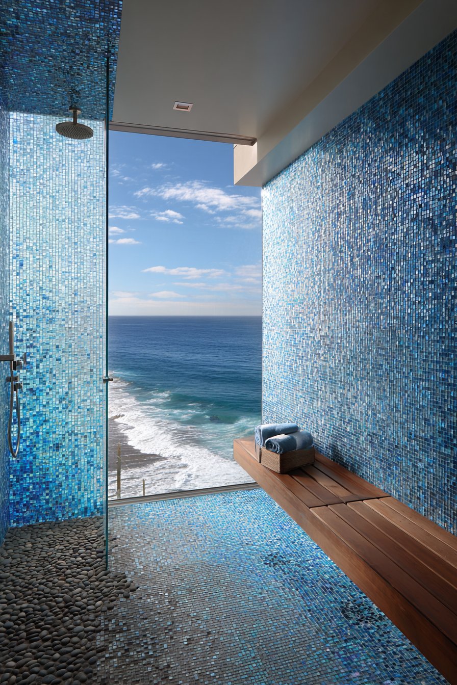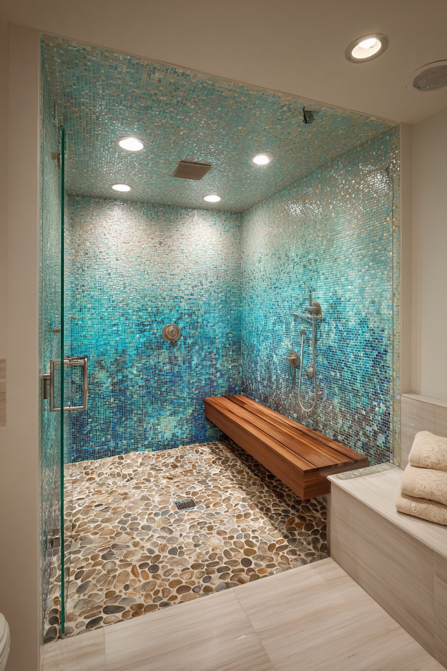 - Install a glass mosaic accent wall in graduated ocean blues to serve as a dramatic focal point