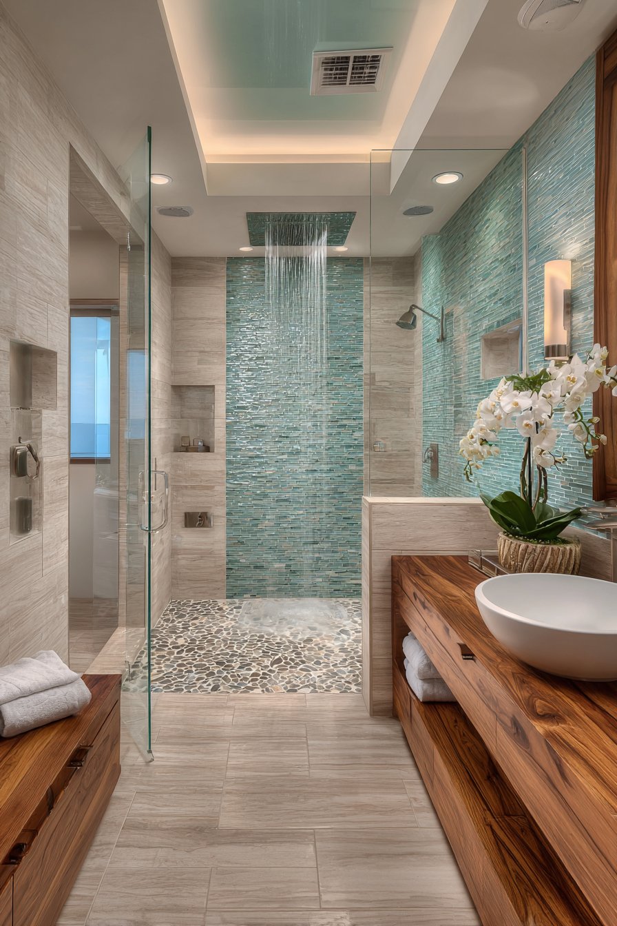 This contemporary interpretation of seaside bathroom design elevates coastal style to sophisticated new heights through the strategic use of large-format porcelain tiles in sandy beige tones, complemented by a stunning glass mosaic accent wall that graduates through ocean blue shades. The walk-in shower becomes the room’s focal point, featuring a luxurious rainfall showerhead that mimics the sensation of tropical downpours and pebble tile flooring that brings the tactile experience of walking on beach stones indoors. A floating teak vanity with vessel sink introduces natural warmth, its rich wood grain providing organic contrast to the cool, water-inspired palette.