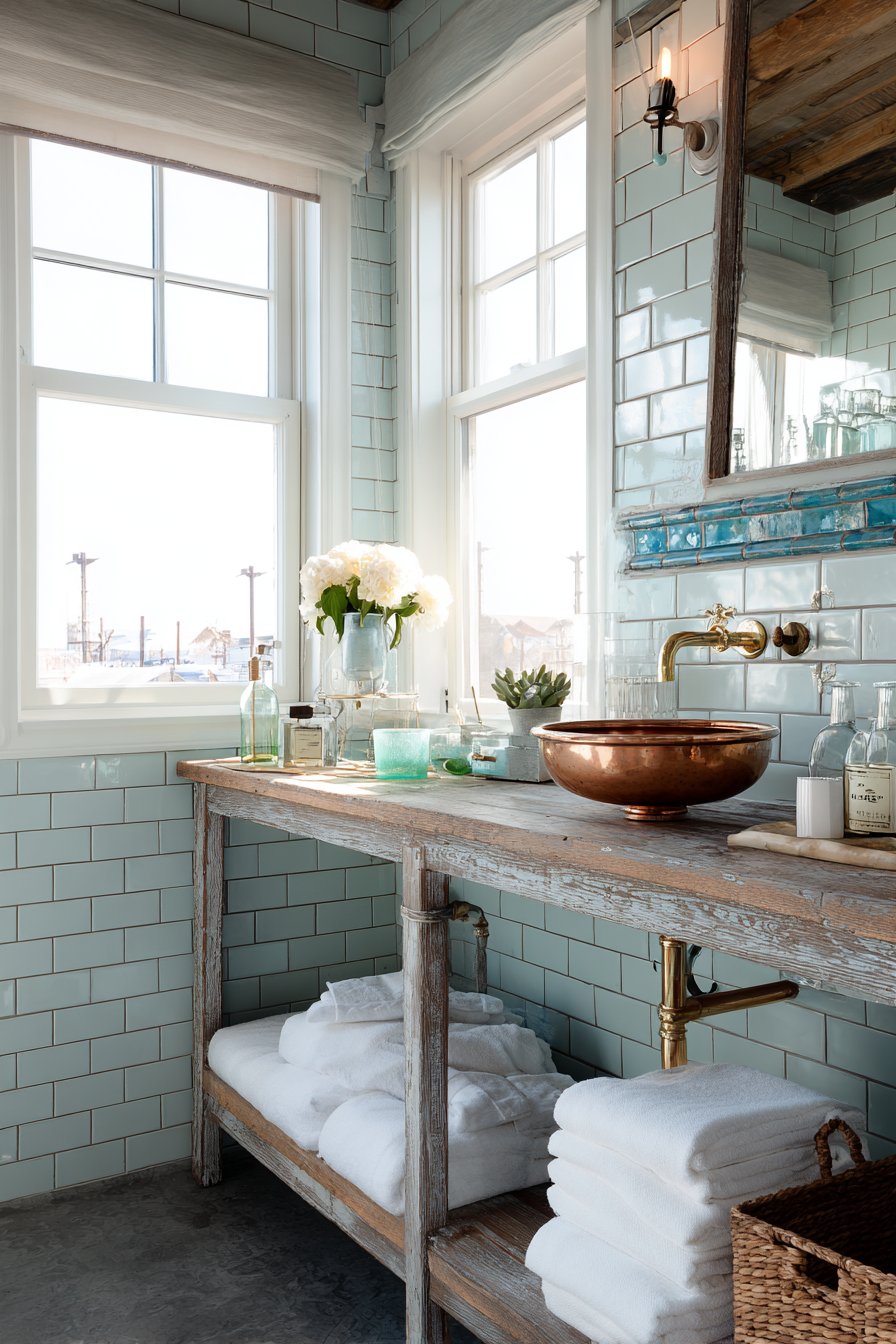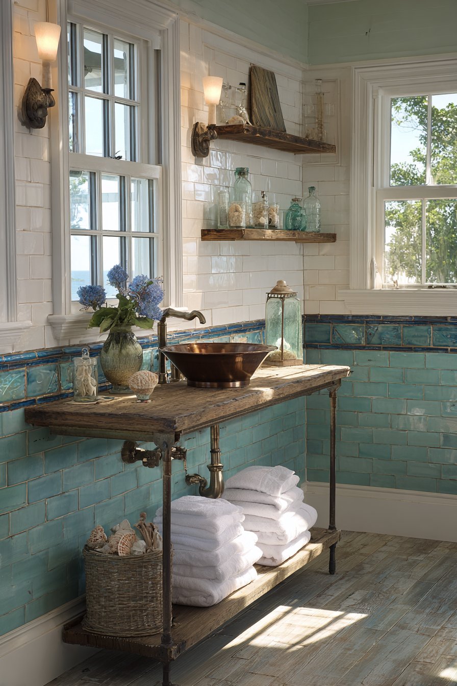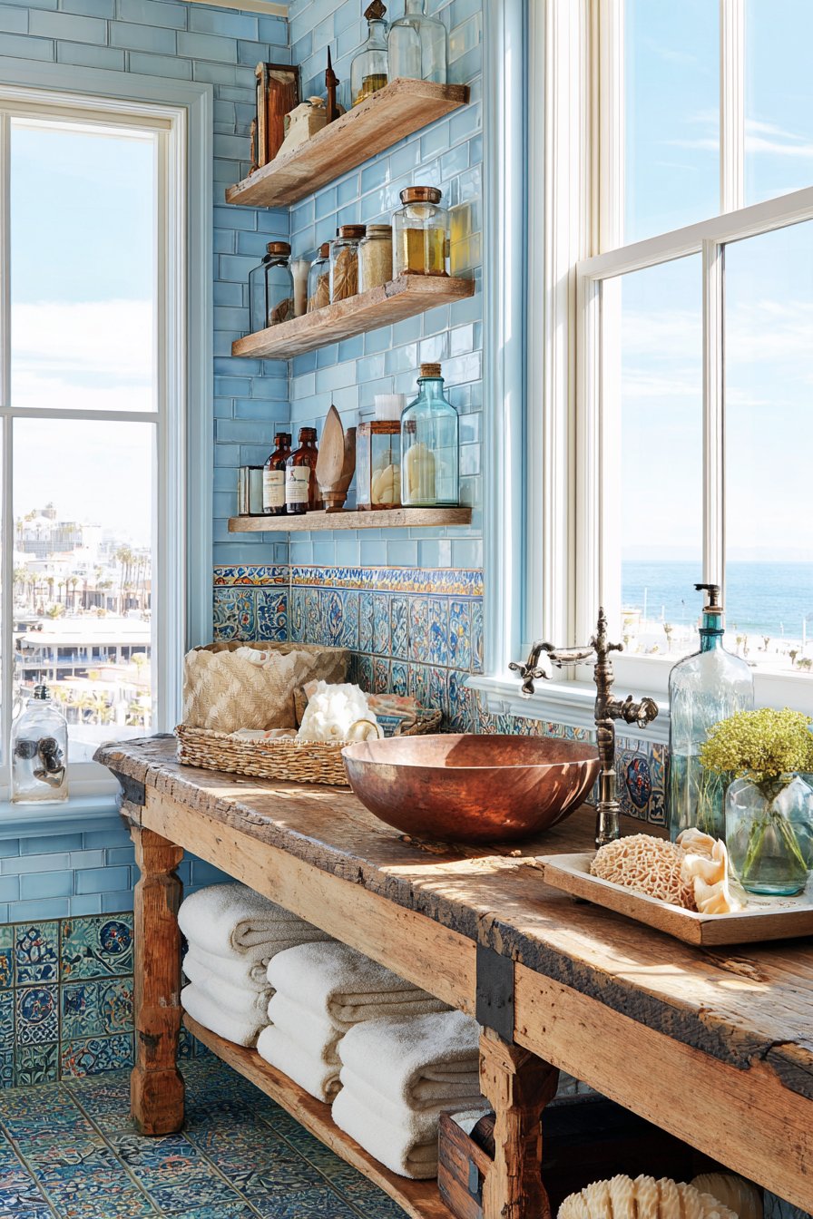 Open shelving displays a curated mix of white towels, vintage glass bottles, and beach treasures found during coastal walks. This approach to storage and display creates a space that feels lived-in and loved rather than staged for photographs. The repurposed console table as vanity demonstrates creativity and sustainability—giving new purpose to existing furniture while avoiding the uniformity of mass-produced vanities. The copper vessel sink adds unexpected metallic warmth, its natural tendency to develop patina ensuring it will look better with age rather than worse.