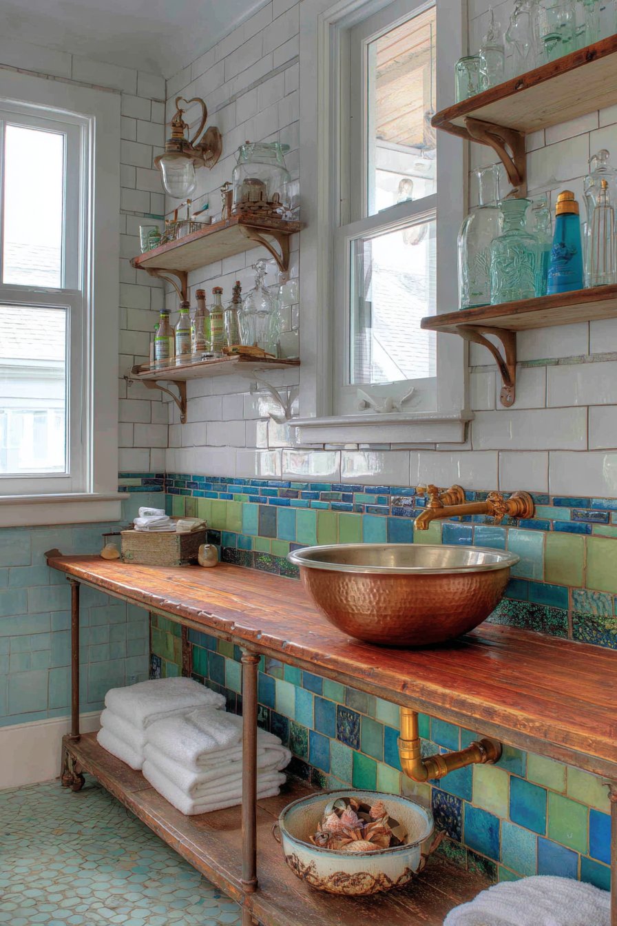 Personal history and individual taste converge in this eclectic seaside bathroom that celebrates the beauty of collected elements rather than matched sets. White subway tiles provide a clean foundation while colorful hand-painted ceramic border tiles in blues and greens suggest sea and sky with artisanal character. A repurposed wooden console table converted to vanity with copper vessel sink demonstrates creative reuse and one-of-a-kind character. Mixed metal fixtures in aged brass and chrome create the collected-over-time appeal of homes furnished gradually rather than all at once.