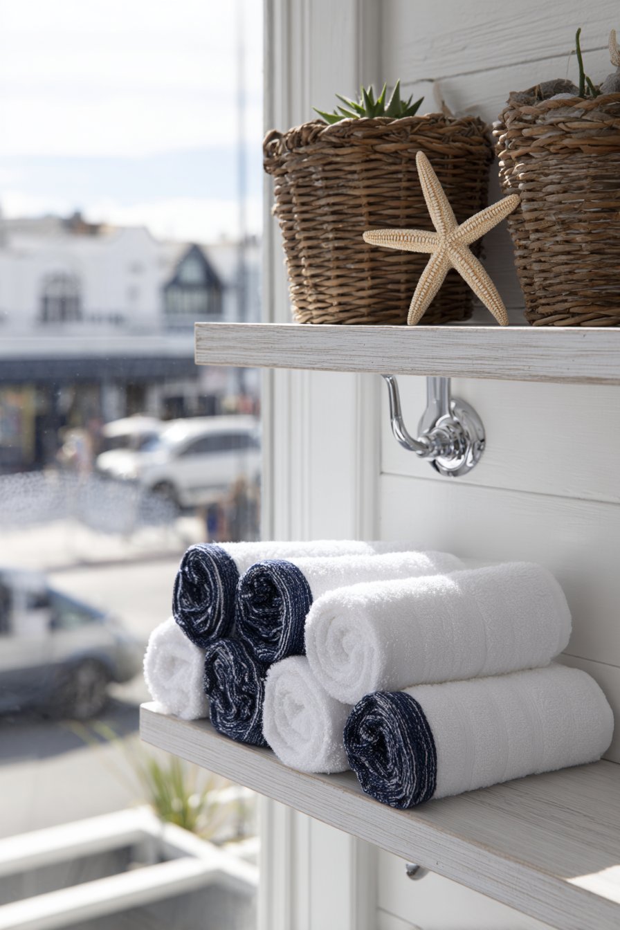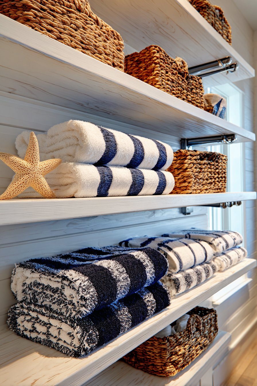 Practicality meets coastal charm in this storage-focused bathroom design that demonstrates how organizational needs can be addressed without sacrificing aesthetic appeal. Built-in recessed shelving with painted shiplap backing in weathered white creates both functional storage and architectural interest, transforming what could be dead wall space into an attractive display area. The open shelves showcase rolled towels in classic navy and white stripes, their crisp patterns echoing nautical tradition, while woven seagrass baskets contain smaller items and introduce natural texture. Decorative starfish and other coastal accessories punctuate the display, preventing the storage from feeling purely utilitarian.