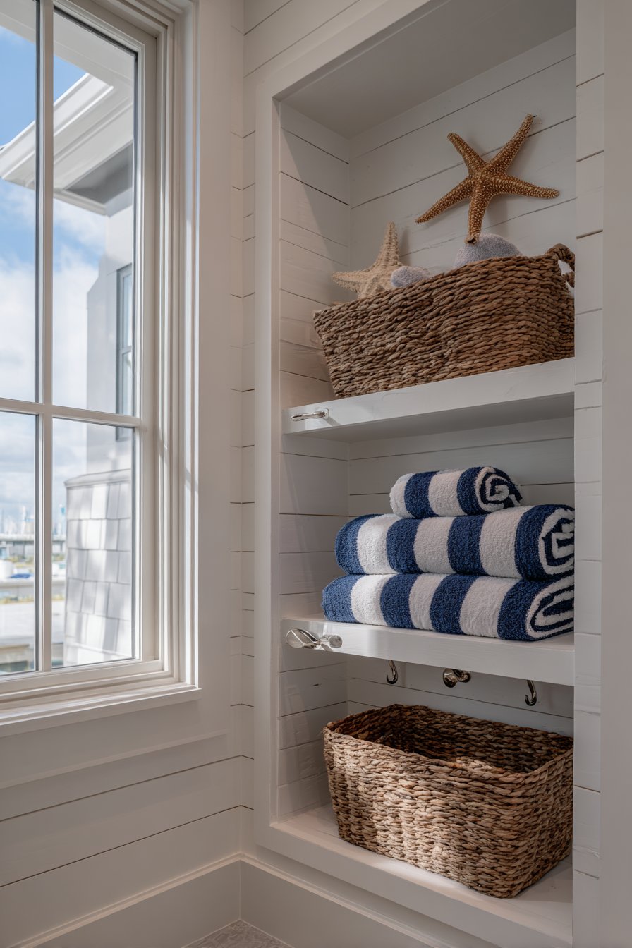 - Line recessed shelving with painted shiplap for added texture and coastal character