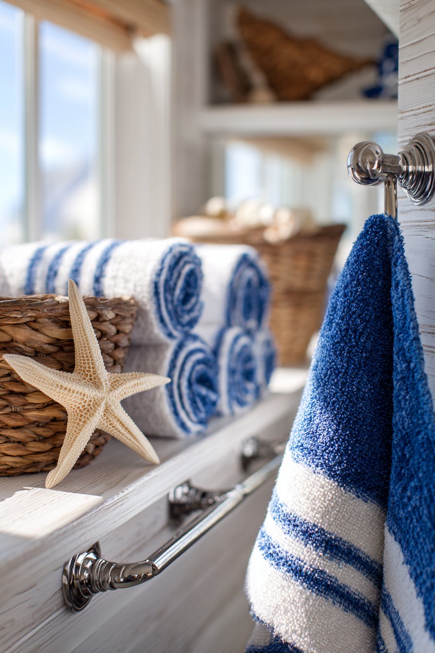 - Choose navy and white striped towels for classic nautical appeal that never goes out of style