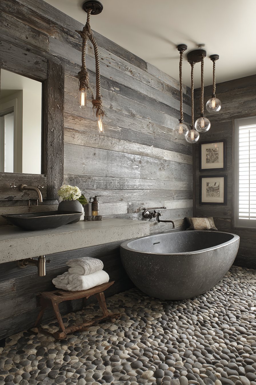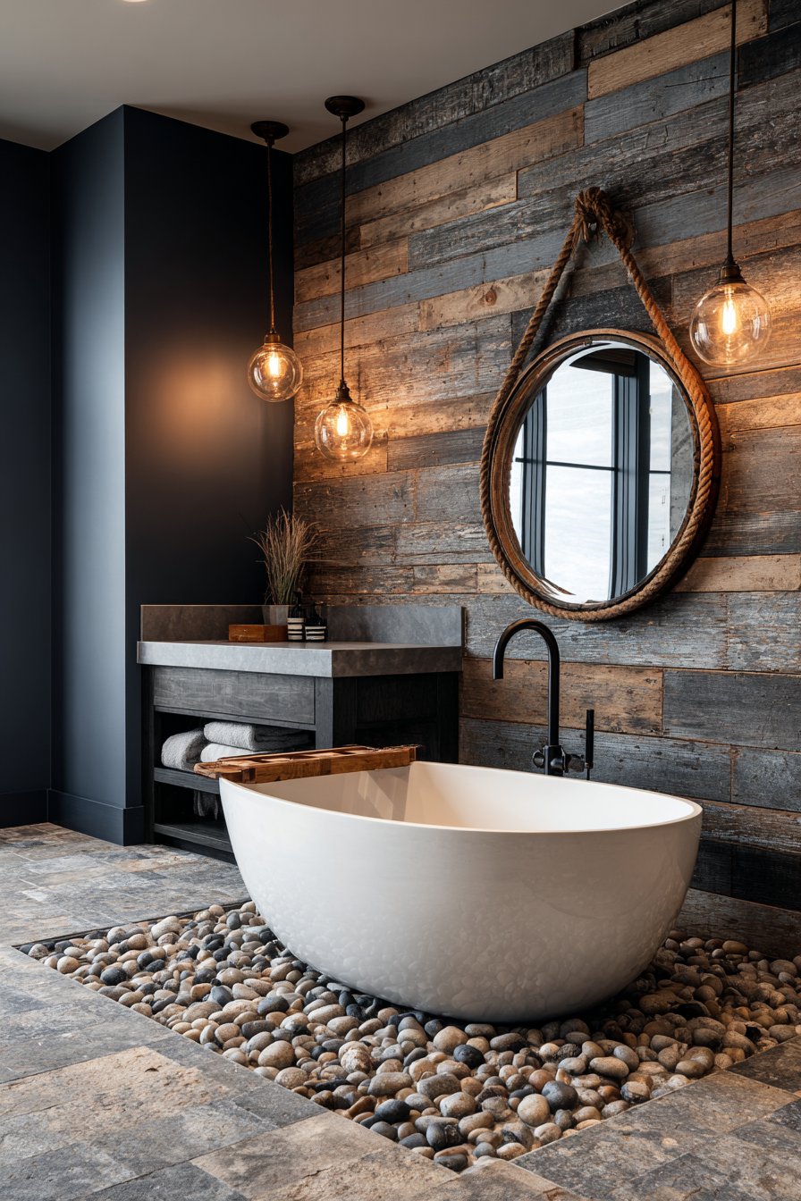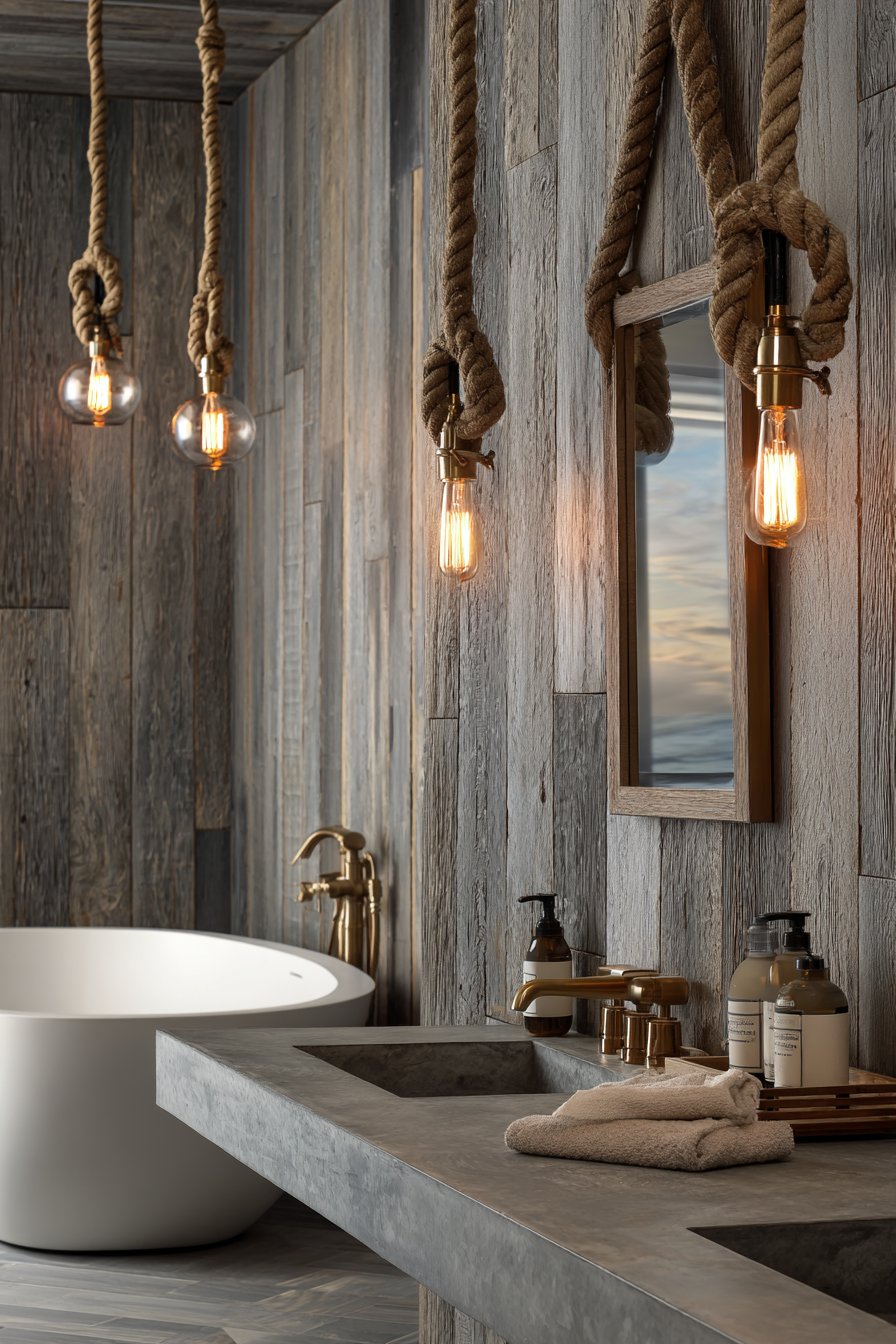 This innovative design bridges two seemingly disparate aesthetics—industrial and coastal—creating a sophisticated space that appeals to those who appreciate both raw authenticity and seaside serenity. A reclaimed wood accent wall in driftwood gray tones provides dramatic backdrop for a sleek modern freestanding tub, the juxtaposition of rustic texture and contemporary form creating dynamic visual tension. A concrete countertop with integrated sink introduces industrial edge while its neutral gray tone harmonizes with coastal color schemes. Edison bulb fixtures with aged brass finish add vintage character while rope details on the mirror frame ensure the maritime theme remains present.