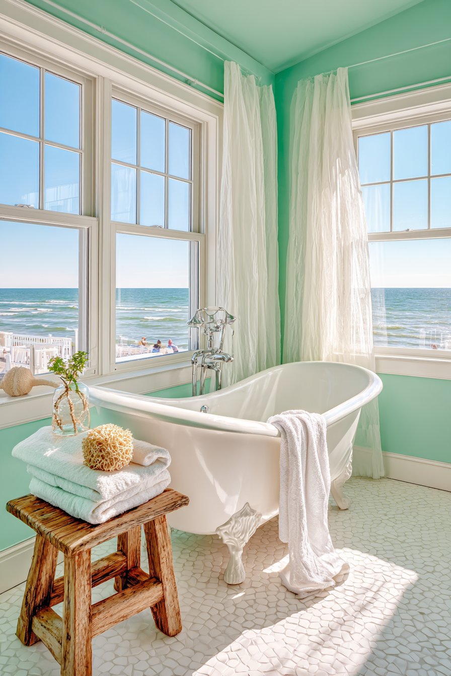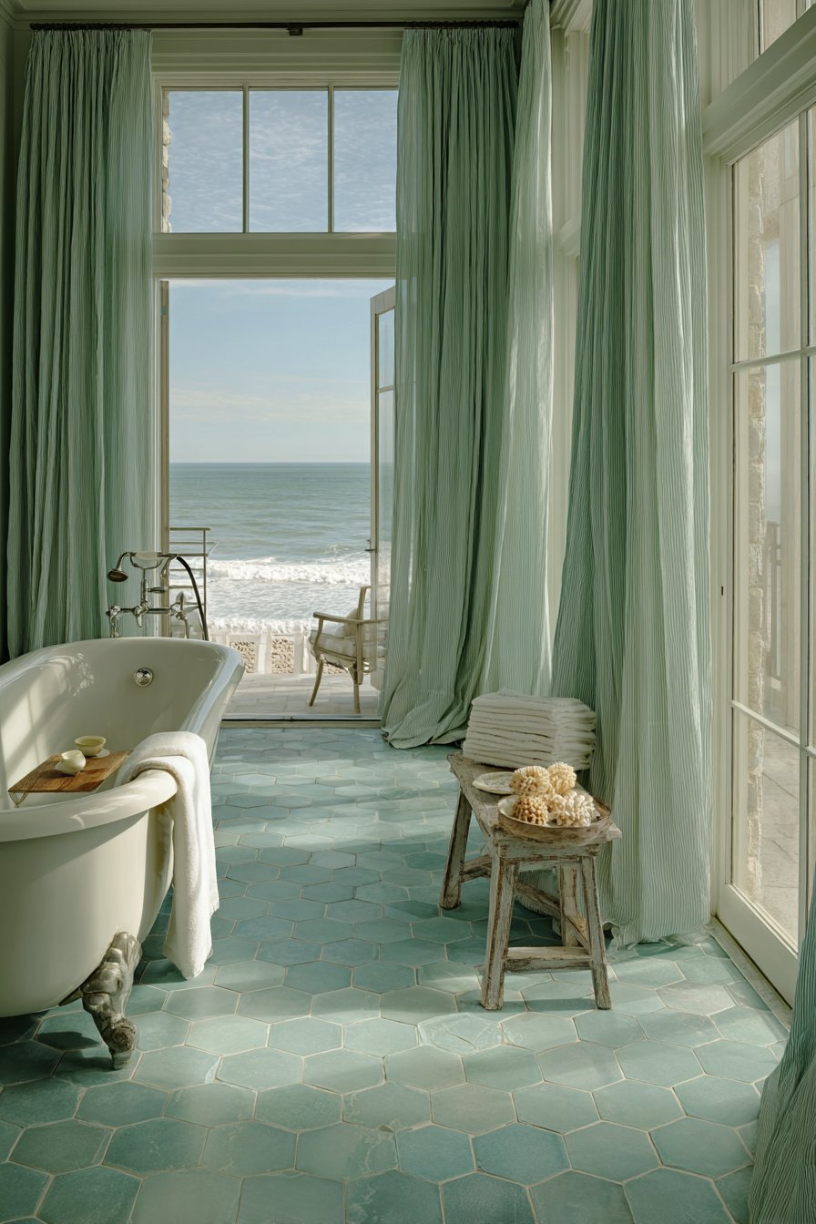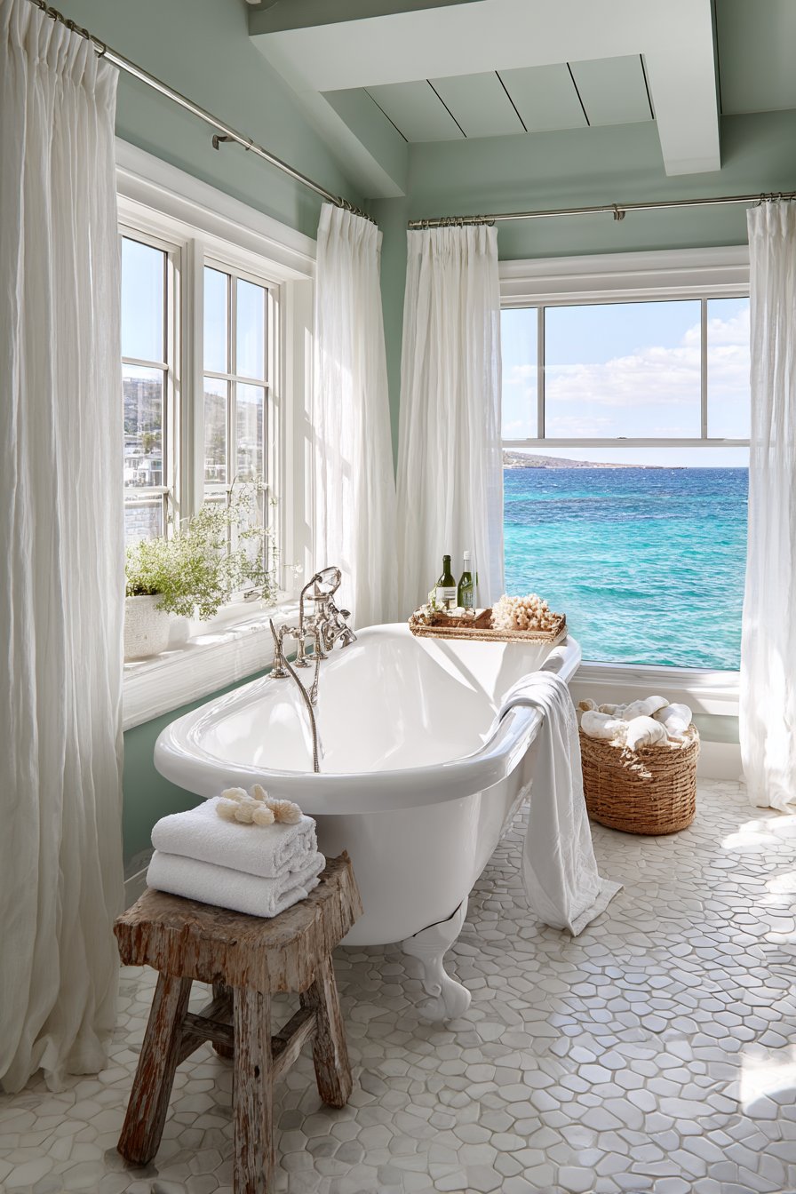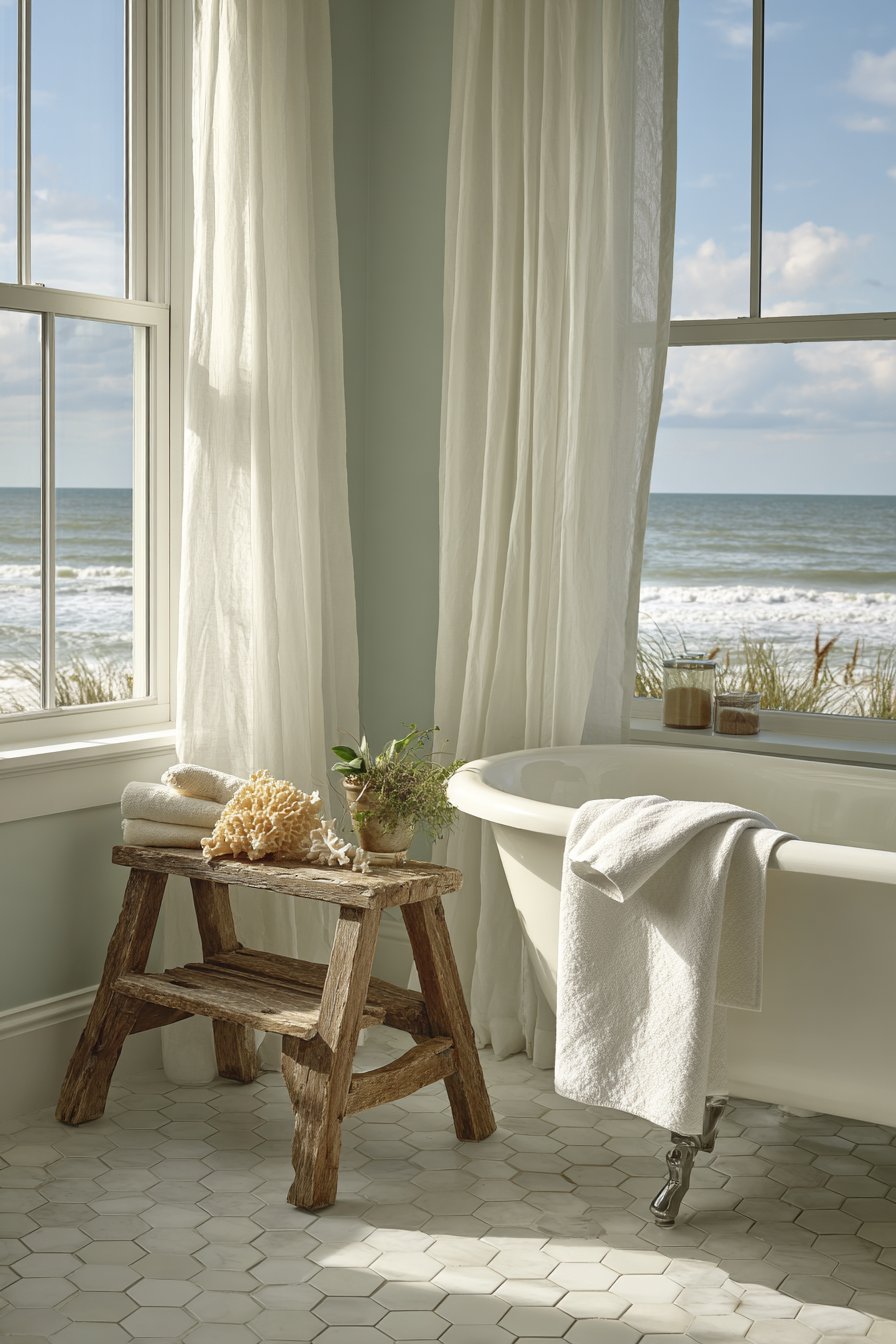 Luxury and nostalgia converge in this romantic seaside bathroom where a pristine clawfoot bathtub takes center stage, positioned on classic white hexagonal floor tiles near expansive windows that frame ocean or garden views. Sheer linen curtains diffuse natural light while preserving privacy, their gentle movement in the breeze adding kinetic beauty to the static elements of the room. A weathered wood stool serves both functional and decorative purposes, holding plush white towels and natural sea sponges that invite indulgent bathing rituals. Walls painted in soft seafoam green create a serene backdrop that evokes the calm of shallow coastal waters.