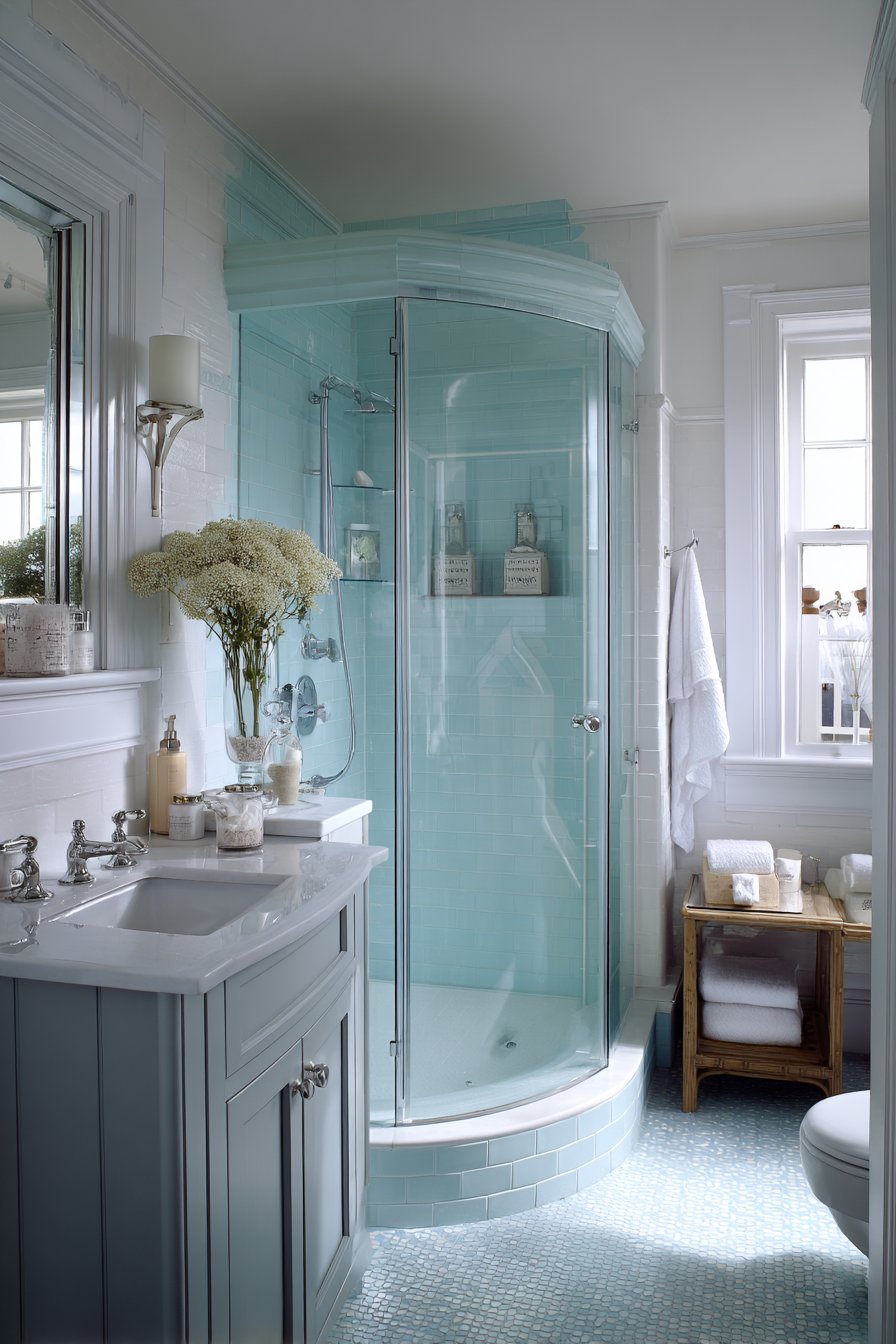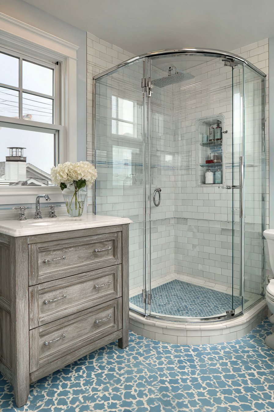 Small bathrooms present unique design challenges, but this compact seaside concept proves that limited square footage need not limit style or functionality. White subway tiles with light blue grout create subtle nautical reference while establishing a bright, clean foundation that makes the space feel larger than its actual dimensions. A corner shower with clear glass enclosure maximizes usable floor space while the transparent glass prevents visual barriers that would make the room feel cramped. The shower floor features blue and white geometric tiles that add pattern and personality without overwhelming the compact footprint.
