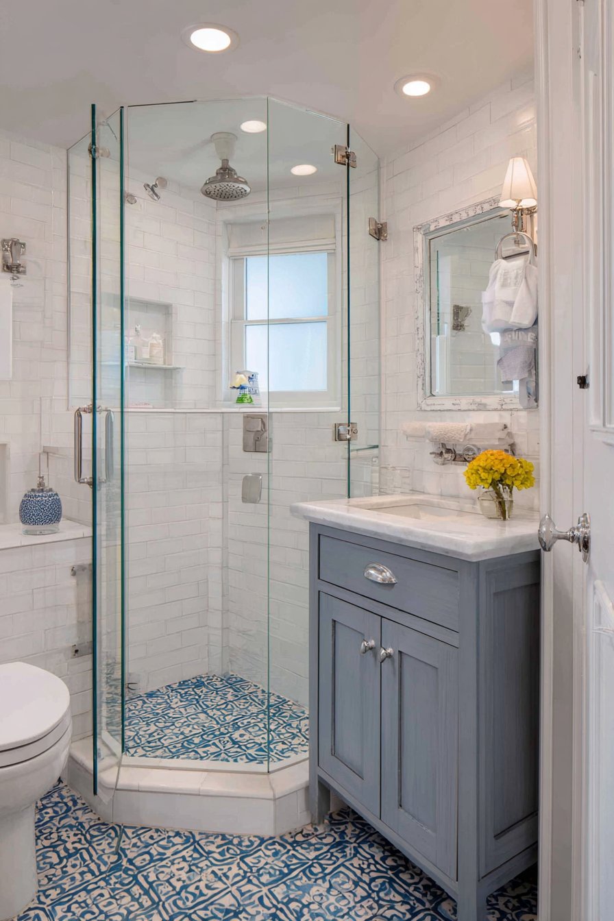 - Add pattern through shower floor tiles rather than wall tiles to avoid overwhelming small spaces