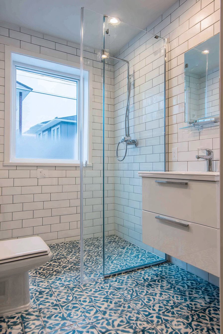 - Create shower interest with white subway tiles and sea glass blue border tiles