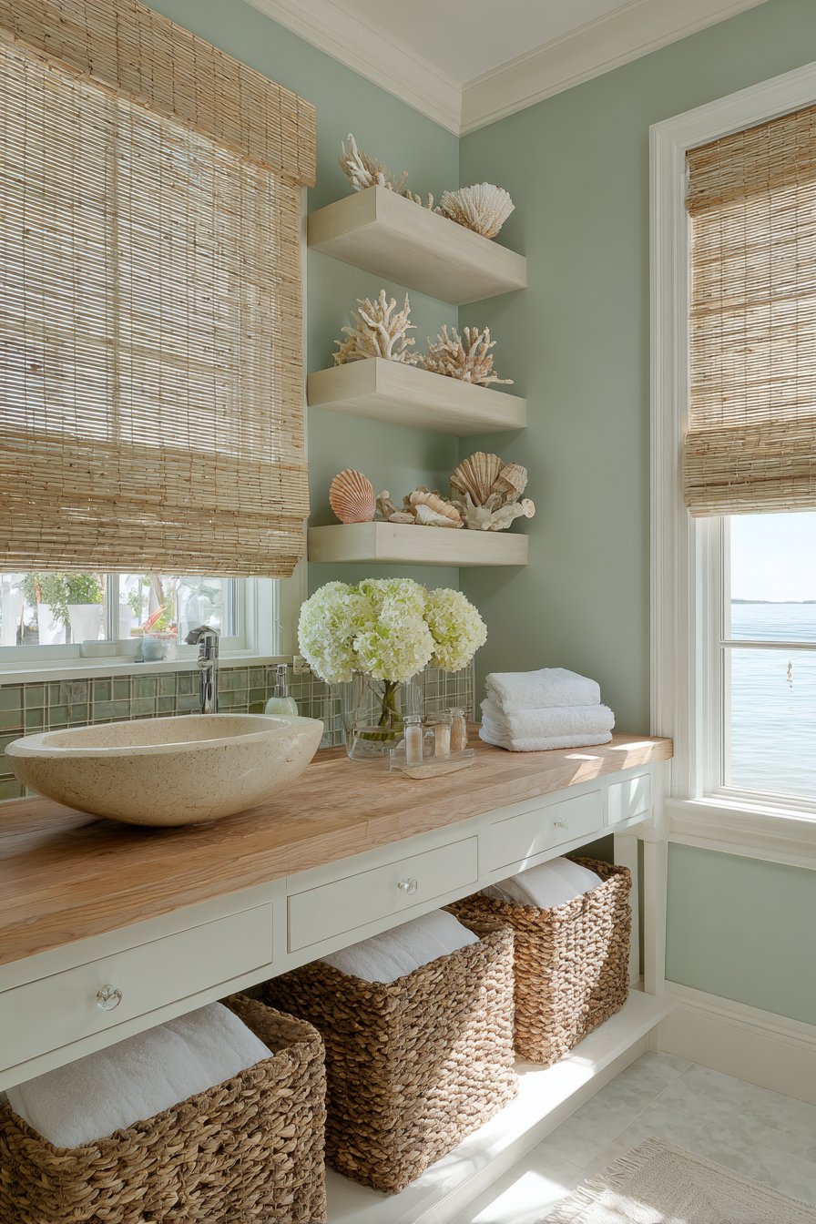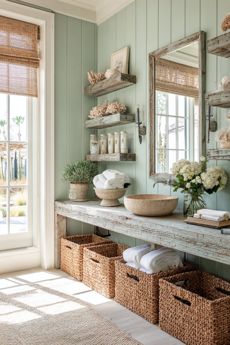 - Use bamboo for mirrors, ladders, and accessories for sustainable coastal style