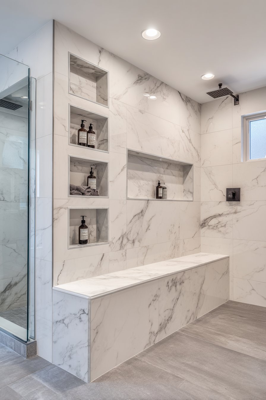 Color strategy varies widely across these concepts, from monochromatic white schemes through various grey palettes to warm earth tones and even bold contrasts, demonstrating that shower niche design can support any color direction. The neutral palettes dominating many designs reflect practical wisdom—spaces experiencing constant moisture and requiring frequent cleaning benefit from colors that don’t show water spots, soap residue, or hard water staining as readily as darker tones. However, the darker and more colorful options prove that with proper material selection and maintenance commitment, dramatic color choices can succeed beautifully.