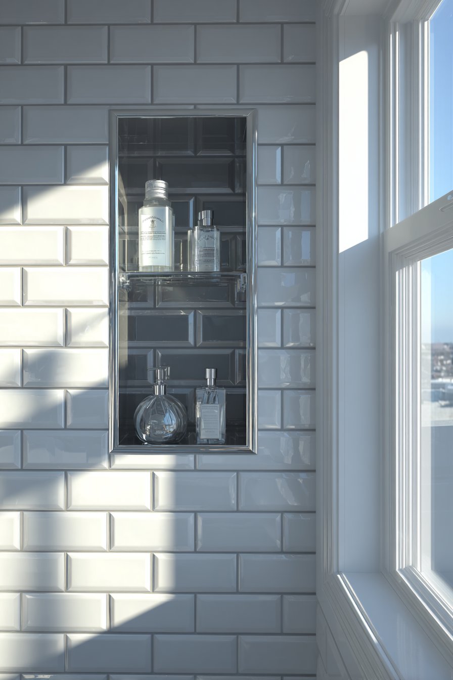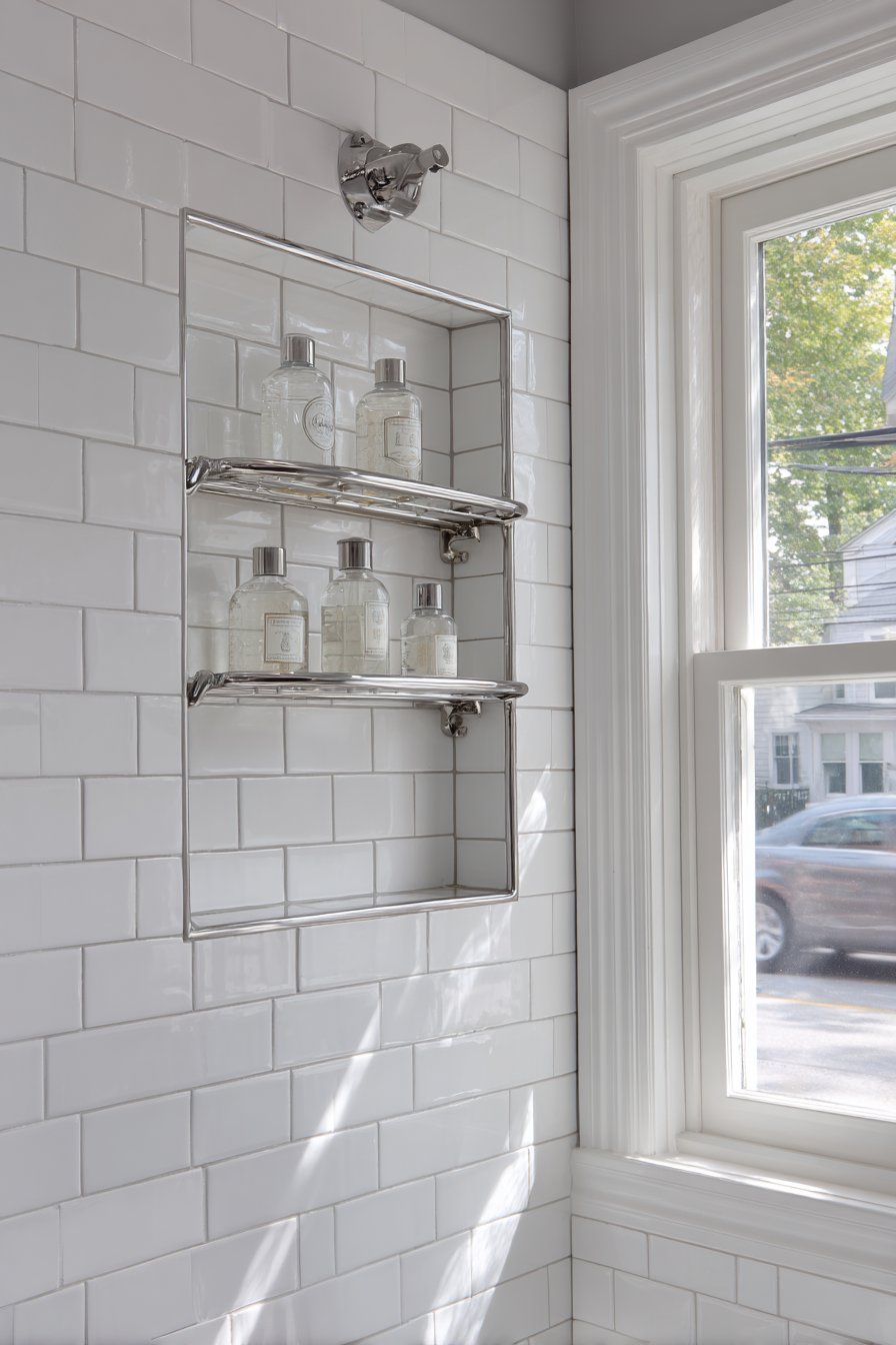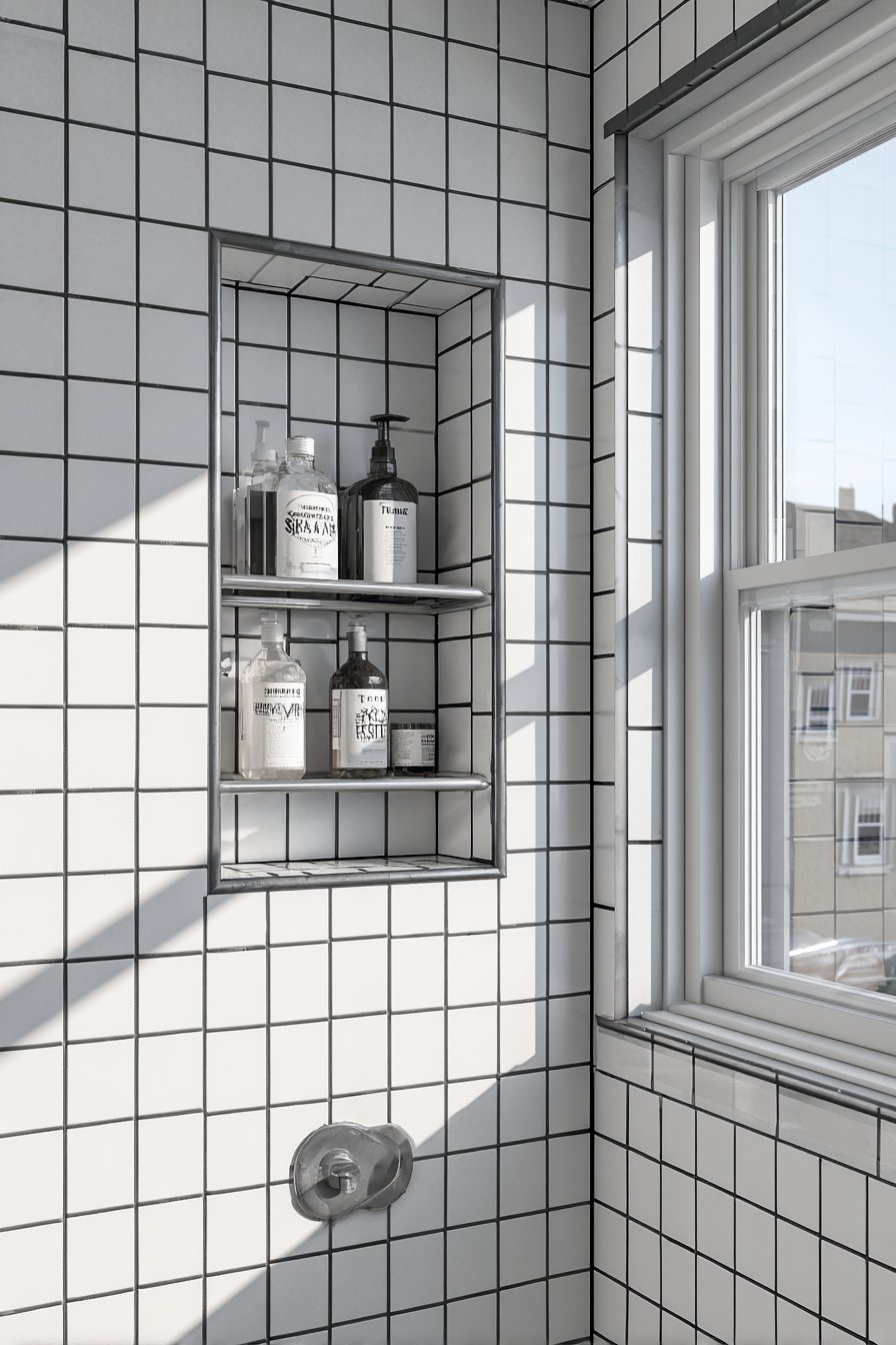 What makes this design particularly appealing is its universal adaptability. The chest-height positioning ensures comfortable reach for most users without requiring awkward bending or stretching, making it an excellent choice for family bathrooms where multiple household members of varying heights will use the space. The subway tile selection offers timeless appeal that transcends passing trends, ensuring your investment will look current for years to come. Natural lighting from adjacent bathroom windows creates gentle shadows that emphasize the dimensional quality of the recessed niche, transforming what could be merely functional into genuinely attractive.