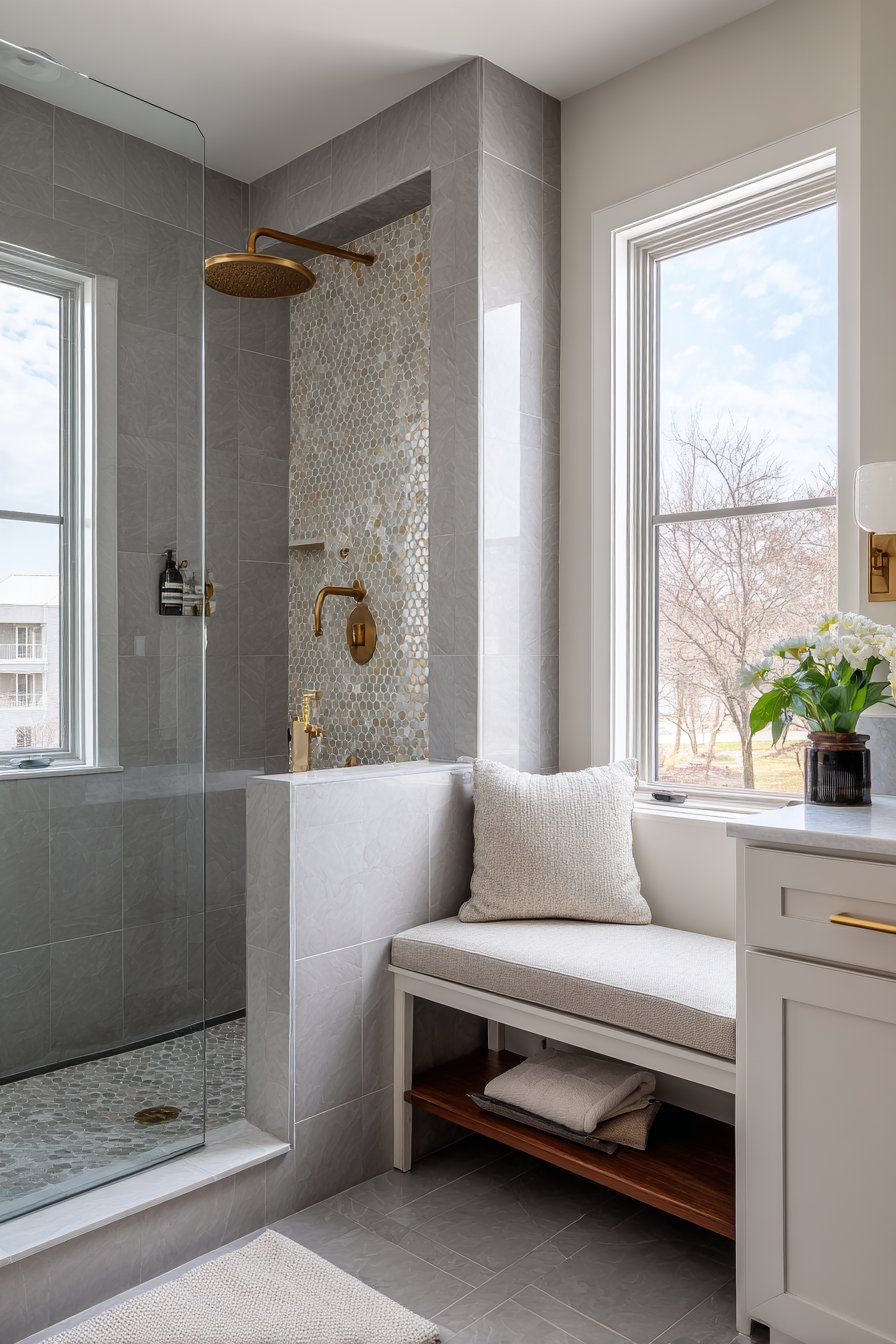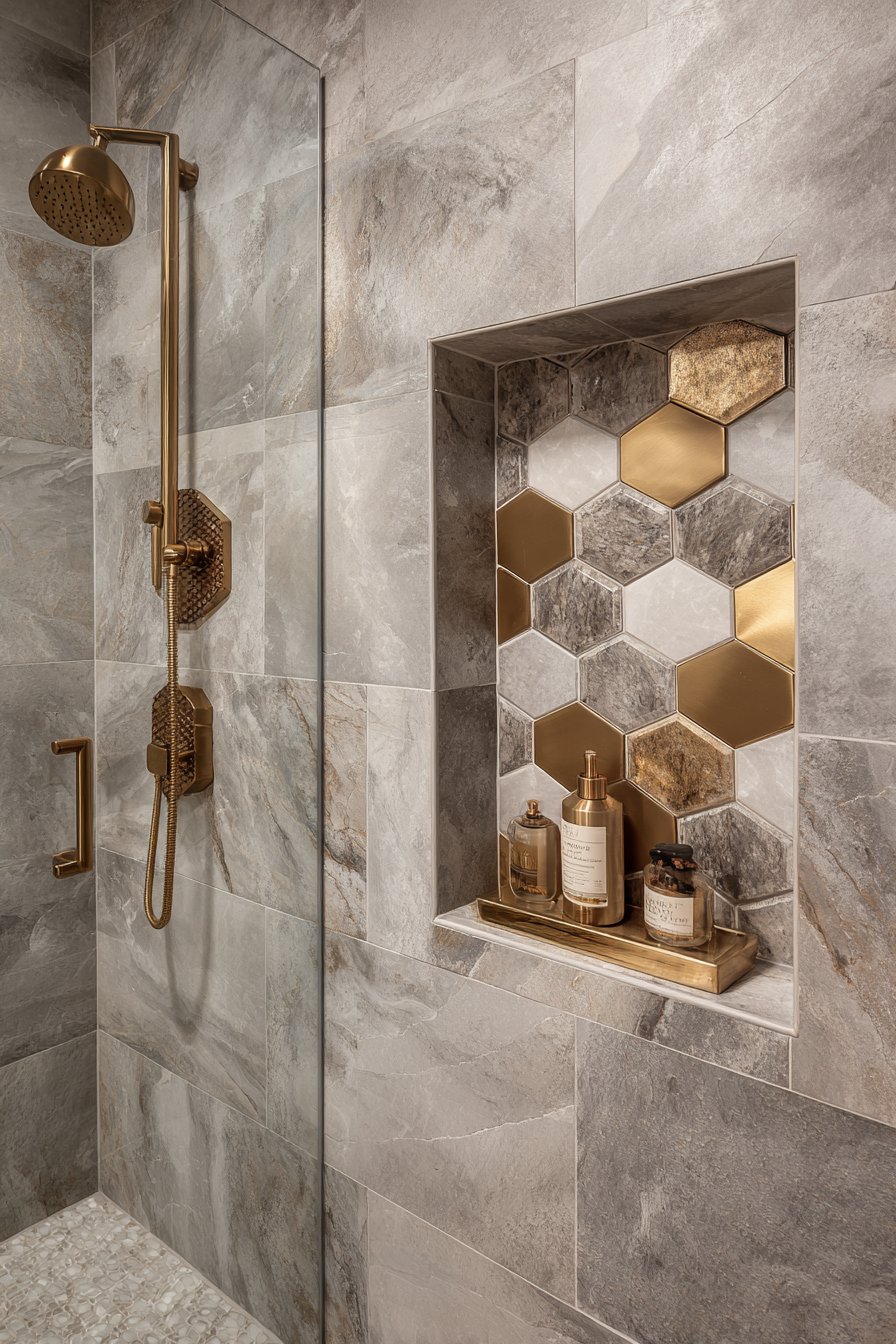 Breaking away from rectangular conventions, the hexagonal niche offers unexpected visual interest that captures attention and expresses personality. This contemporary design features a geometric six-sided niche in matte grey large-format tiles with brass hexagonal tile mosaic backing that creates a jewel-box effect within the wall. The unusual shape becomes a focal point that transcends mere storage function, while warm brass fixtures coordinate with the metallic mosaic accents to create cohesive design narrative throughout the shower space.