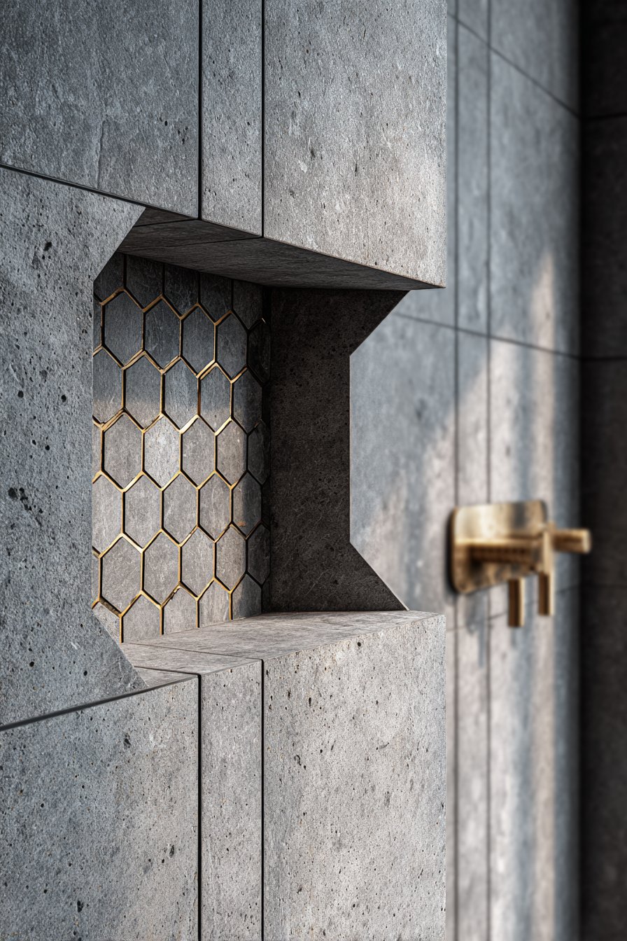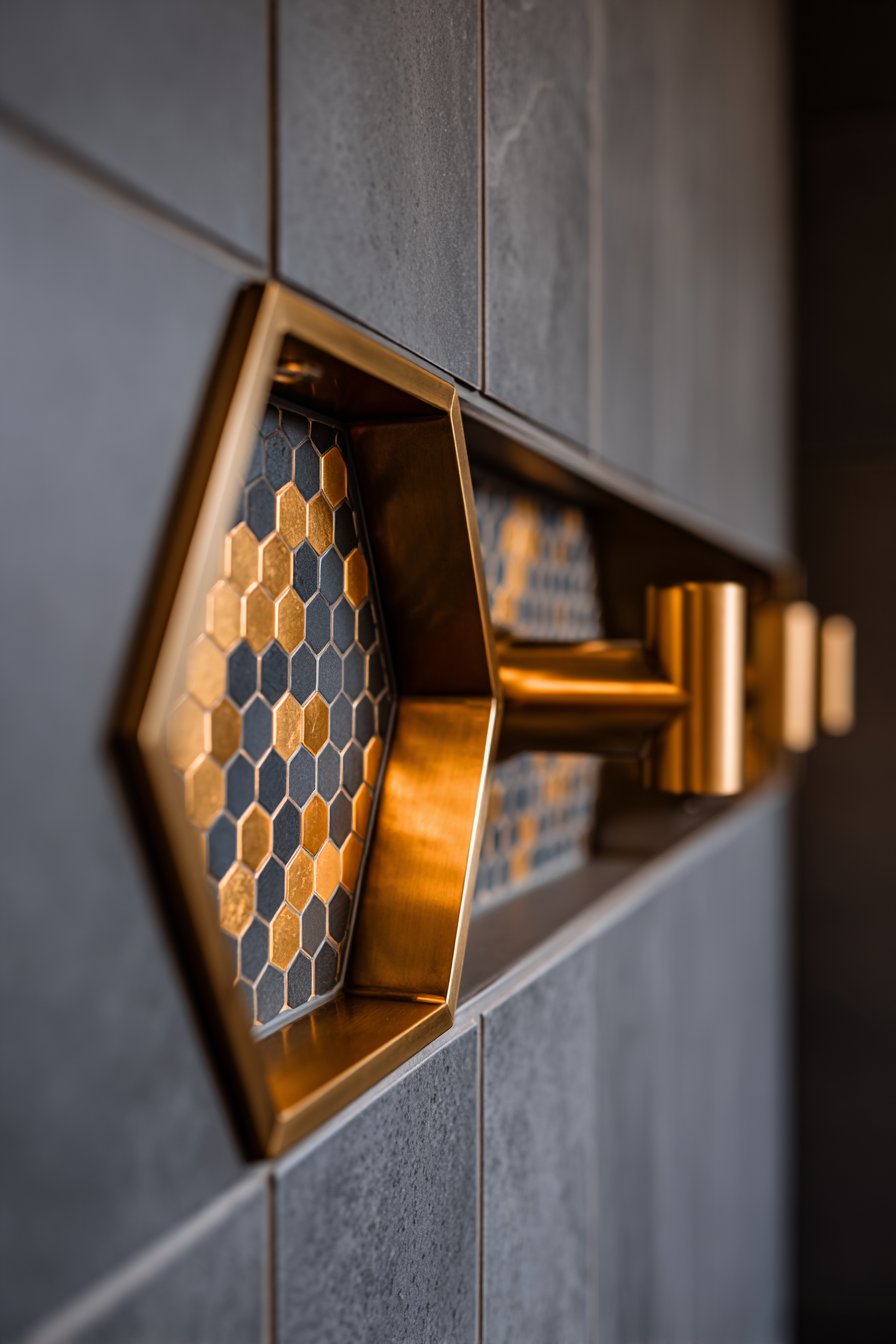 Brass fixtures and accents represent a significant departure from the chrome and nickel finishes that have dominated bathroom design for decades. The warm golden tones add richness and personality while complementing a wide range of color schemes. The brass hexagonal mosaic backing transforms the niche interior into a statement feature worthy of attention, catching and reflecting light in ways that flat tiles cannot. This combination of unusual geometry and warm metallic accents creates spaces that feel custom and considered rather than spec-grade and generic.