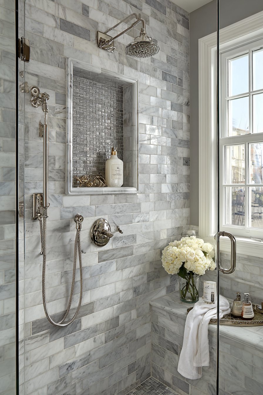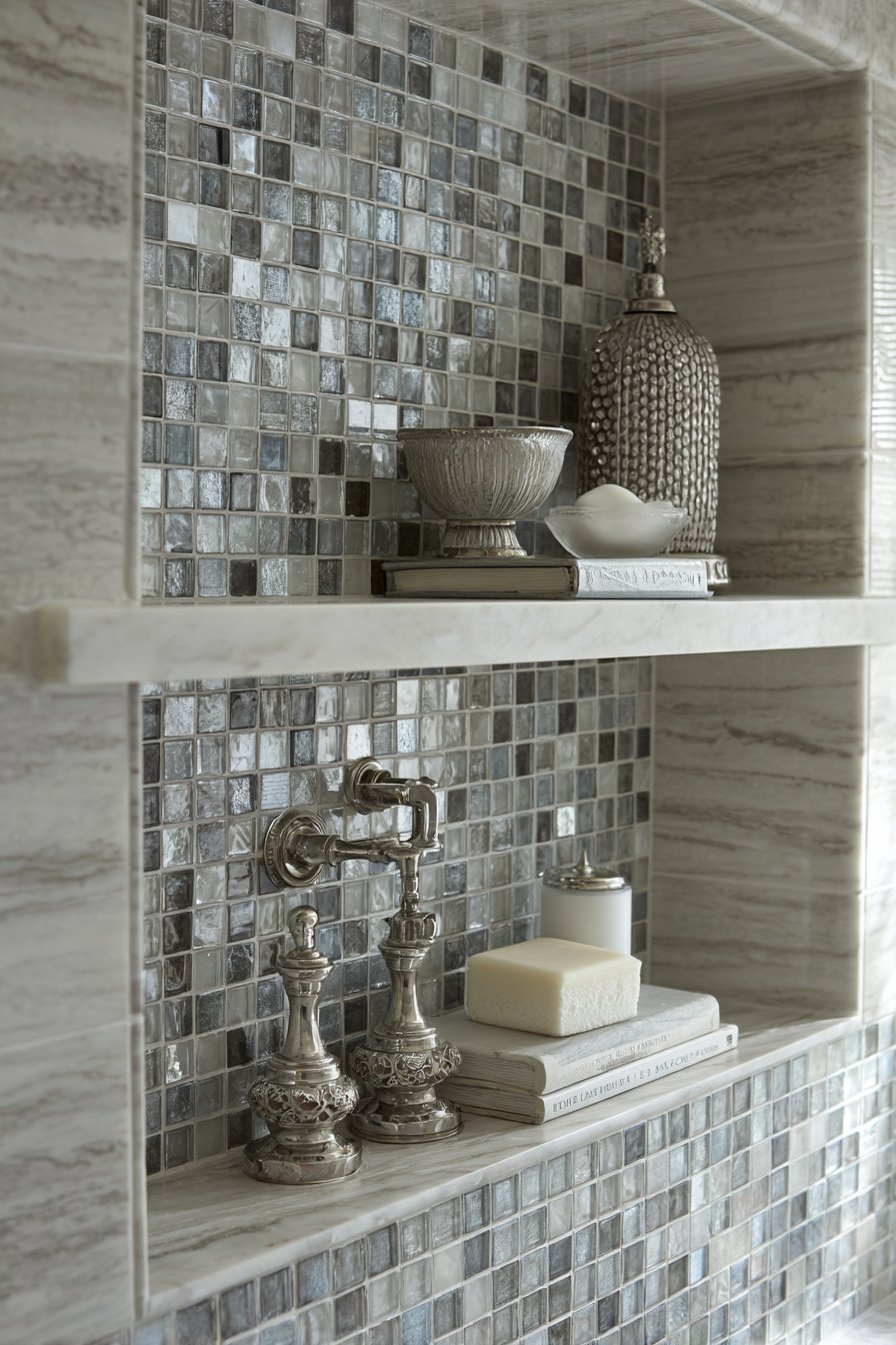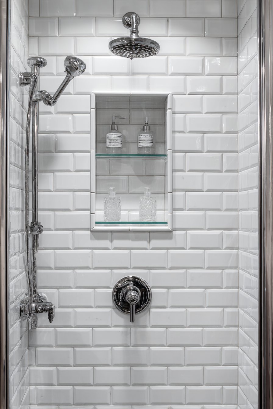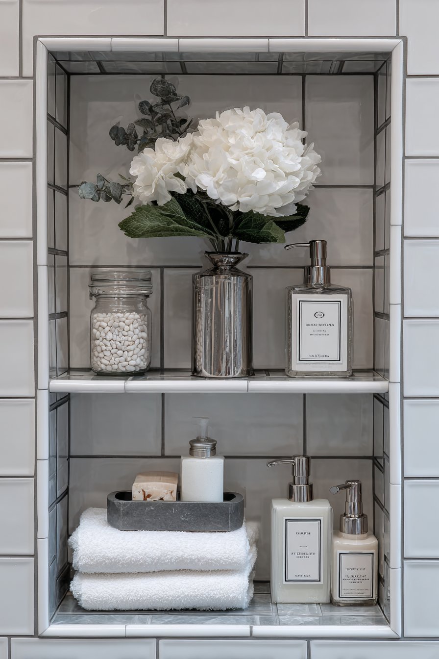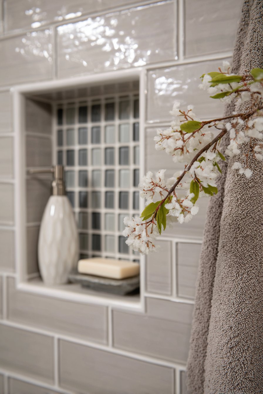 Transitional design serves homeowners who appreciate both traditional and contemporary aesthetics, creating spaces that feel current without abandoning classic principles. This niche design features the timeless appeal of classic white subway tile combined with contemporary grey glass mosaic tile backing. Brushed nickel fixtures bridge eras by being neither strictly traditional chrome nor boldly modern matte black, and the carefully arranged white and grey bath accessories maintain the refined neutral palette that characterizes successful transitional design.