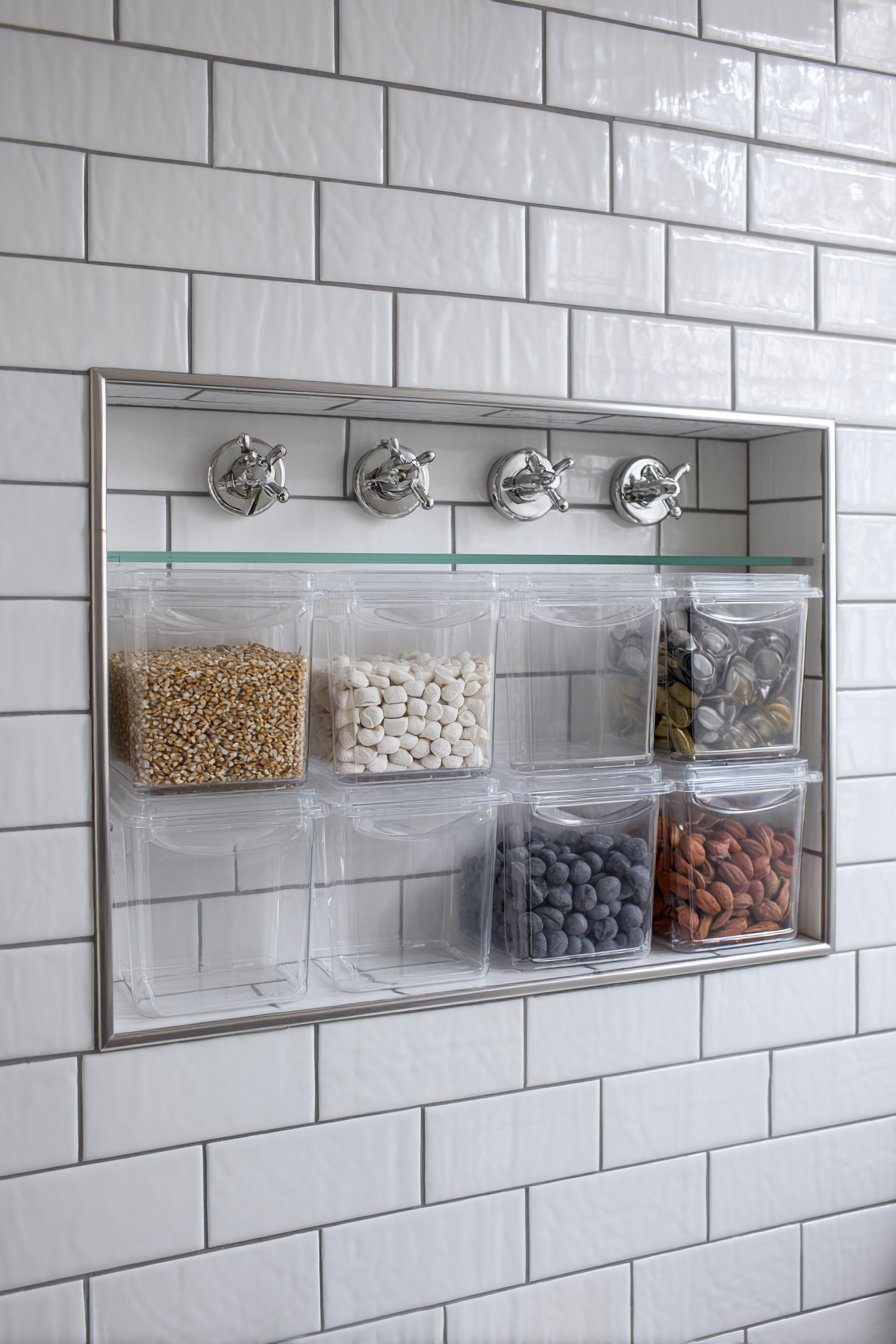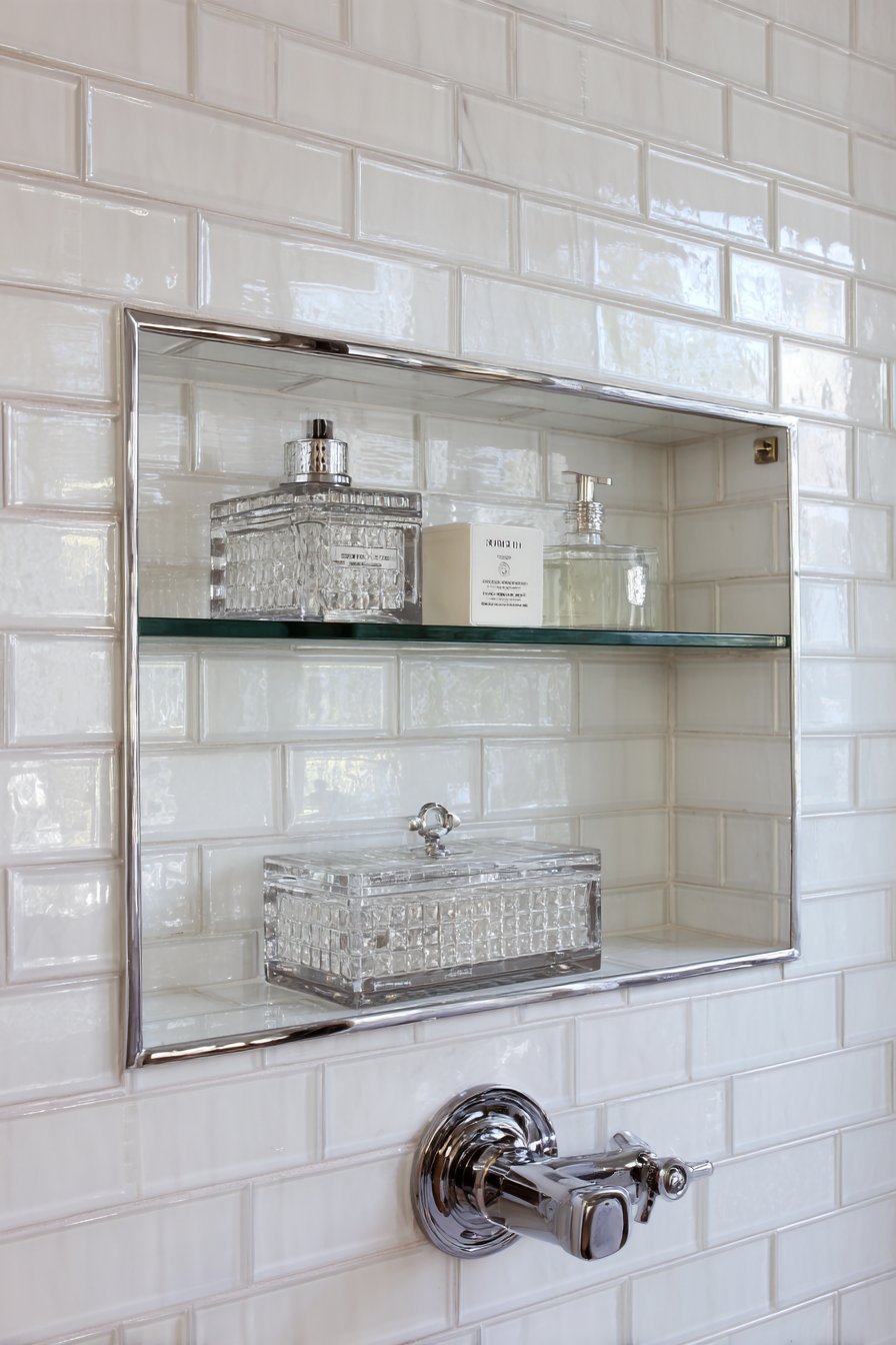 Not every bathroom renovation comes with unlimited budget, and this honest, accessible design proves that attractive, functional results are achievable at modest price points. A simple rectangular niche features standard white ceramic tile with a single glass shelf insert that provides transparent storage without visual bulk. Basic chrome fixtures maintain the clean aesthetic while clear plastic organizing bins demonstrate practical everyday functionality that real families need. Natural bathroom lighting creates straightforward presentation that doesn’t rely on expensive lighting systems or dramatic materials.