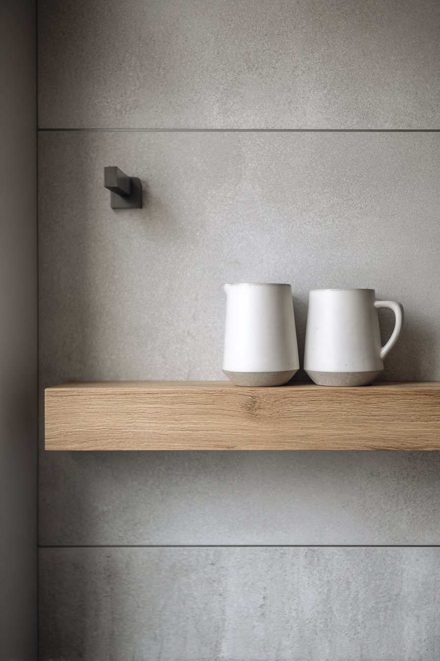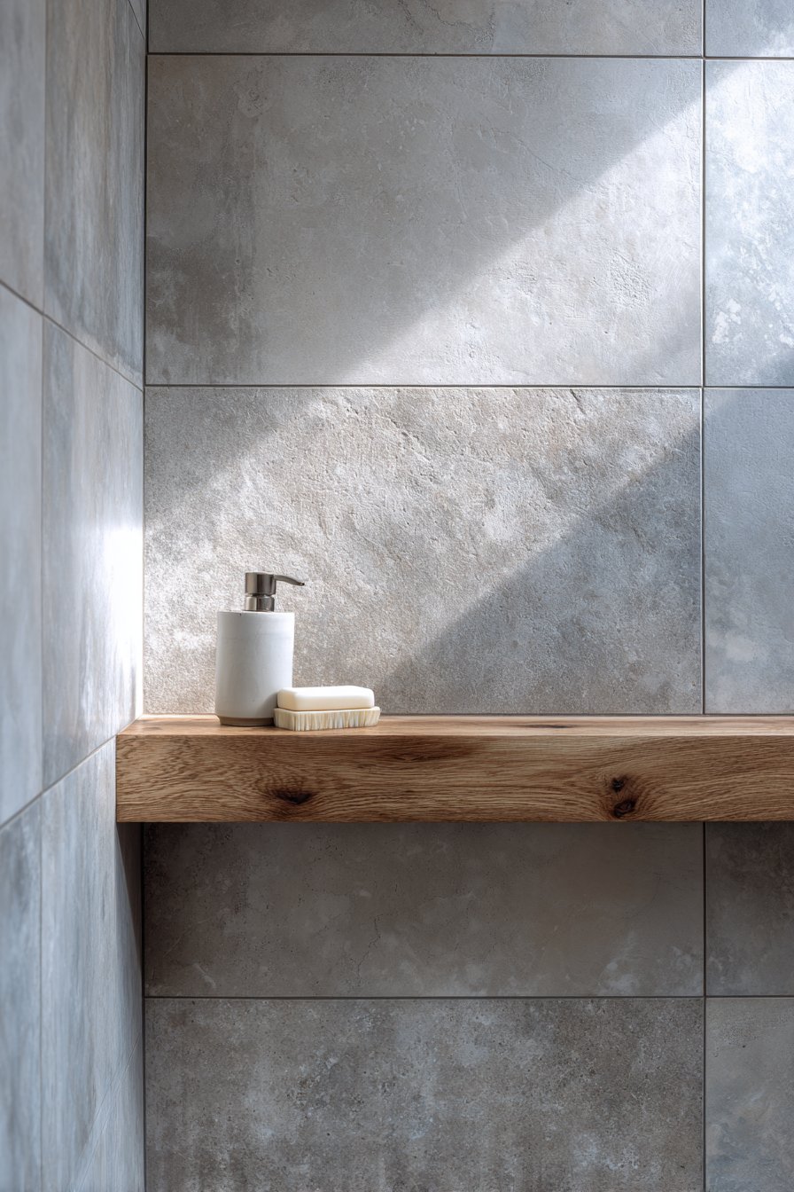 Large-format concrete-effect tiles (often 24×48 inches or larger) minimize grout lines that can visually chop up surfaces and make spaces feel smaller. The fewer seams create a more unified, cohesive appearance while also reducing maintenance requirements—fewer grout lines mean less scrubbing and less opportunity for discoloration or mold growth. The grey concrete tones provide sophisticated neutrality that works as a backdrop for various accessories and decor choices.