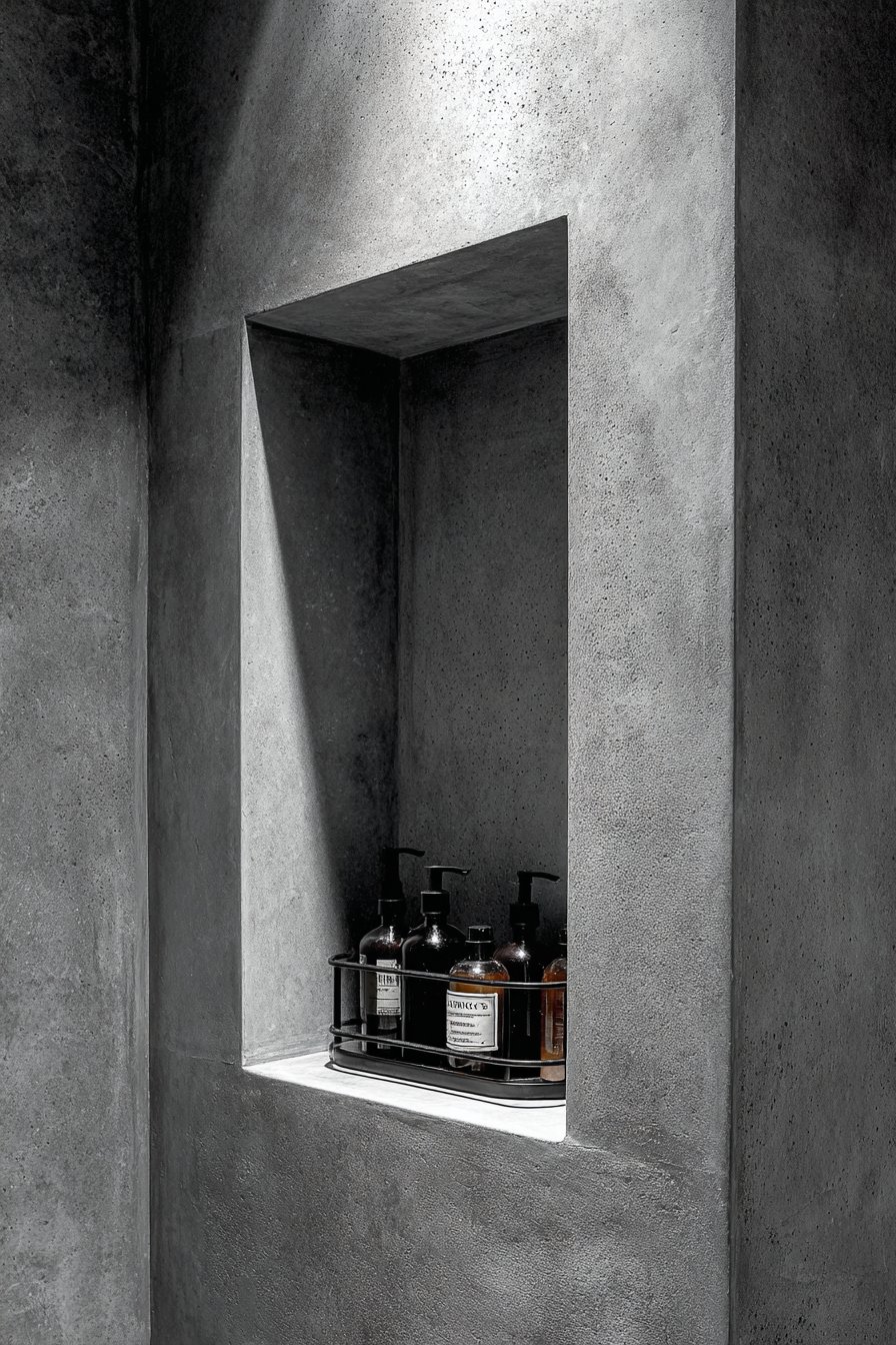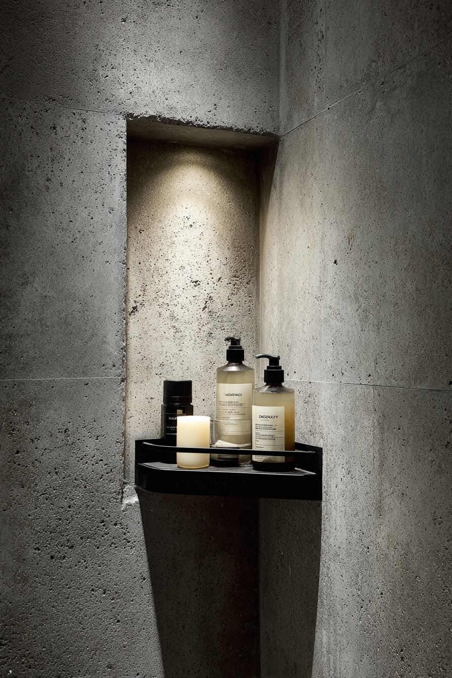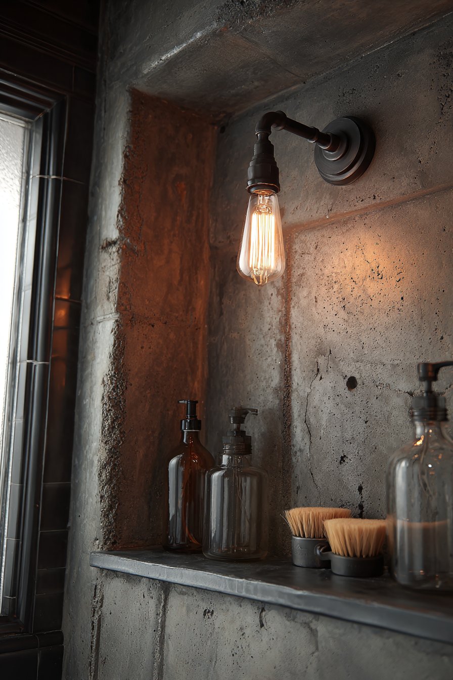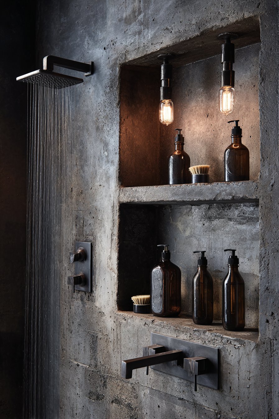For those drawn to the honest materials and utilitarian beauty of industrial design, this concept embraces exposed concrete and raw steel with unapologetic authenticity. The niche features genuine exposed concrete with visible form marks that reveal the construction process, paired with a raw steel floating shelf that will develop natural patina over time. Matte black fixtures and an Edison-style bulb sconce create urban loft atmosphere, while glass apothecary bottles and natural bristle brushes complete the masculine, unadorned aesthetic.