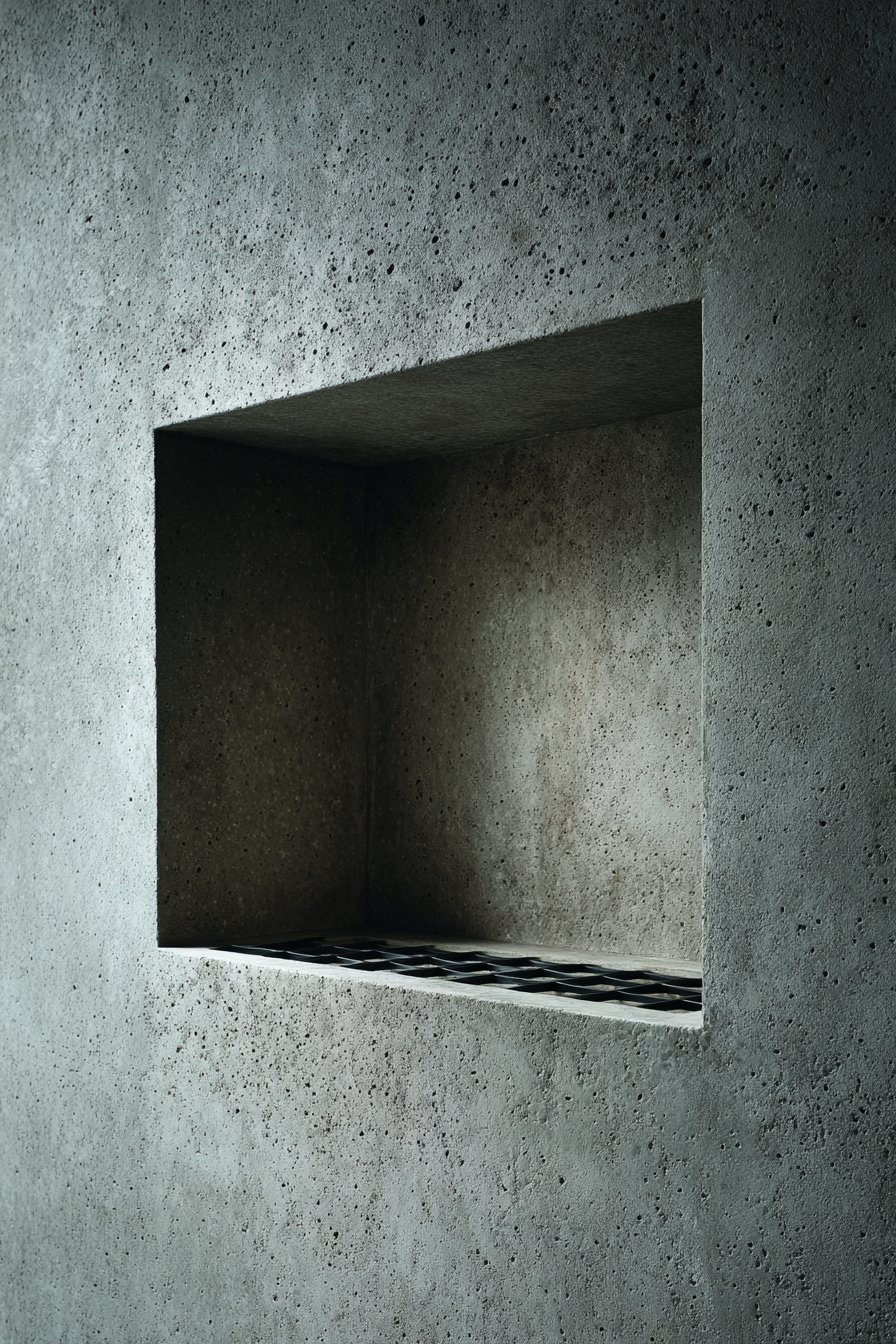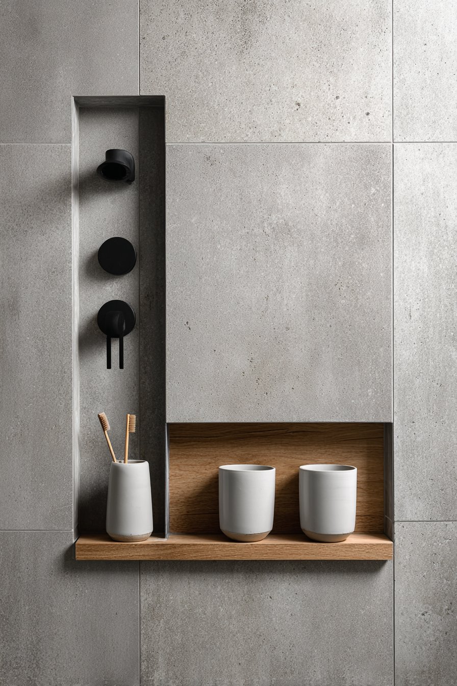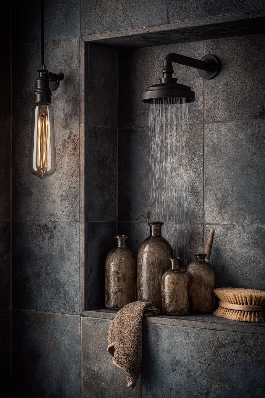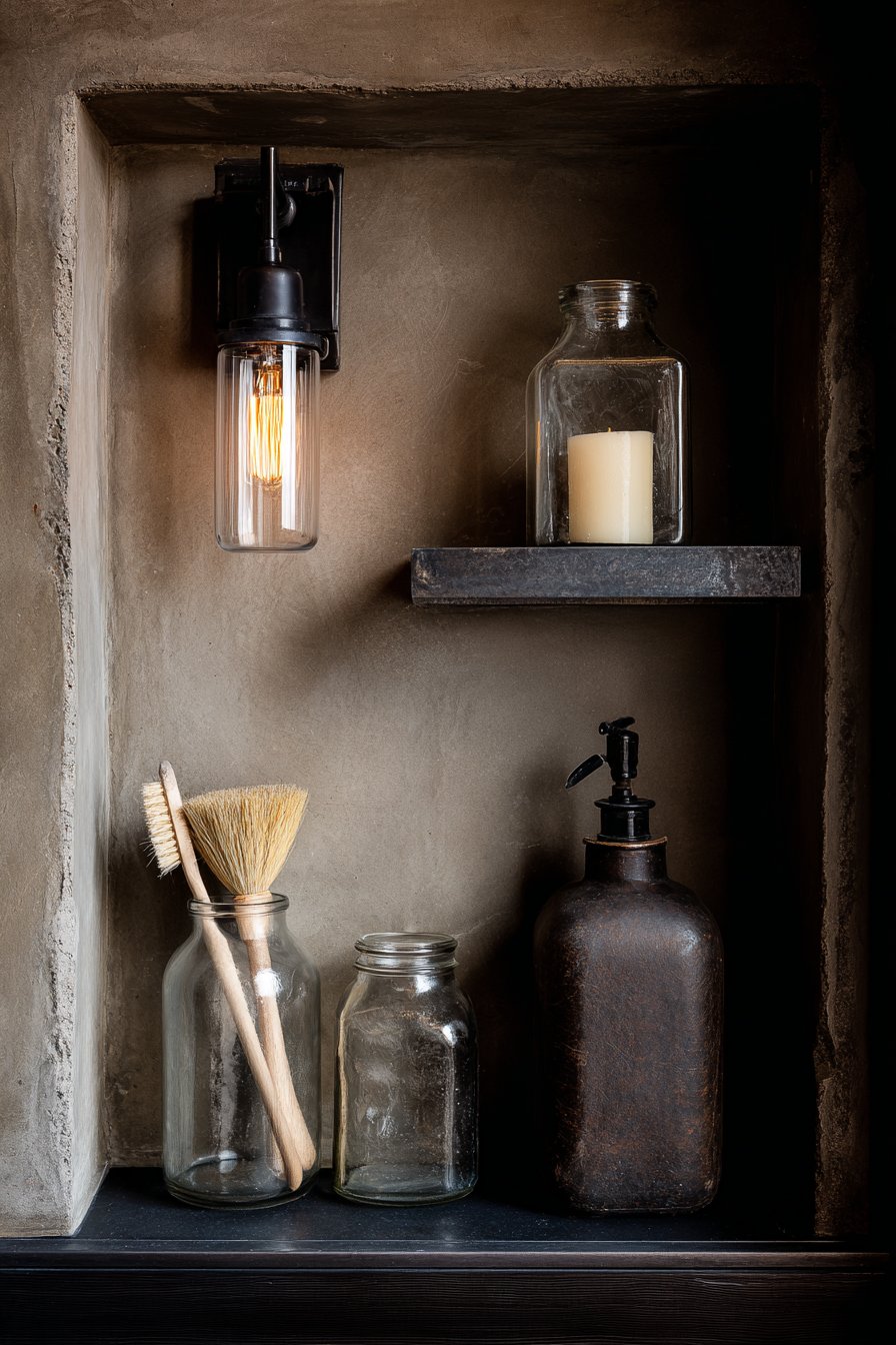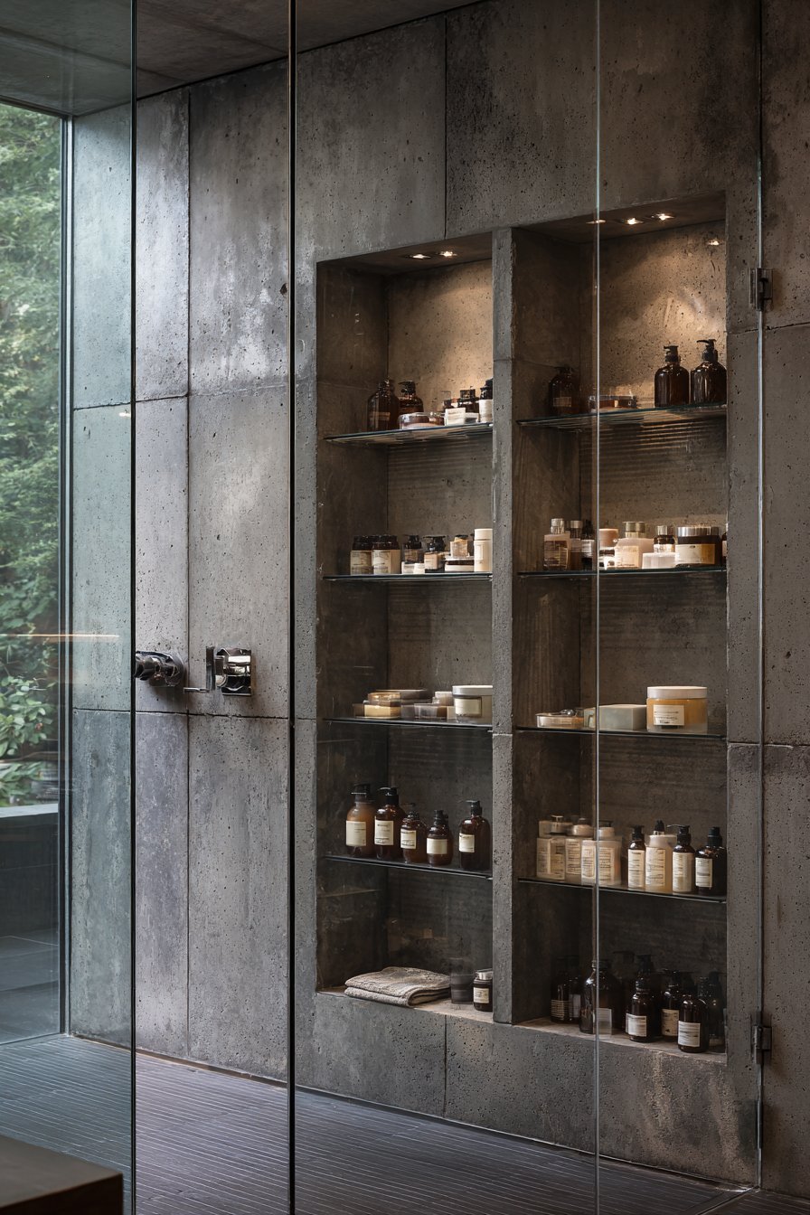 For those drawn to the honest materials and utilitarian beauty of industrial design, this concept embraces exposed concrete and raw steel with unapologetic authenticity. The niche features genuine exposed concrete with visible form marks that reveal the construction process, paired with a raw steel floating shelf that will develop natural patina over time. Matte black fixtures and an Edison-style bulb sconce create urban loft atmosphere, while glass apothecary bottles and natural bristle brushes complete the masculine, unadorned aesthetic.