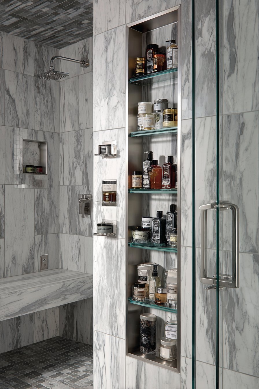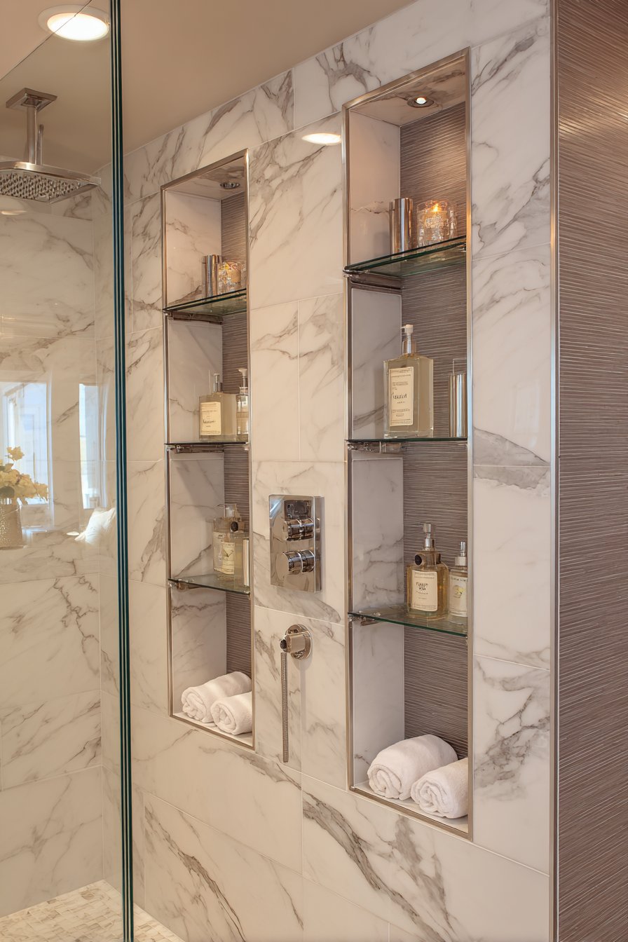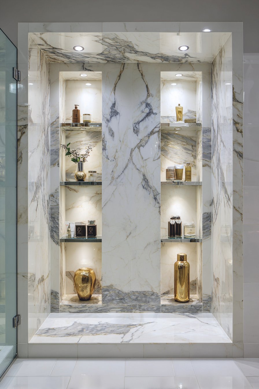 When budget allows for premium materials and dramatic design gestures, the floor-to-ceiling vertical niche column delivers unparalleled impact. This luxurious concept showcases book-matched white marble with dramatic grey veining arranged to create mirror-image symmetry that emphasizes the natural beauty of the stone. Multiple shelves positioned at varying heights display high-end bath products in coordinating glass containers, while surrounding shower walls feature large marble slabs with waterfall edges that extend the luxury throughout the entire enclosure.