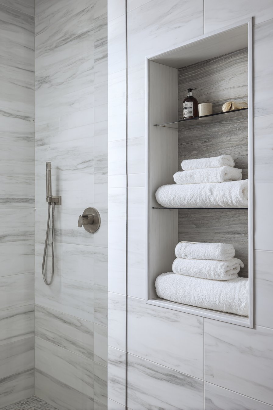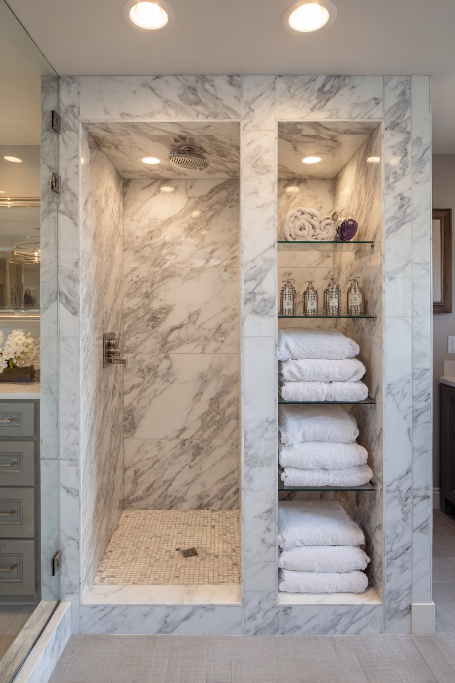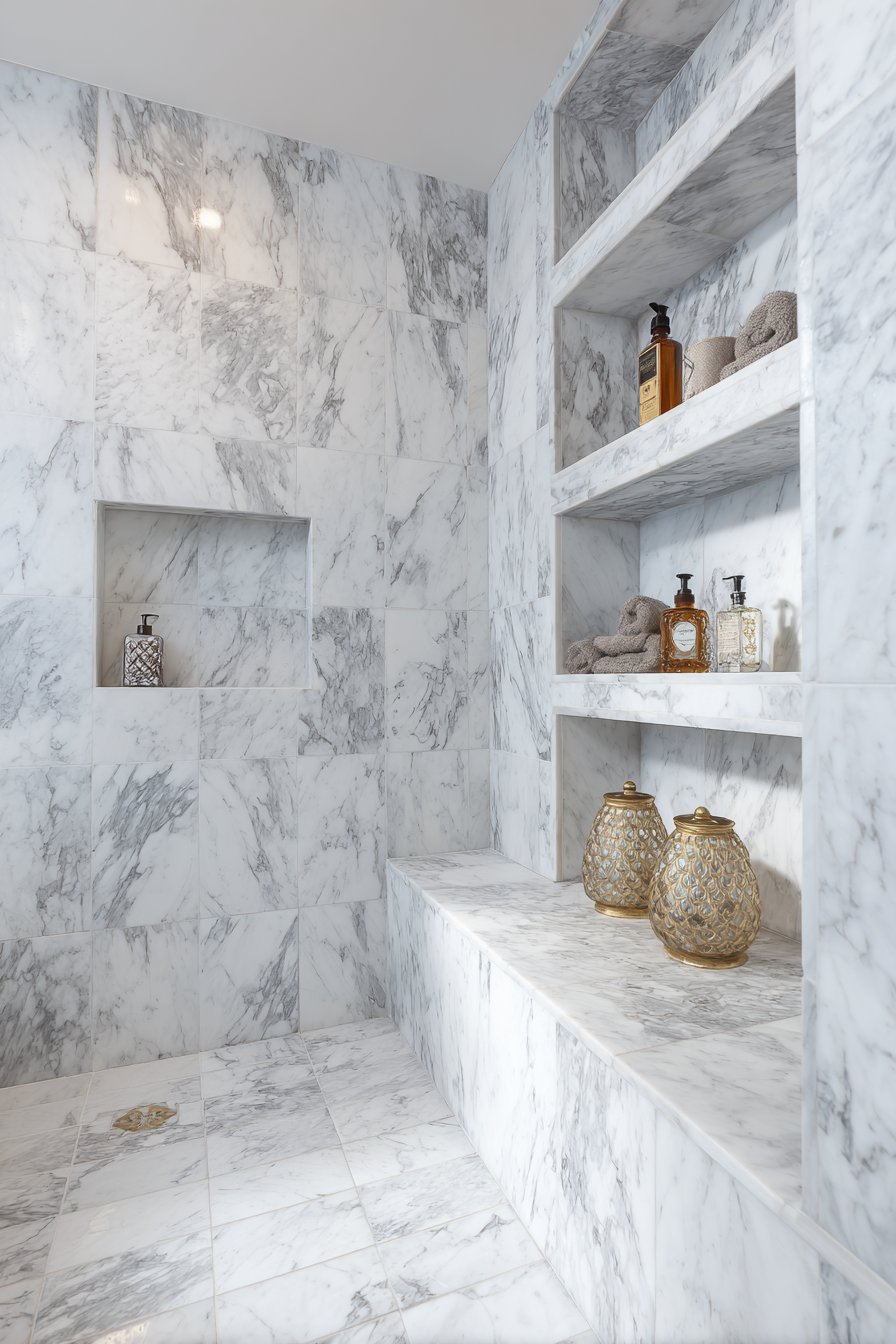 When budget allows for premium materials and dramatic design gestures, the floor-to-ceiling vertical niche column delivers unparalleled impact. This luxurious concept showcases book-matched white marble with dramatic grey veining arranged to create mirror-image symmetry that emphasizes the natural beauty of the stone. Multiple shelves positioned at varying heights display high-end bath products in coordinating glass containers, while surrounding shower walls feature large marble slabs with waterfall edges that extend the luxury throughout the entire enclosure.