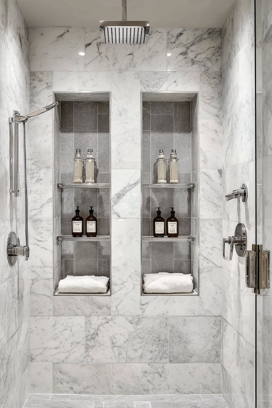 Symmetry creates a sense of order and calm that the human eye finds inherently pleasing, and positioning niches on either side of the valve creates natural balance that feels right even if you can’t articulate why. This layout also offers practical advantages—separating products between two niches (perhaps his-and-hers, or body care versus hair care) keeps items organized and easy to locate. The identical sizing and positioning on both sides prevents any visual imbalance that might make the shower feel tilted or awkward.