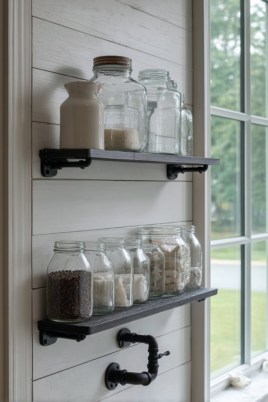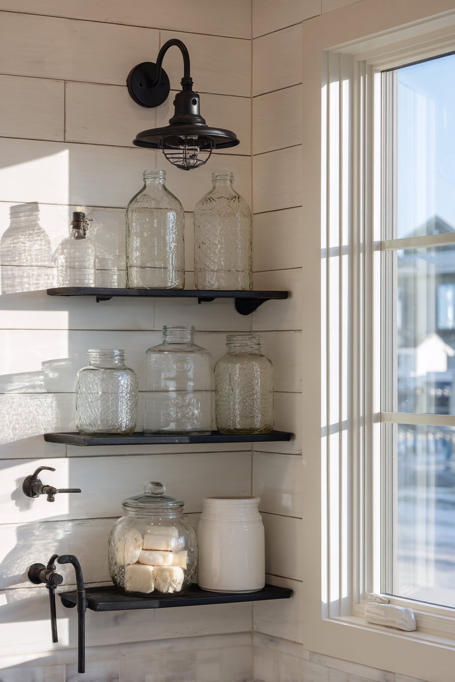 The selection of accessories reinforces the rustic modern aesthetic—natural fiber elements like sisal or jute add organic texture, while amber glass bottles provide vintage character with their warm, honey-colored transparency. The black metal wire basket organizers bridge rustic and industrial design vocabularies, offering practical organization with an appropriately casual, unfussy appearance. This layered approach to materials and finishes demonstrates how successful design often comes from thoughtful contrast rather than perfect matching.