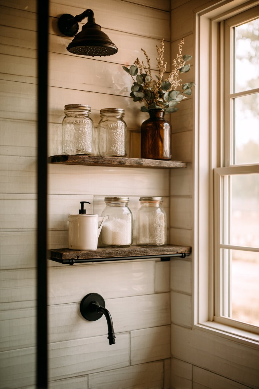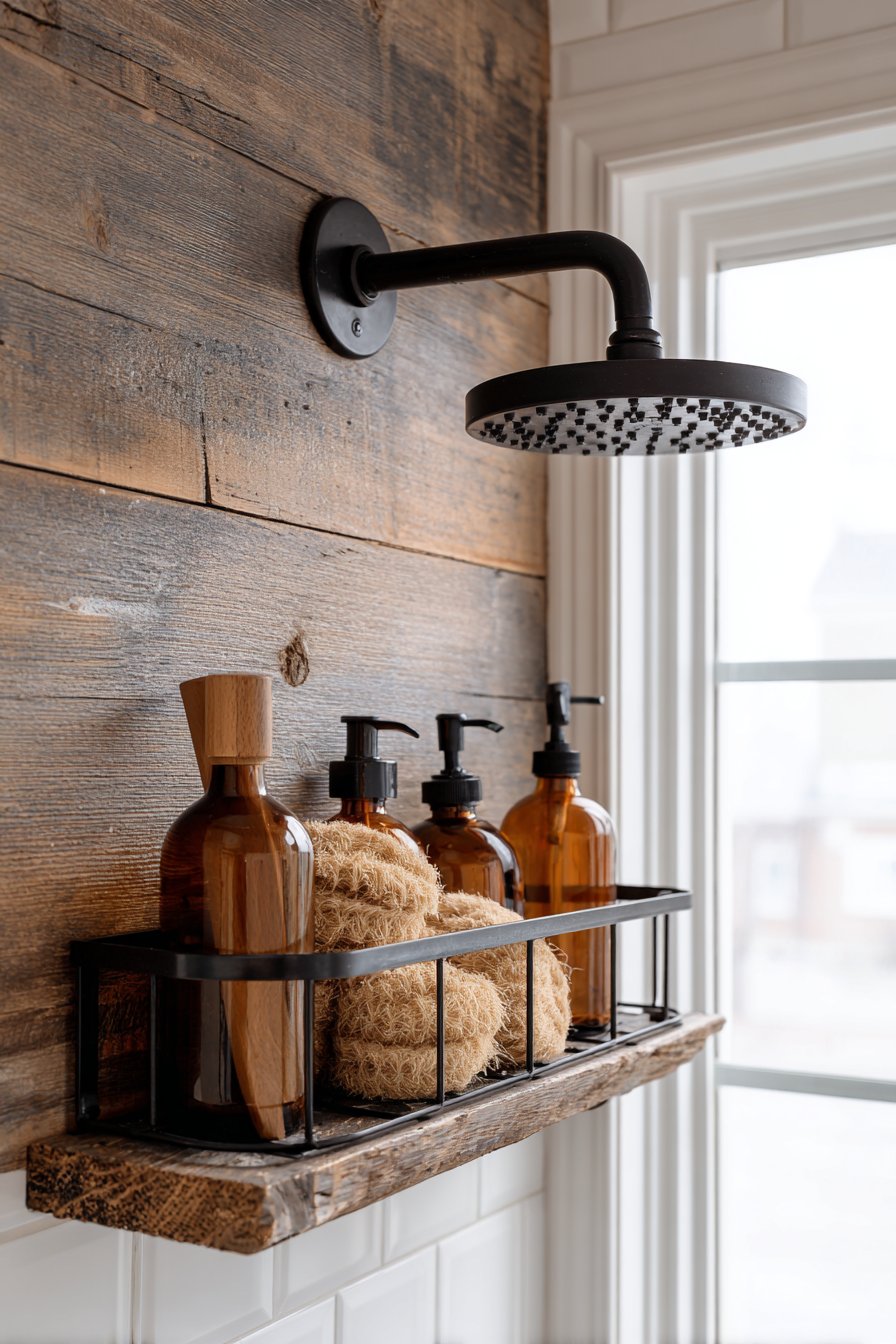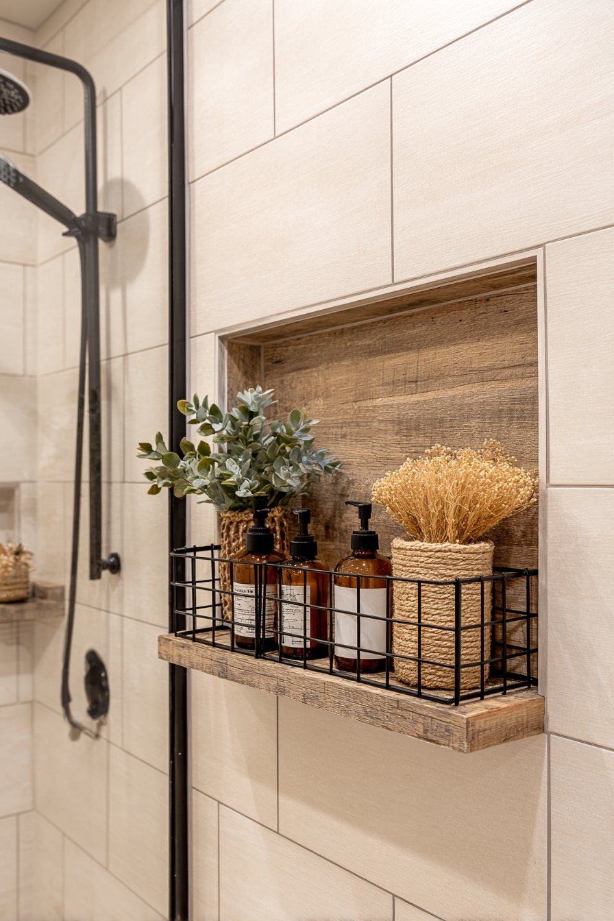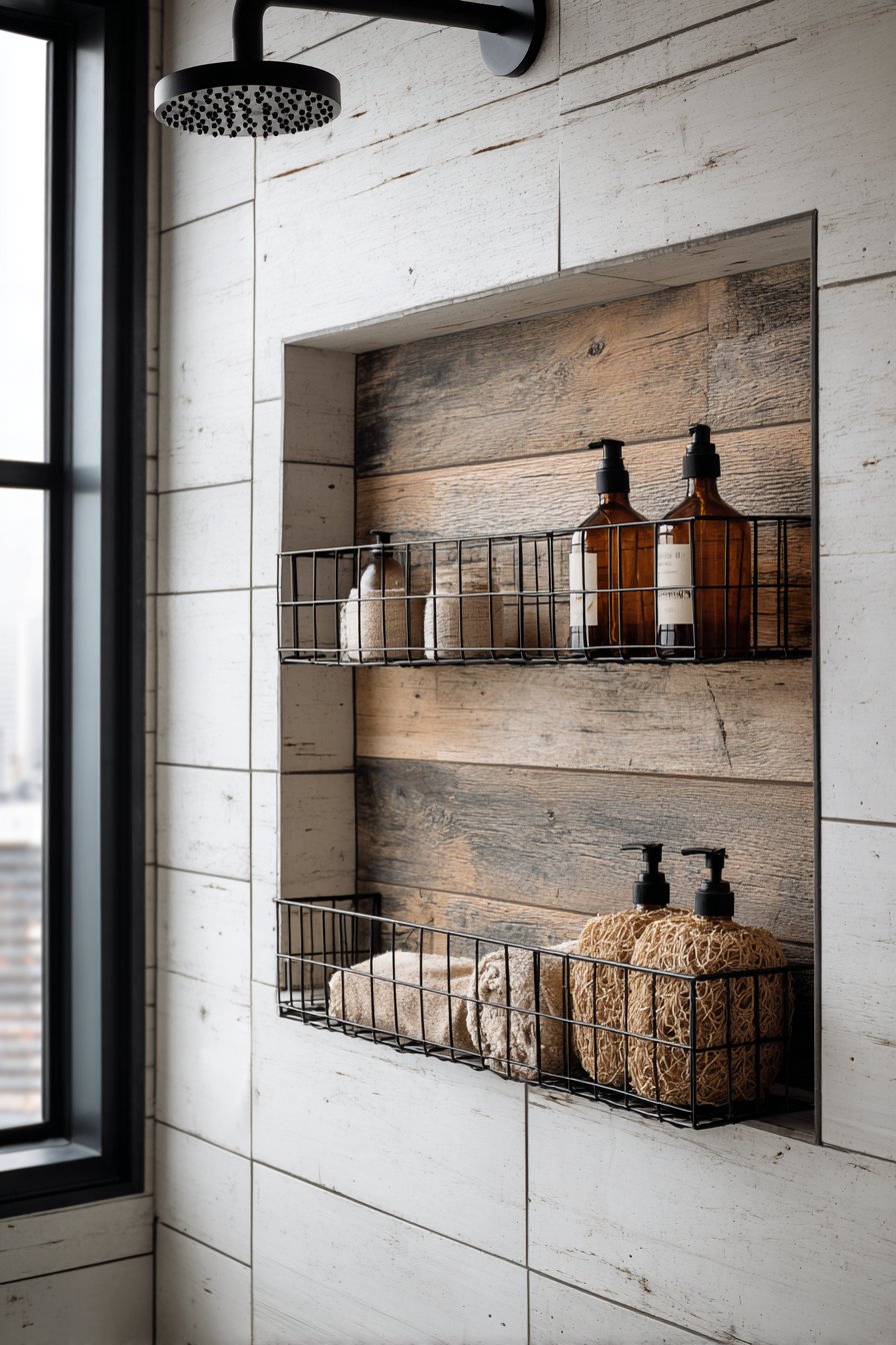 The marriage of rustic warmth and modern cleanliness creates spaces that feel both welcoming and current. This design features a horizontal niche with reclaimed wood-look porcelain tile backing that contrasts beautifully against white shiplap-style wall tiles. Simple black metal wire basket organizers hold natural fiber accessories and amber glass bottles, while a matte black rainfall showerhead above creates vertical visual connection and cohesive design narrative throughout the shower space.