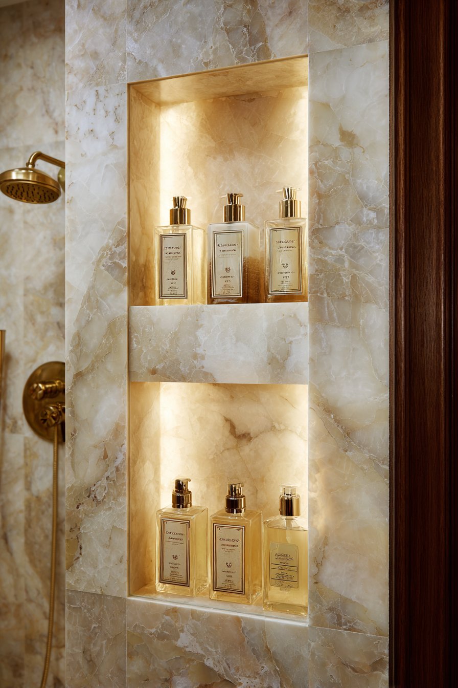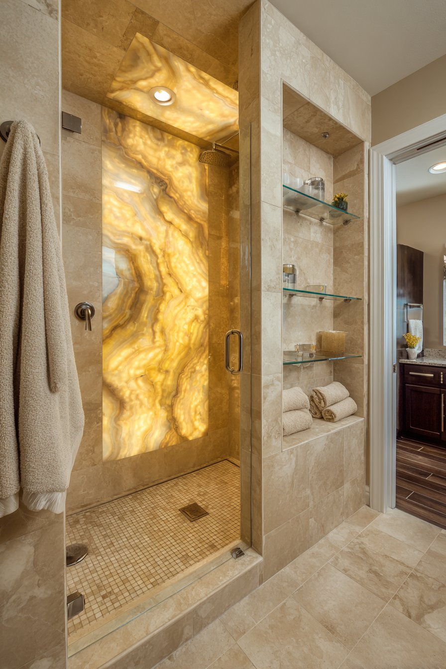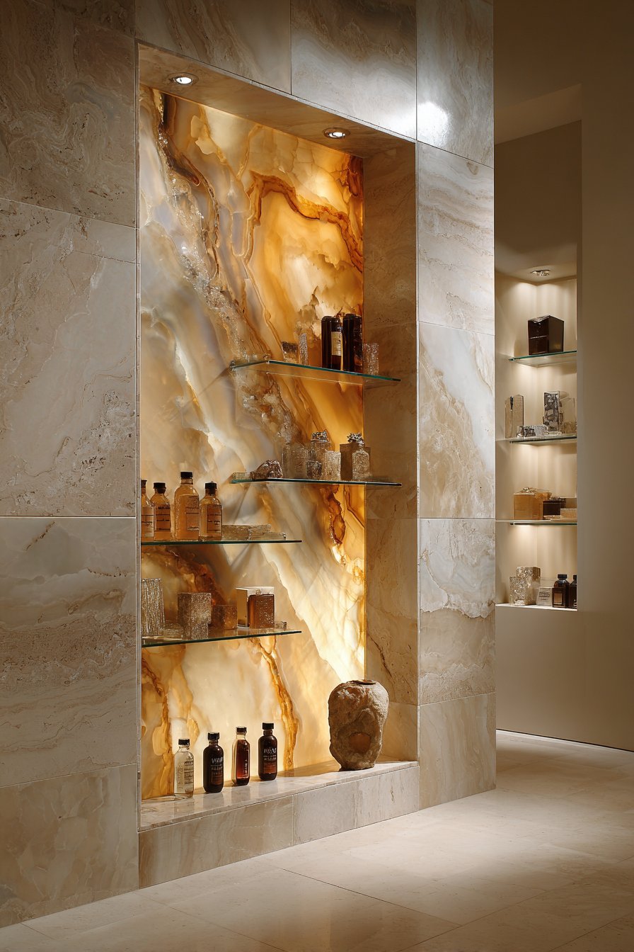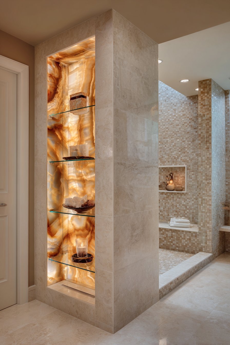 When the goal is creating a true showpiece that transcends functional storage to become sculptural art, backlit onyx delivers unmatched drama. This full-height vertical niche features thin onyx stone panels lit from behind, creating a glowing amber focal point that becomes the bathroom’s centerpiece. Floating glass shelves hold minimal high-end products while allowing light to pass through unobstructed, and the surrounding coordinating beige limestone tiles provide neutral context that allows the illuminated onyx to star.