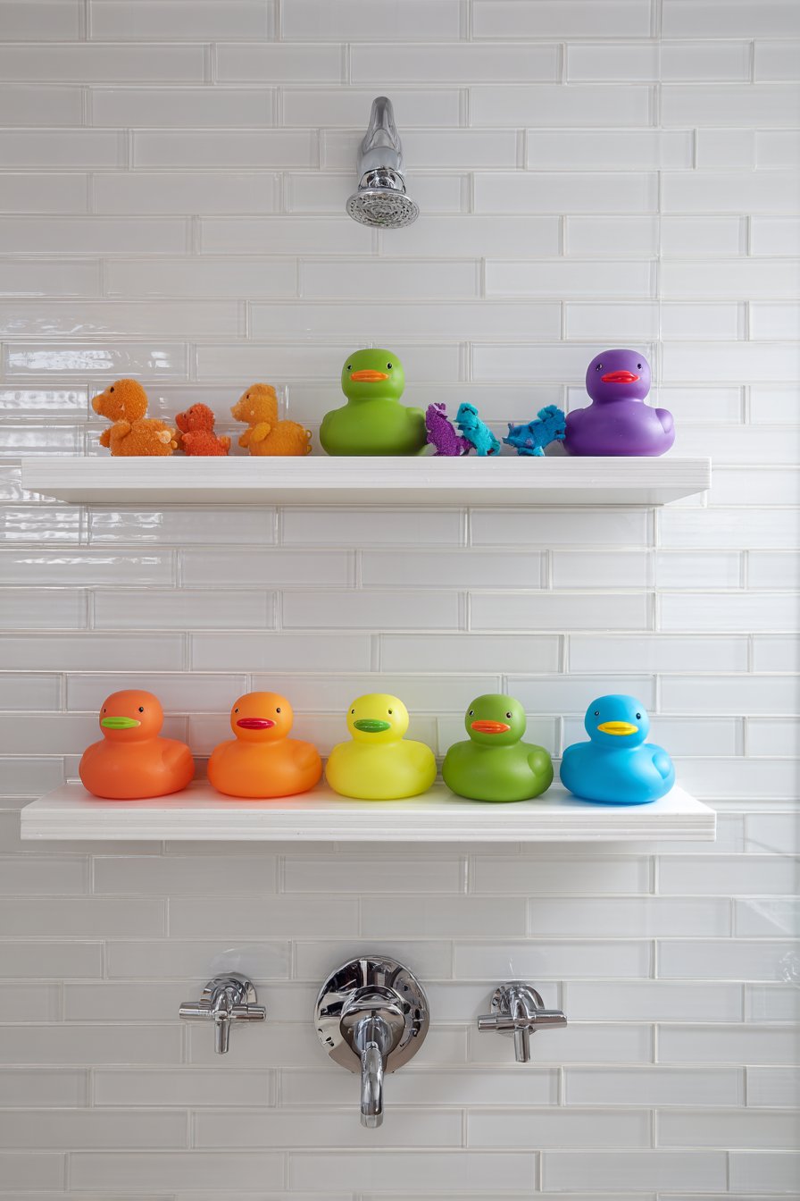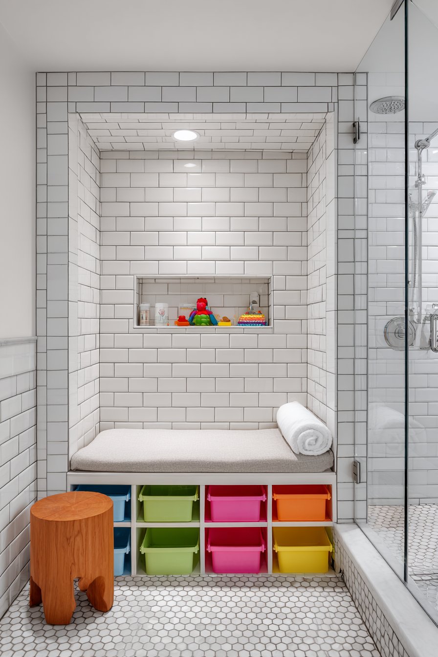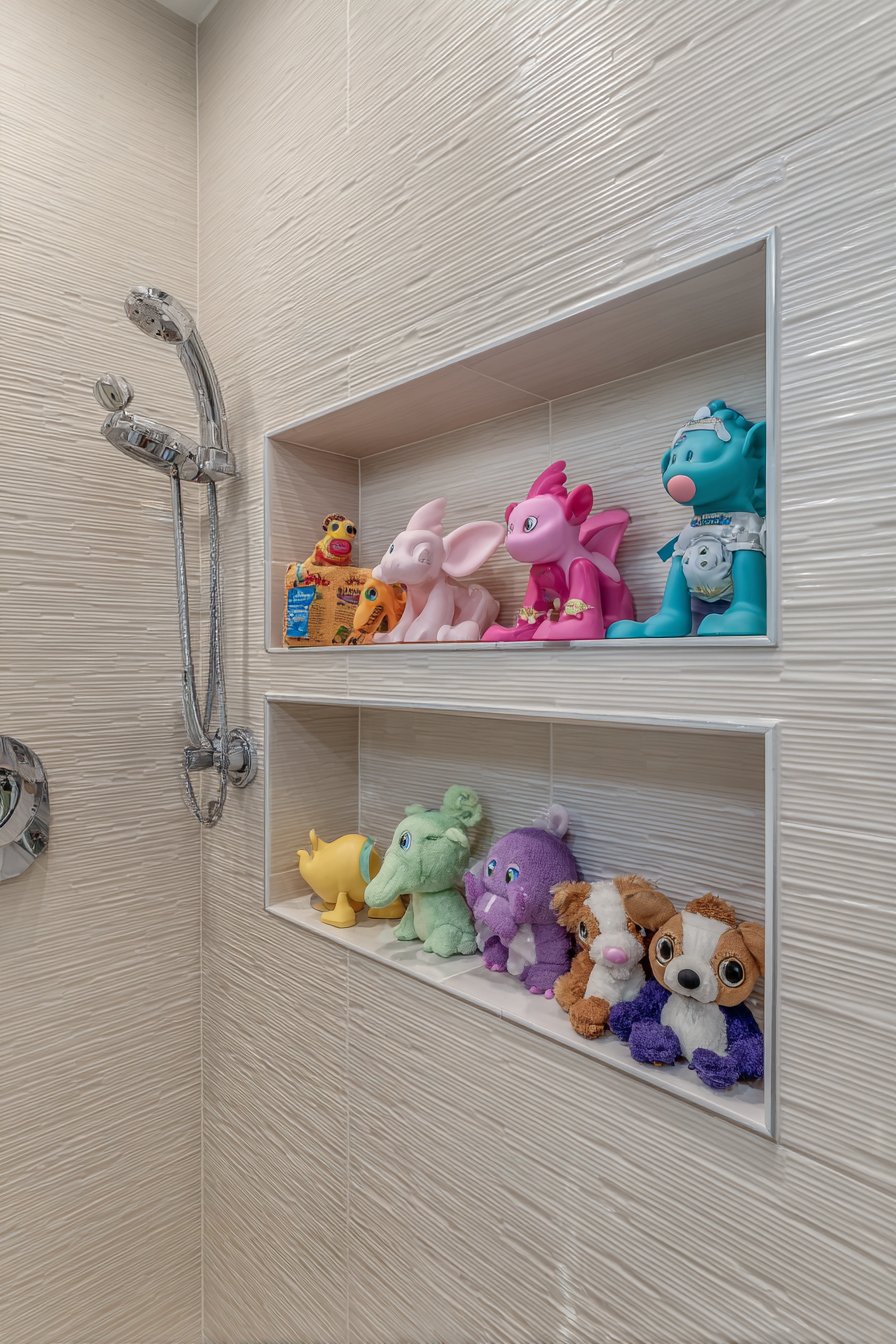 Silicone caddies represent smart material choice for family bathrooms—they’re essentially indestructible, easy to clean, dry quickly, and come in fun colors that appeal to children while adding playful personality to the space. The removable caddy approach allows easy cleaning of the niche itself while providing flexibility to rearrange or update as children’s needs change. The honest, straightforward design acknowledges real family life rather than pursuing an aspirational aesthetic that wouldn’t survive actual use.