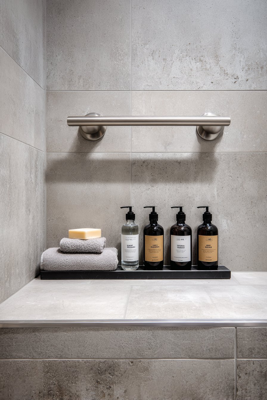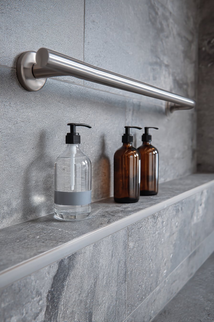 Thoughtful design considers all users regardless of age or ability, and this accessible shower niche demonstrates how universal design principles create spaces that work for everyone. The long horizontal niche positioned at seated height (approximately 24-30 inches) features slip-resistant textured grey porcelain tile and coordinates with grab bars integrated nearby in matching finish. Clear bottles with pump dispensers ensure easy access for users with limited grip strength or dexterity challenges, while the overall design maintains dignity and style rather than appearing institutional or medical.