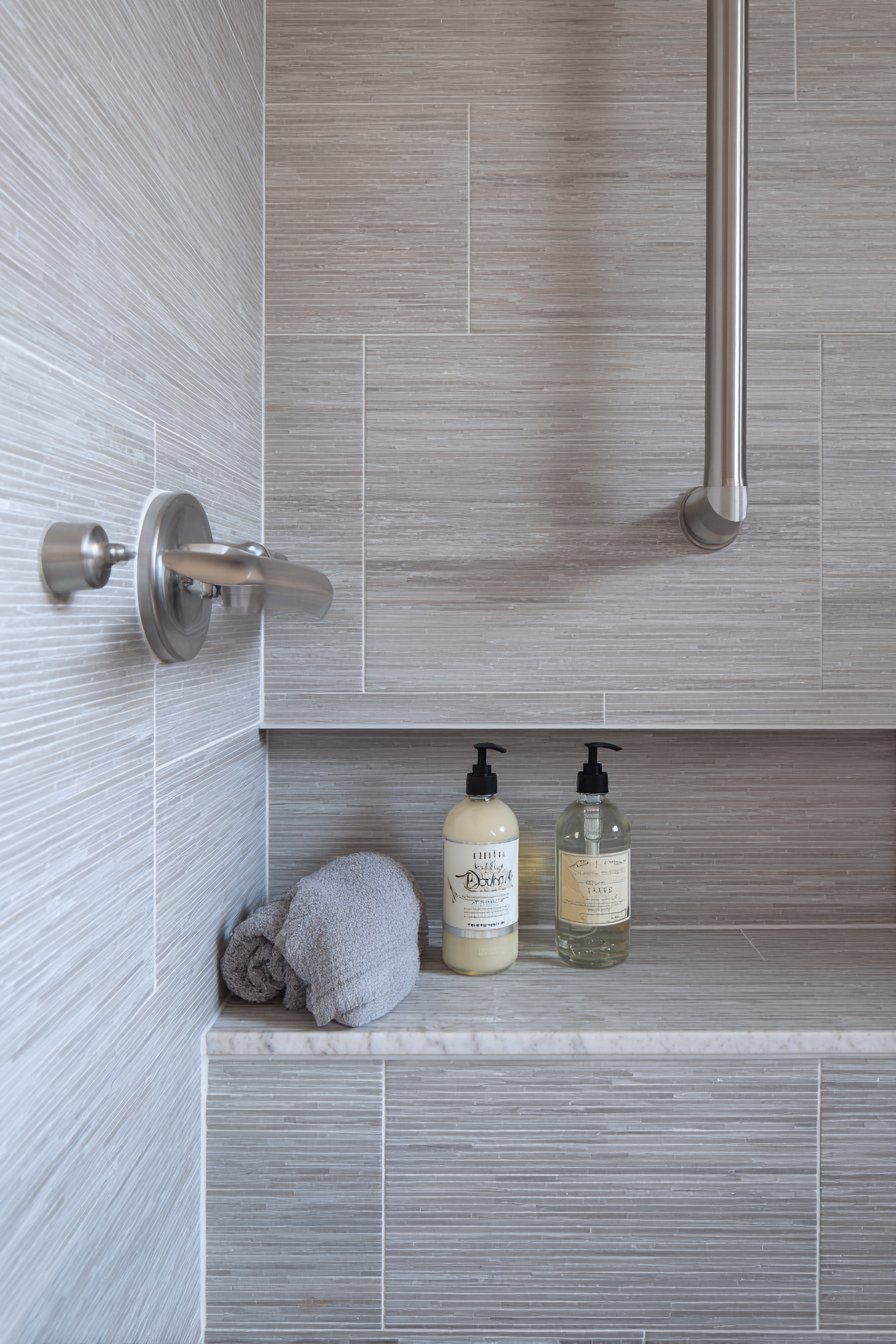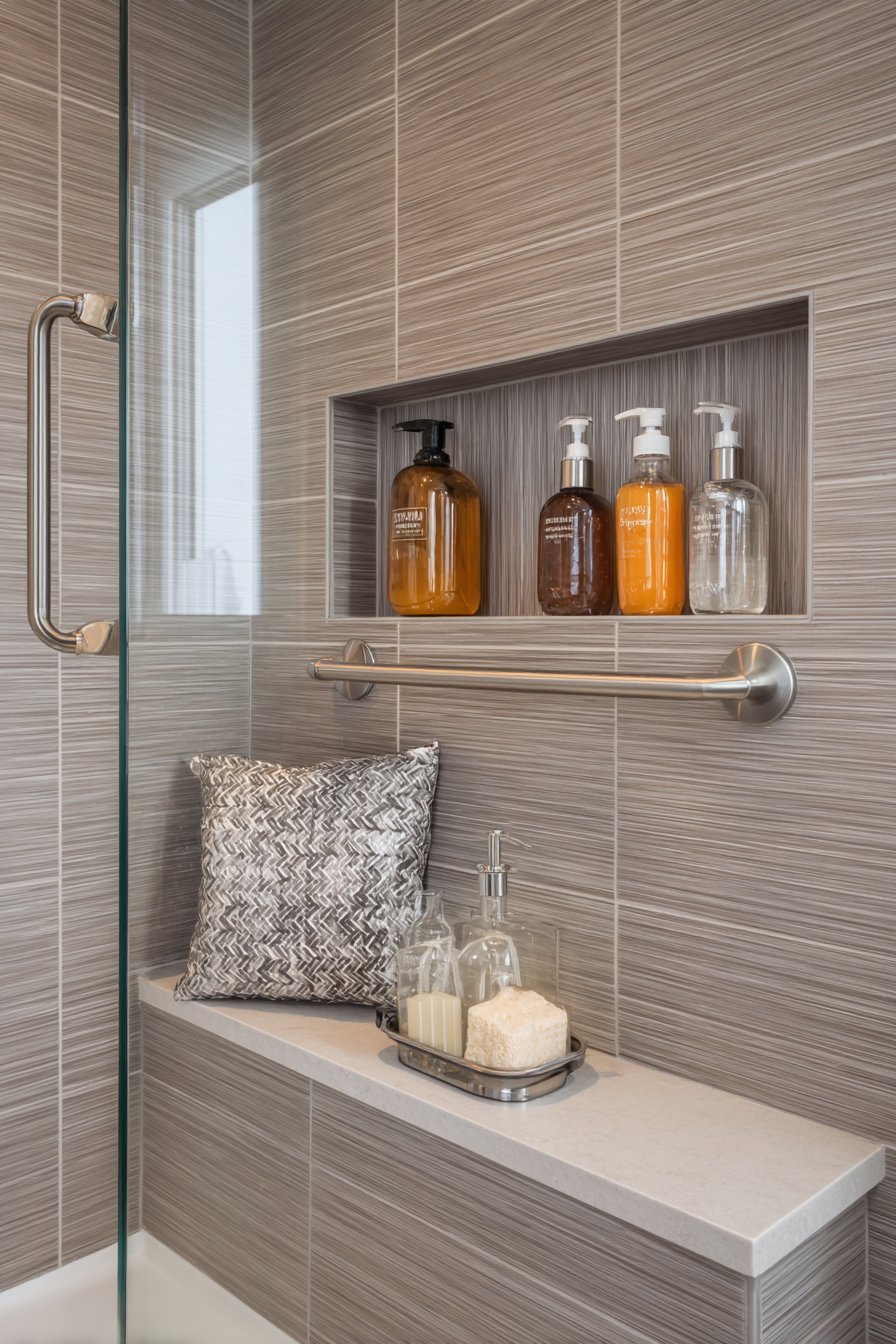 The coordination of grab bars and niche installation shows integrated planning rather than afterthought additions. When grab bars match the niche surround and fixtures in finish and style, they become design elements rather than obvious safety equipment. The pump dispenser bottles eliminate the grip strength and manual dexterity required to open flip-top caps or squeeze bottles, benefiting users with arthritis, reduced hand function, or weakness while also providing convenience for able-bodied users with soapy hands.