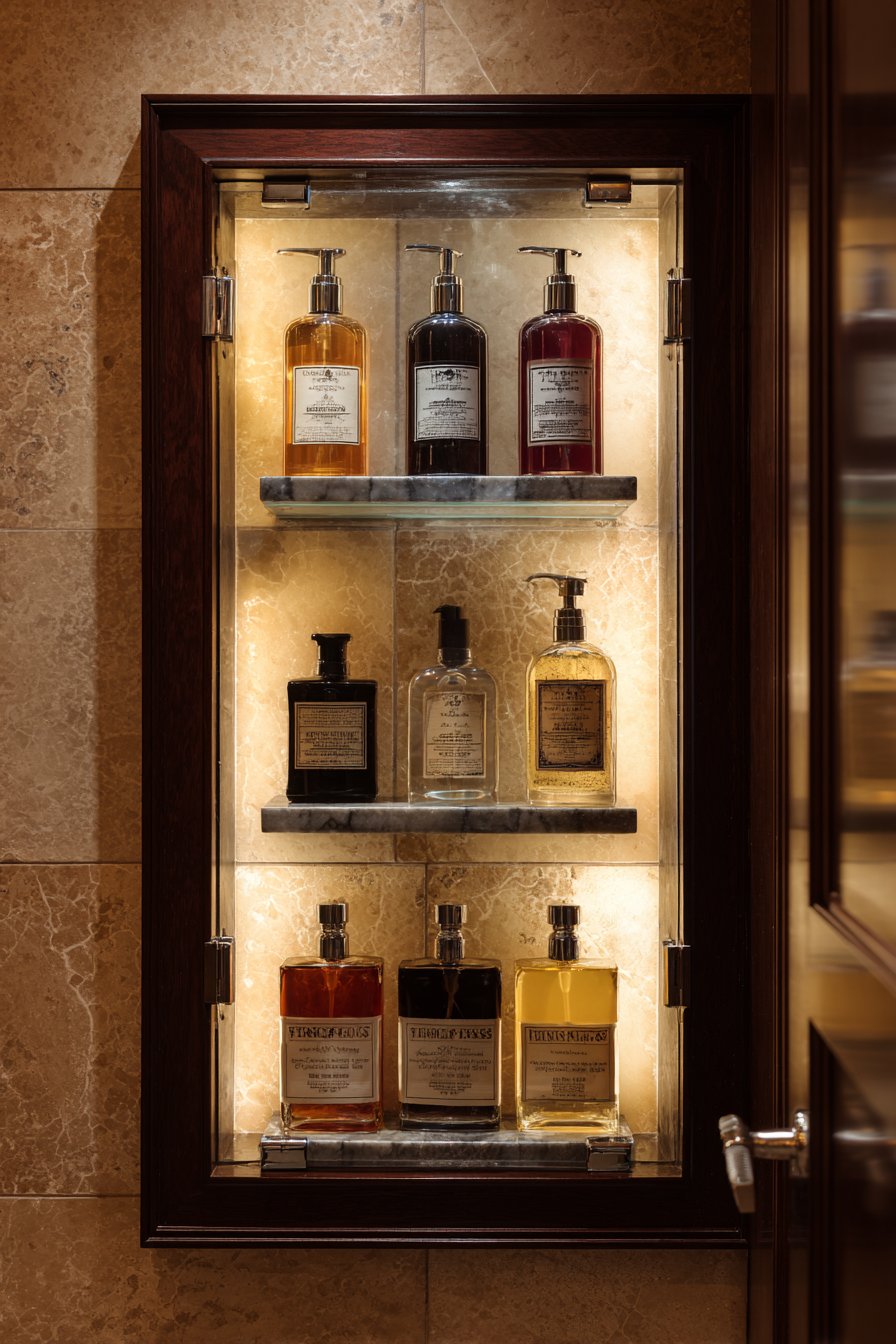 Hospitality design offers lessons in creating memorable experiences through thoughtful details and elevated finishes. This boutique hotel-inspired niche features a narrow vertical design with a backlit frosted glass panel and floating marble shelves displaying luxury amenity bottles with custom labels. Polished chrome rainhead and handheld fixtures create a comprehensive spa experience, while the curated presentation transforms everyday products into something special that makes users feel pampered and valued.