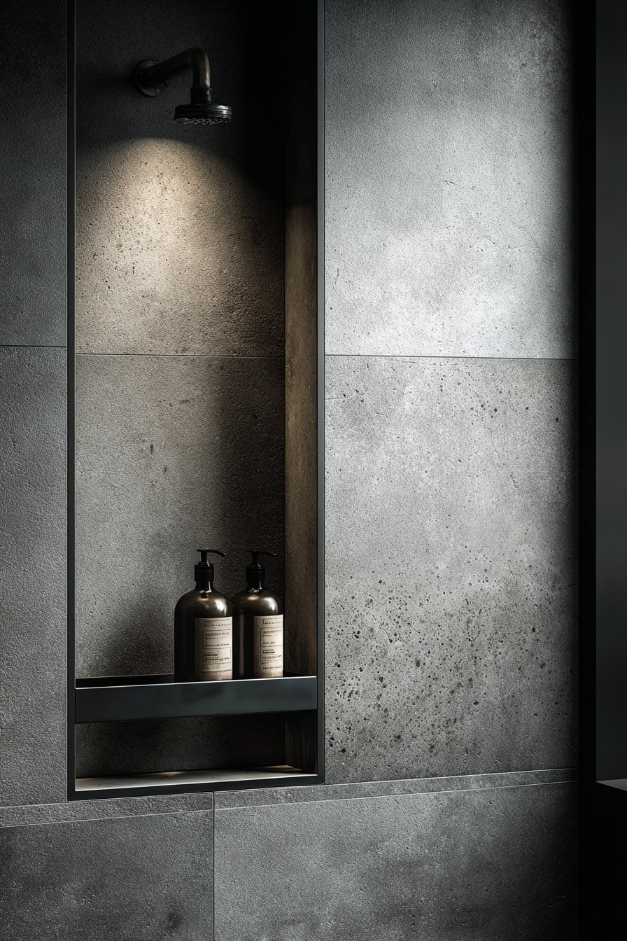 For those drawn to raw, honest materials and urban loft aesthetics, the concrete-look porcelain niche offers industrial appeal with practical maintenance advantages. This design features a single deep square niche carved into seamless grey concrete-effect walls, creating a monolithic appearance that celebrates material authenticity. The matte black metal corner caddy provides organized storage while reinforcing the industrial design vocabulary, and the substantial depth of the niche accommodates larger bottles and even folded washcloths.