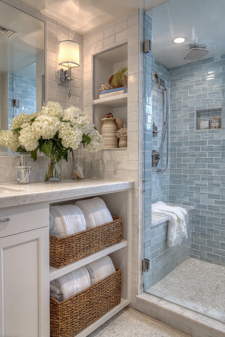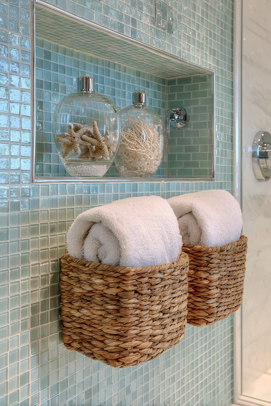 Natural materials play a crucial role in authentic coastal design, and the woven baskets fulfill both aesthetic and functional purposes. They soften the hard tile surfaces with organic texture while providing convenient storage that can be easily removed for cleaning or seasonal updates. The basket approach also offers flexibility—you can swap contents seasonally or as your needs change without any permanent modifications to the tile work itself. This adaptability makes the design practical for long-term use as your storage requirements evolve.