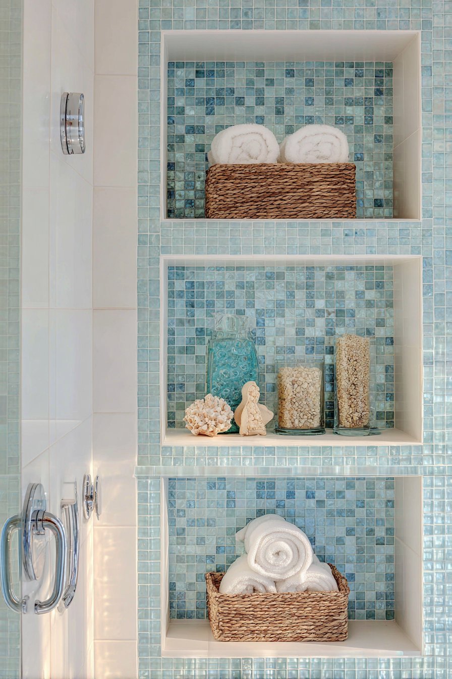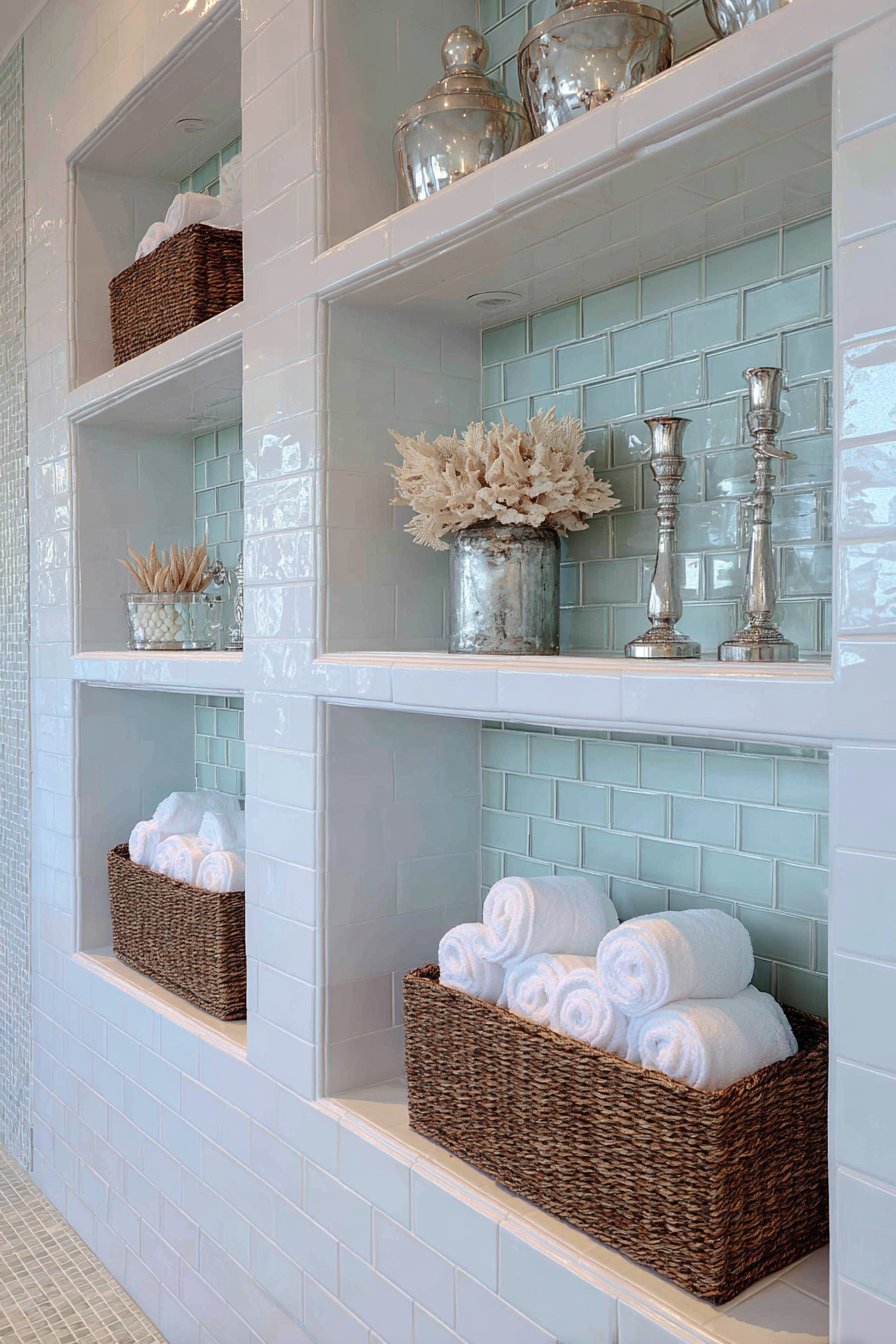 Drawing inspiration from seaside retreats and beach house living, this coastal-themed niche design brings vacation vibes into everyday life. Two horizontal niches feature classic white beveled subway tile with light aqua glass mosaic tile backing that evokes ocean waters and sea glass. Natural woven baskets nestle within the niches, holding rolled white towels and beach-inspired accessories that reinforce the coastal narrative. Polished chrome fixtures reflect available light while maintaining the bright, airy quality essential to successful coastal design.