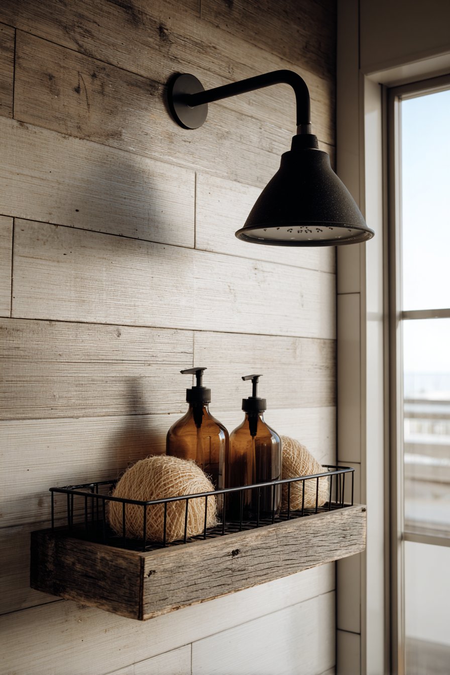 Wood-look porcelain represents a triumph of tile technology, capturing the warmth, grain patterns, and color variations of authentic reclaimed wood while providing the waterproof, low-maintenance properties essential for shower environments. The horizontal planking orientation of the niche backing creates visual interest and directional flow that guides the eye across the space, while the white shiplap surrounding tiles provide bright contrast that prevents the wood tones from feeling too heavy or dark.
