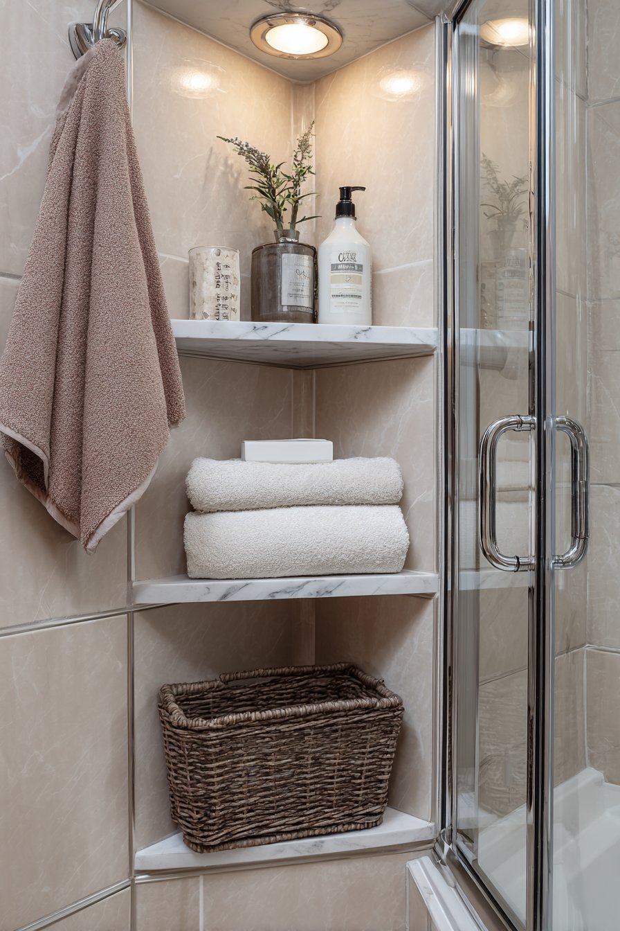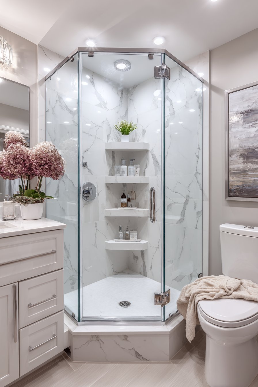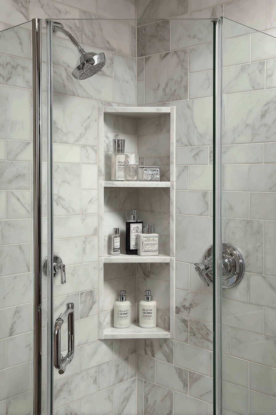 Small bathrooms demand creative solutions, and the corner-positioned triangular niche represents intelligent spatial planning at its finest. This compact design maximizes often-wasted corner space while providing essential storage without encroaching on the limited square footage of a small shower enclosure. The white marble-look quartz material offers the elegance of natural stone with enhanced durability and stain resistance, while chrome fixtures and clear glass shower doors maintain the open, airy feeling crucial to preventing small spaces from feeling cramped.