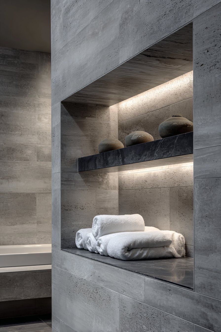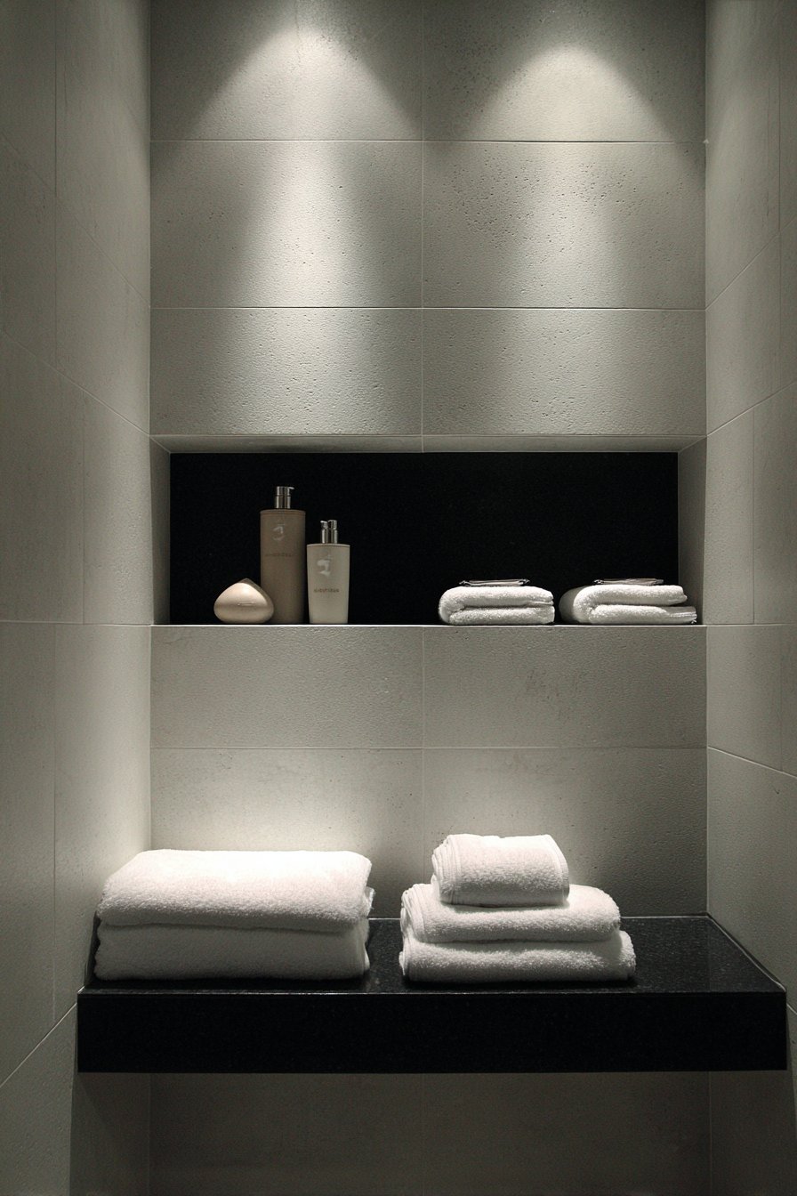 Creating a home spa experience requires careful attention to materials, lighting, and the overall sense of calm refinement. This design features a wide horizontal niche with honed black granite backing and integrated indirect LED lighting that creates a dramatic floating shelf effect. White rolled towels and minimalist stone accessories are artfully arranged like a high-end spa display, while surrounding walls use large white porcelain panels that provide clean contrast against the dark granite niche interior.