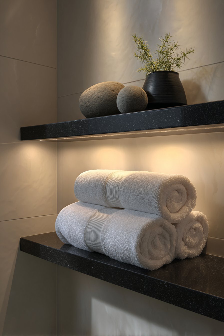 Honed granite—with its matte, non-reflective finish—offers sophisticated alternative to polished stone surfaces. The soft surface treatment creates subtle depth and prevents the black stone from appearing too harsh or shiny, contributing to the serene atmosphere essential to spa-inspired design. The indirect LED lighting positioned behind or beneath the granite creates the illusion that the dark shelf floats within the white wall, adding technological sophistication while providing gentle illumination that enhances the meditative quality of the space.