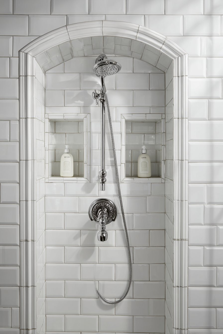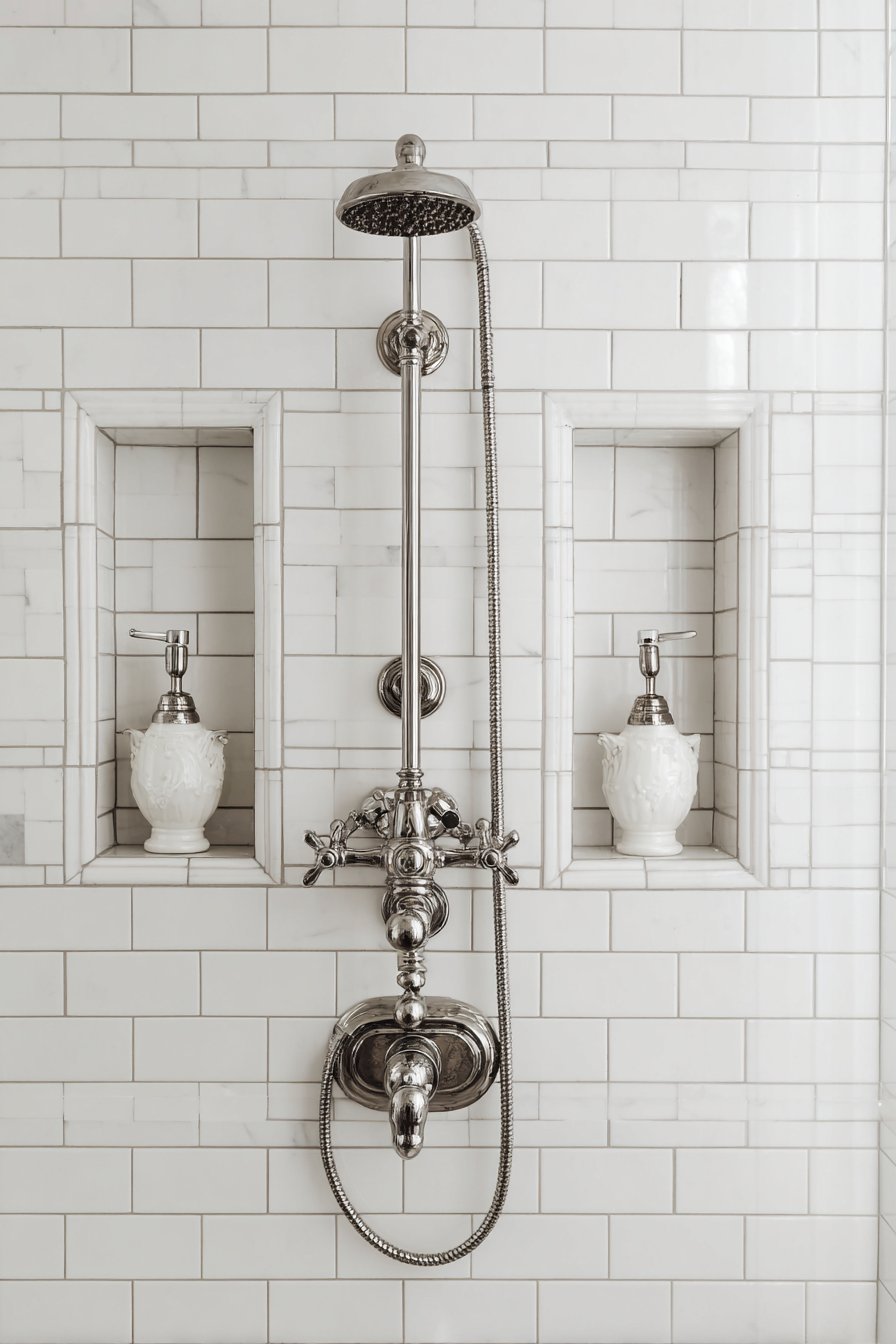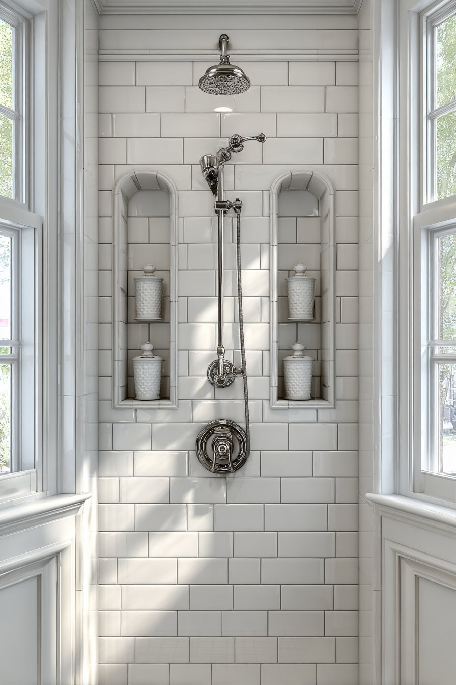 Classical design principles emphasize balance, proportion, and time-tested materials that never truly go out of style. This traditional approach features two symmetrical rectangular niches flanking a classic chrome thermostatic valve, creating a balanced composition that feels intentionally designed rather than arbitrarily placed. White ceramic subway tiles provide the foundation, with bullnose tile edge details that demonstrate craftsmanship and attention to finishing details. Matching white ceramic dispensers within each niche maintain the clean, cohesive appearance while polished chrome fixtures reinforce the traditional aesthetic.