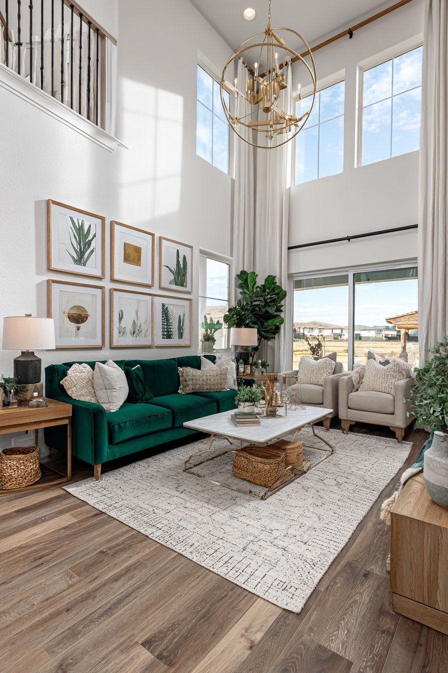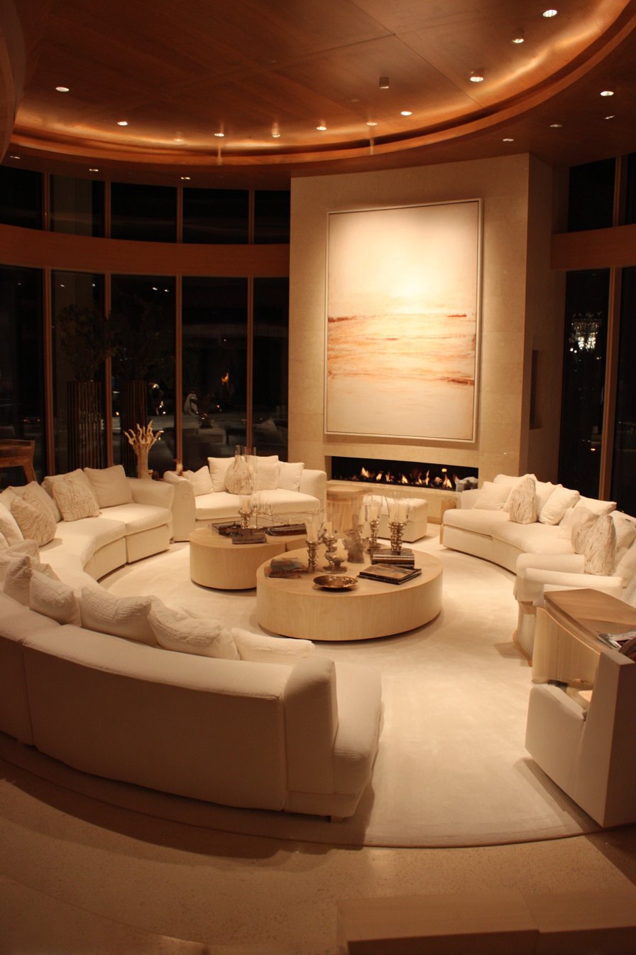 Key Design Tips: Select curved velvet sofas for their sculptural presence and luxurious comfort that elevates beyond standard linear forms. Choose brass and marble coffee tables to combine warm metals with cool stone in high-end material pairings. Install silk window treatments that demonstrate luxury through fabric quality and generous proportions. Invest in hand-knotted area rugs for their exceptional craftsmanship and intricate pattern work. Commission custom millwork to transform ordinary storage into architectural features worthy of luxury spaces.