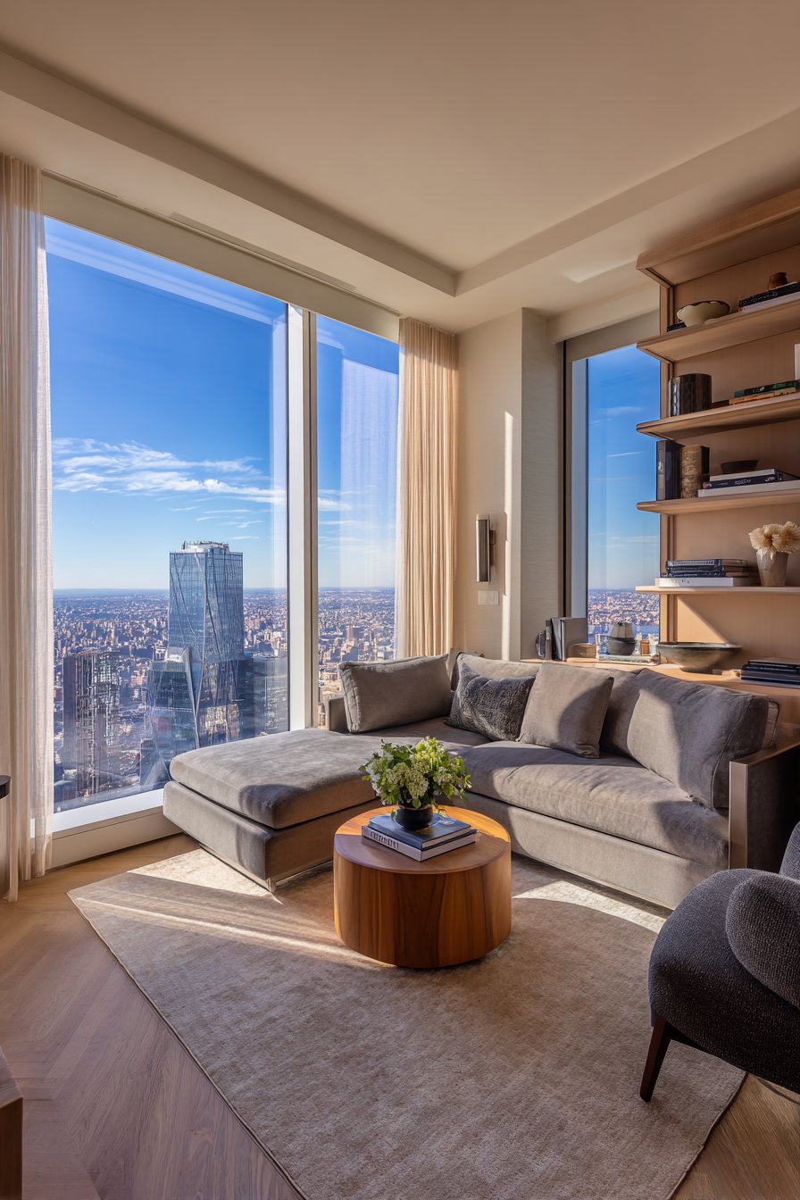 The neutral color palette punctuated with metallic accents—brushed steel, polished chrome, or warm brass—adds luminous interest without disrupting the sophisticated restraint. These metallic touches catch and reflect light, adding dynamic visual elements that change throughout the day. This contemporary sitting room demonstrates how disciplined material selection and attention to proportion can create spaces of refined urban elegance.