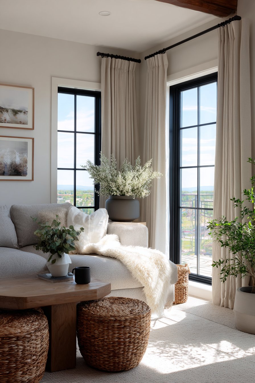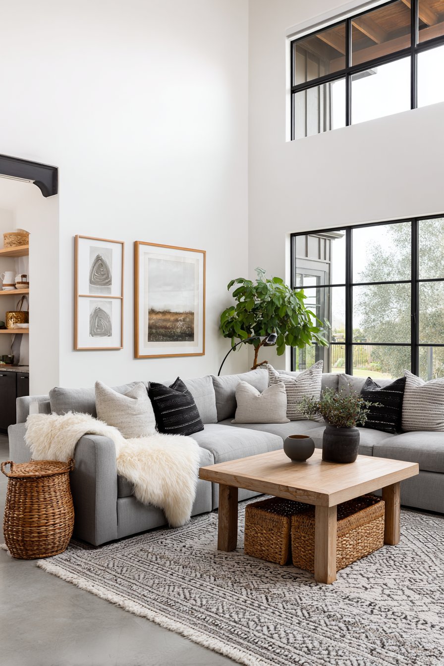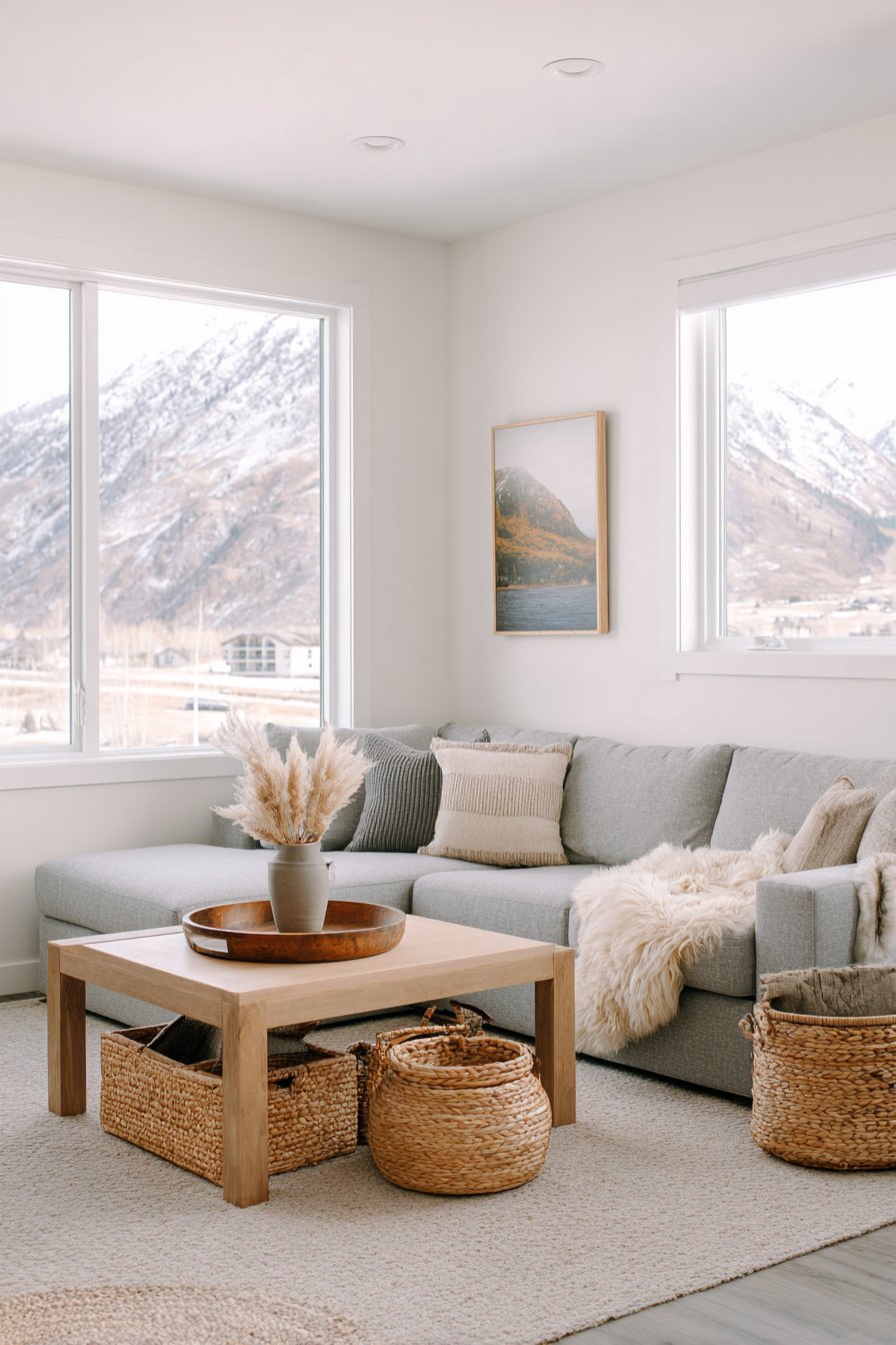 Key Design Tips: Choose modular sofas for their flexibility in arrangement and ability to adapt to changing needs and spatial configurations. Incorporate woven storage baskets beneath coffee tables to maintain visual cleanliness while keeping essentials accessible. Paint walls in pure white to maximize natural light reflection and create an expansive, airy feeling. Minimize window treatments on large windows to capitalize on natural daylight and maintain connection with outdoor views. Add sheepskin throws for tactile warmth and visual softness that invites touch and creates cozy moments.