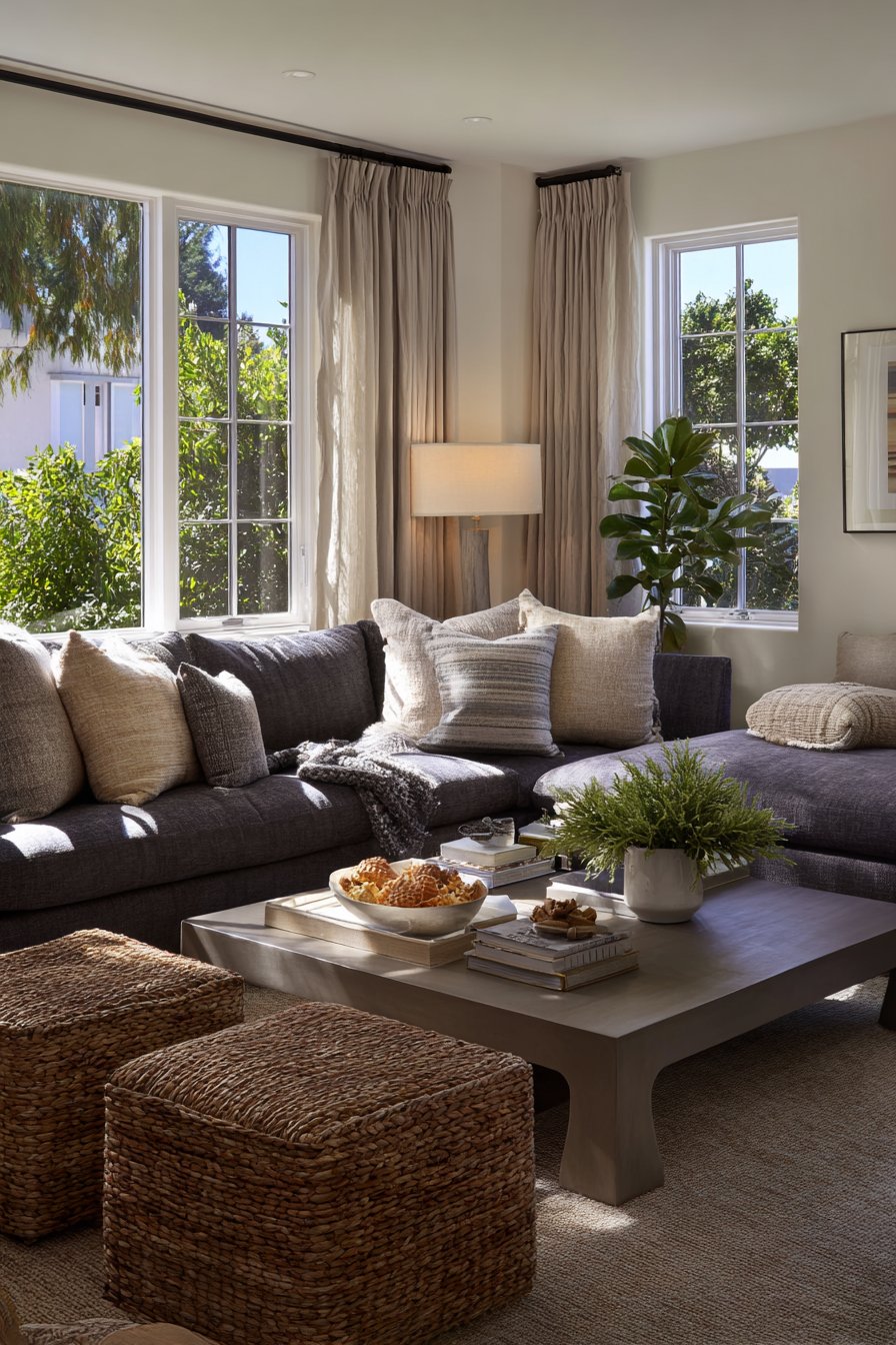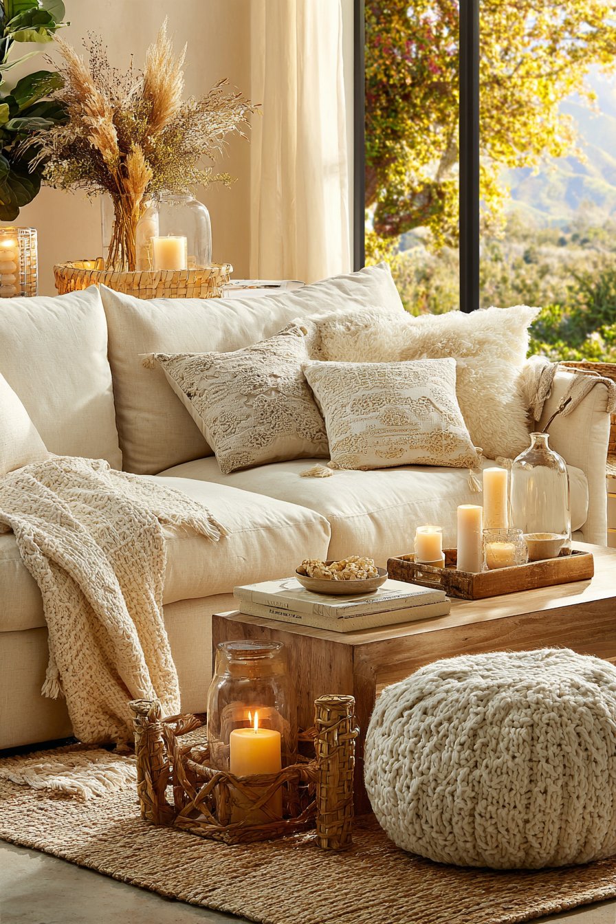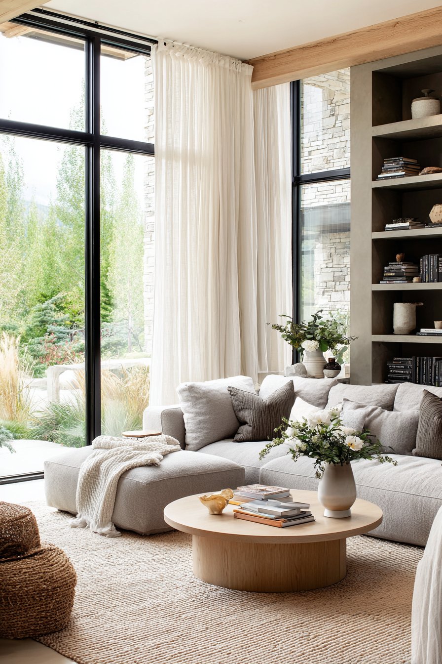 Key Design Tips: Choose modular sofas for their flexibility in arrangement and ability to adapt to changing needs and spatial configurations. Incorporate woven storage baskets beneath coffee tables to maintain visual cleanliness while keeping essentials accessible. Paint walls in pure white to maximize natural light reflection and create an expansive, airy feeling. Minimize window treatments on large windows to capitalize on natural daylight and maintain connection with outdoor views. Add sheepskin throws for tactile warmth and visual softness that invites touch and creates cozy moments.