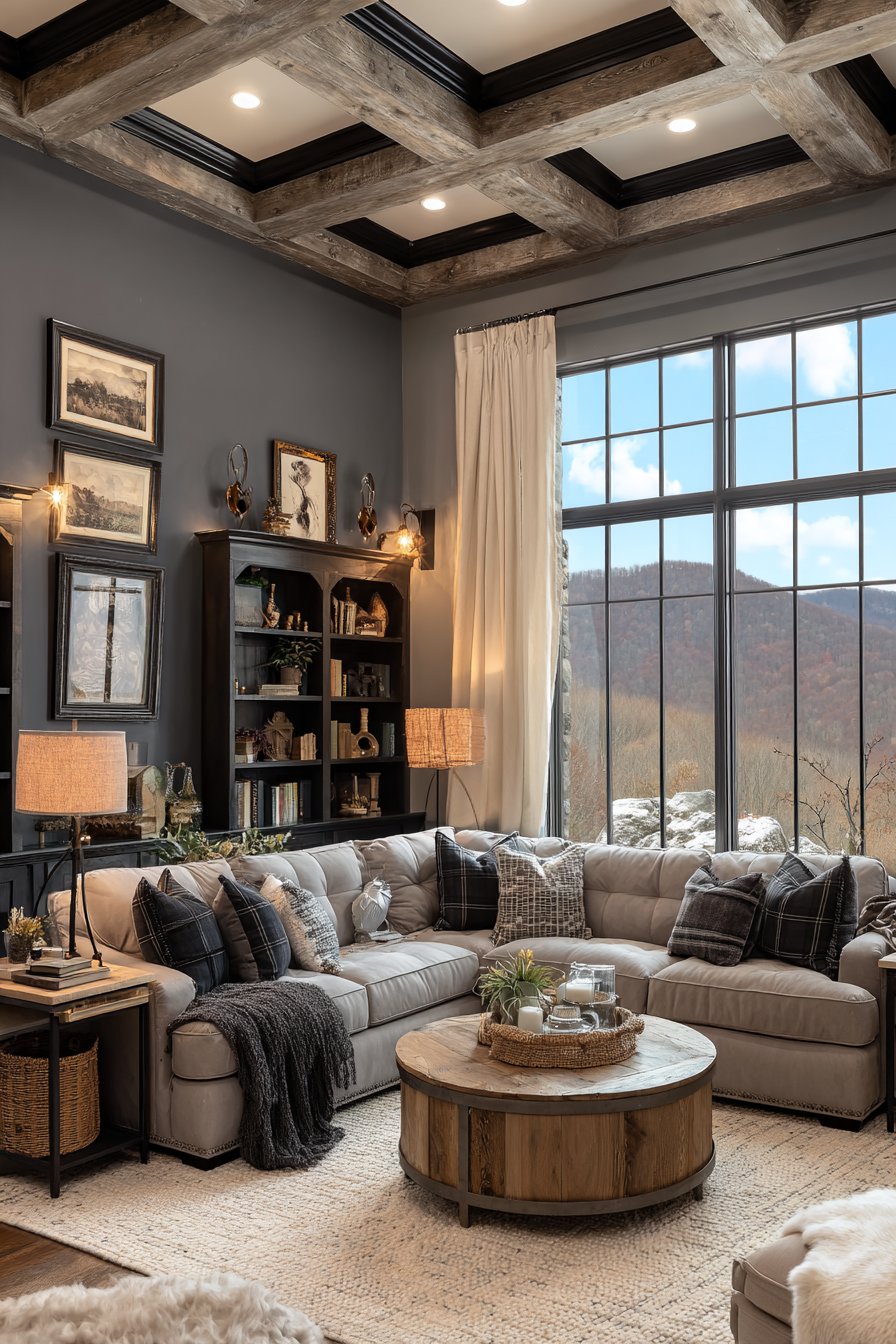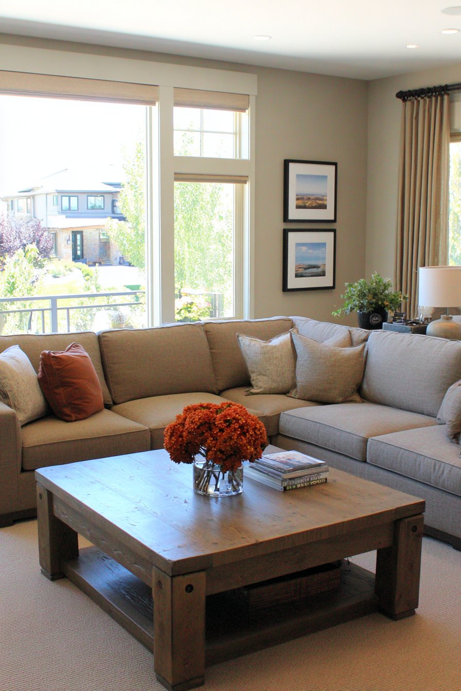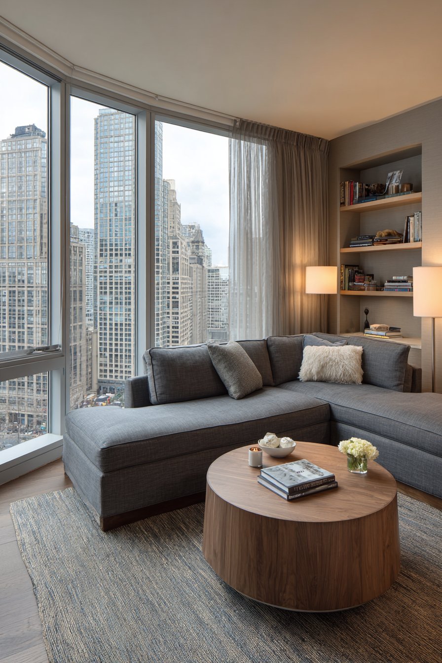A sitting room designed with comfort and conversation at its core features a warm grey sectional sofa that anchors the space with its inviting presence. The thoughtful arrangement creates an intimate atmosphere where guests naturally gravitate toward meaningful interaction. A round wooden coffee table, chosen for its accessibility from all seating positions, sits centered on a textured wool area rug that adds both visual warmth and acoustic softness to the room. The organic shape of the table encourages equal participation in conversations, eliminating the hierarchical feeling that rectangular tables can sometimes create.