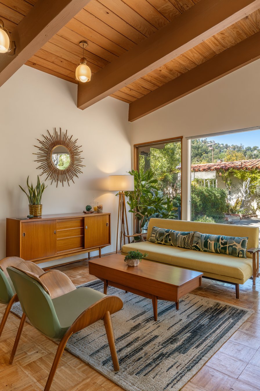 This sitting room celebrates the enduring appeal of mid-century modern design through its iconic furniture choices and period-appropriate aesthetic. A teak wood credenza provides essential storage while showcasing the beautiful wood grain and expert craftsmanship characteristic of 1950s and 60s furniture design. Iconic molded plastic chairs add sculptural presence and demonstrate the era’s fascination with innovative materials and forms.