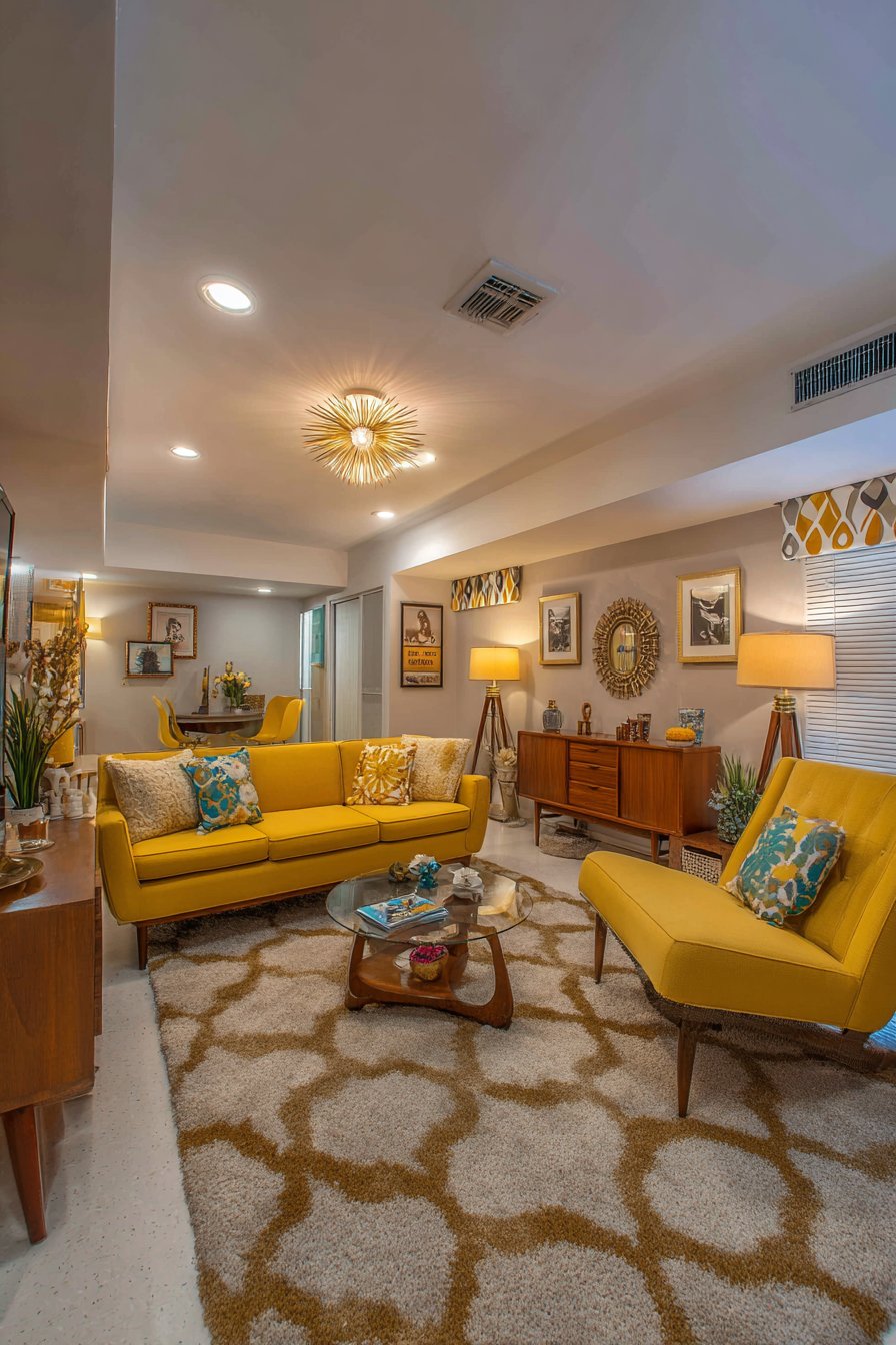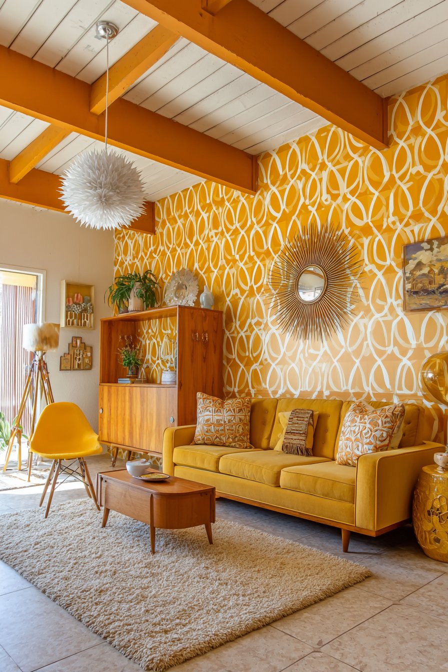 The low-profile sofa features tapered wooden legs and mustard yellow fabric upholstery—a color choice that exemplifies the bold yet sophisticated palette favored during this design era. The legs, angled outward in characteristic mid-century fashion, create visual lightness despite the sofa’s solid construction. Geometric patterns appear throughout in throw pillows and area rug, their angular forms and retro color combinations adding visual energy.