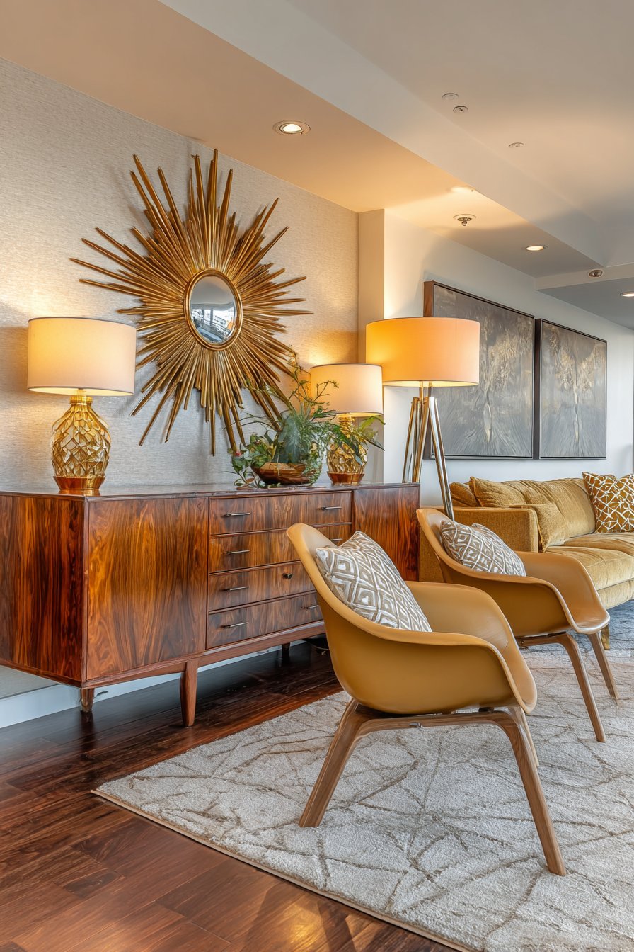 A sunburst mirror adorns the wall as both functional reflective surface and iconic decorative element, its radiating design capturing the optimism and forward-looking spirit of the atomic age. Period-appropriate lighting fixtures include a tripod floor lamp that provides both illumination and sculptural presence, its three-legged base and simple shade embodying mid-century design principles of form and function in harmony.