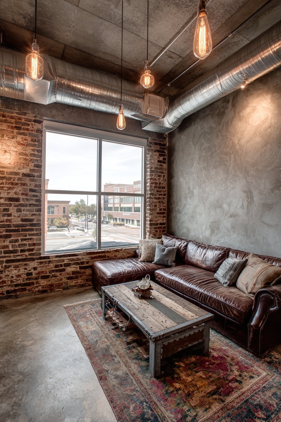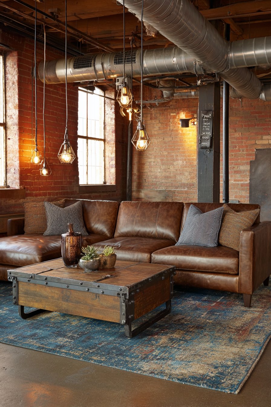 Raw materials and urban aesthetics converge in this industrial sitting room that celebrates the beauty of exposed structure and utilitarian design. A leather sofa with visible metal frame exemplifies industrial style’s appreciation for honest construction and durable materials. The exposed brick accent wall provides textural richness and historical character, its varied tones and mortar patterns adding visual interest that machine-made materials cannot replicate.